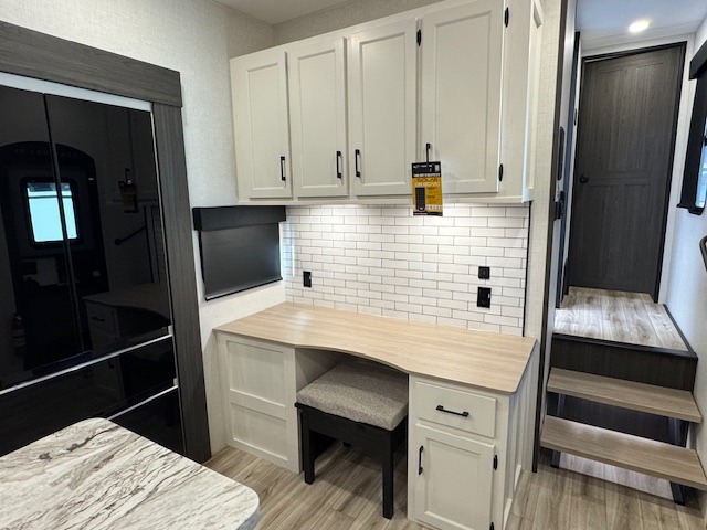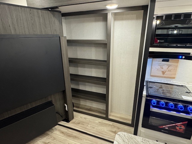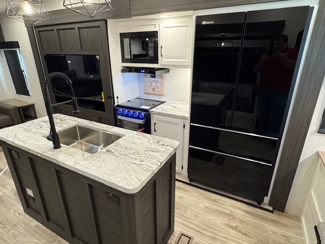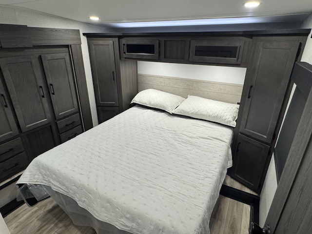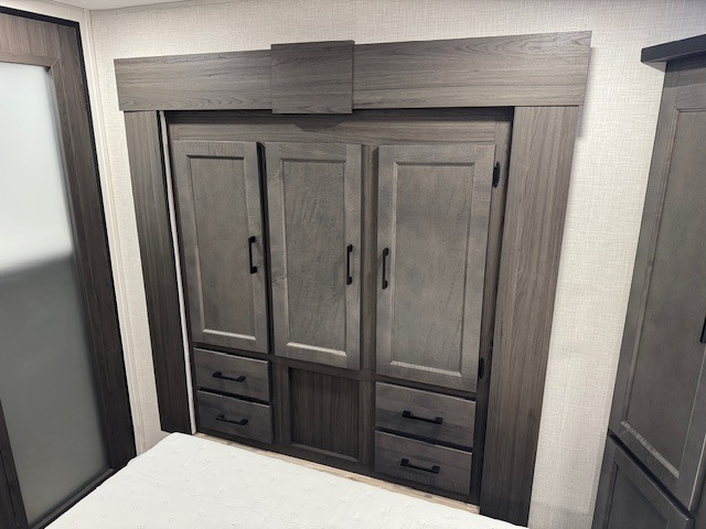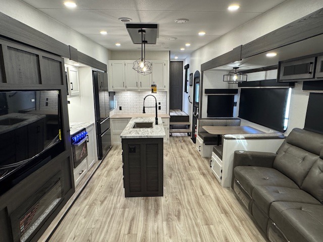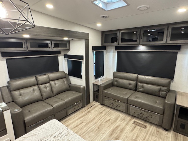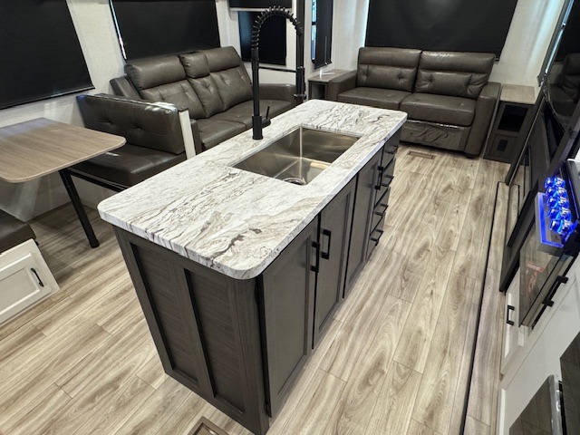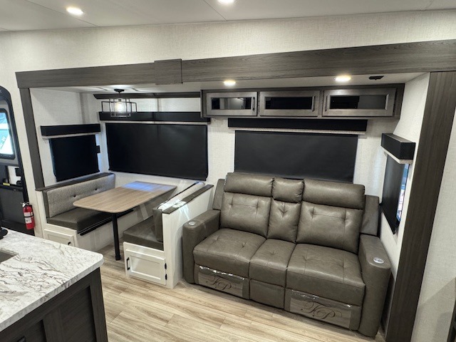At the front of the fifth wheel, you’ll find a private bedroom designed for rest and relaxation, featuring a 60" x 80" Sleep Tight queen bed and a spacious slide-out wardrobe, with additional wardrobes on each side for all your clothing and essentials. Down the hall, the full bathroom offers residential comfort with a 30" x 36" shower with glass slider door, a porcelain foot-flush toilet, and an oval stainless-steel sink. In the center and rear, the open living and kitchen area features dual opposing slides for generous floor space. The fully equipped kitchen includes a pantry, three-burner range with flush-mount glass cover, 21" oven with air fryer, microwave, and a large 18 cu. ft. refrigerator, plus a center island with sink and added counter space. Nearby, a desk and hutch provide versatility for work or storage, while the table with chairs and Versa benches and theater seating make it easy to dine or relax. At the rear, a 70" tri-fold sofa offers the perfect spot to unwind and easily converts into extra-sleeping space when needed.