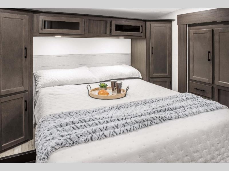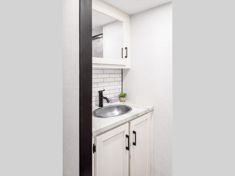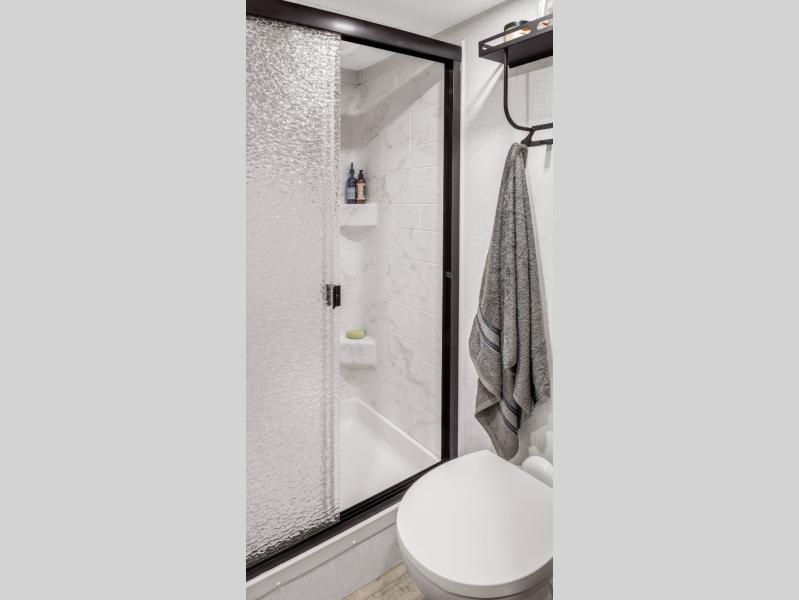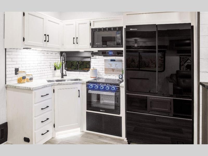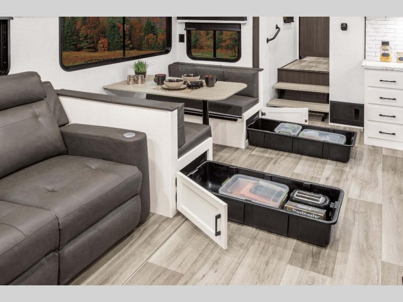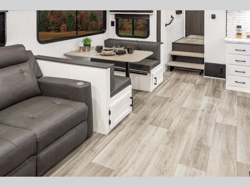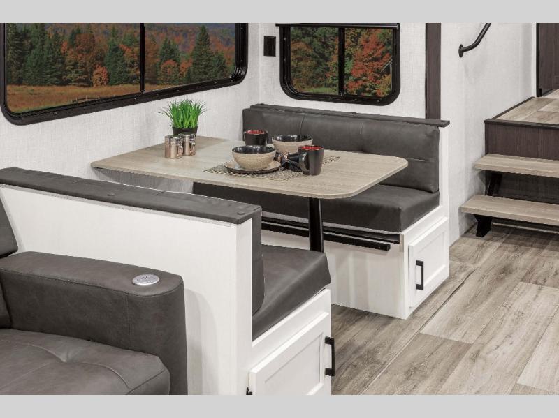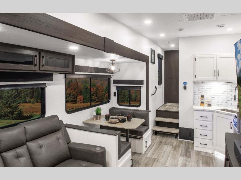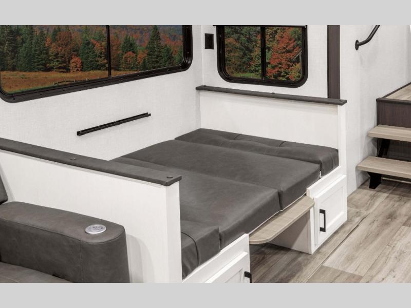 At the front of the fifth wheel, the main bedroom features a 60" x 80" Sleep Tight queen bed with a slide-out wardrobe and additional storage on each side, providing plenty of space for clothes and essentials. Down the hall, the full bathroom includes a 30" x 36" shower with a glass door, a porcelain foot-flush toilet, and a stainless-steel oval sink for a comfortable, home-like experience. The central living area offers theater seating across from a fireplace and 50" TV, plus a Sit n’ Slide table with reversible cushions for dining or games. The kitchen is equipped with a stainless-steel sink, three-burner range with glass cover, microwave, 21" oven with air fryer, and an 18-cu. ft. refrigerator. Near the entrance, a walk-in pantry with coat hooks adds versatility, while the rear bunkhouse provides extra-sleeping space with a 40" x 75" upper bunk and a 70" pull-out day bed perfect for hosting guests after a day of adventure.