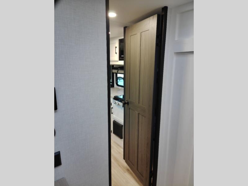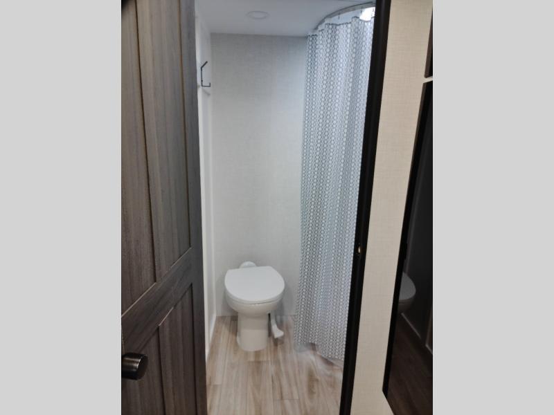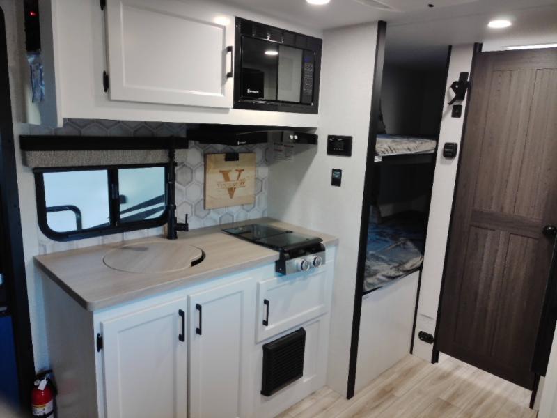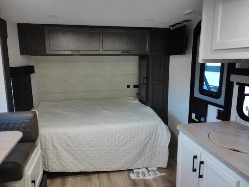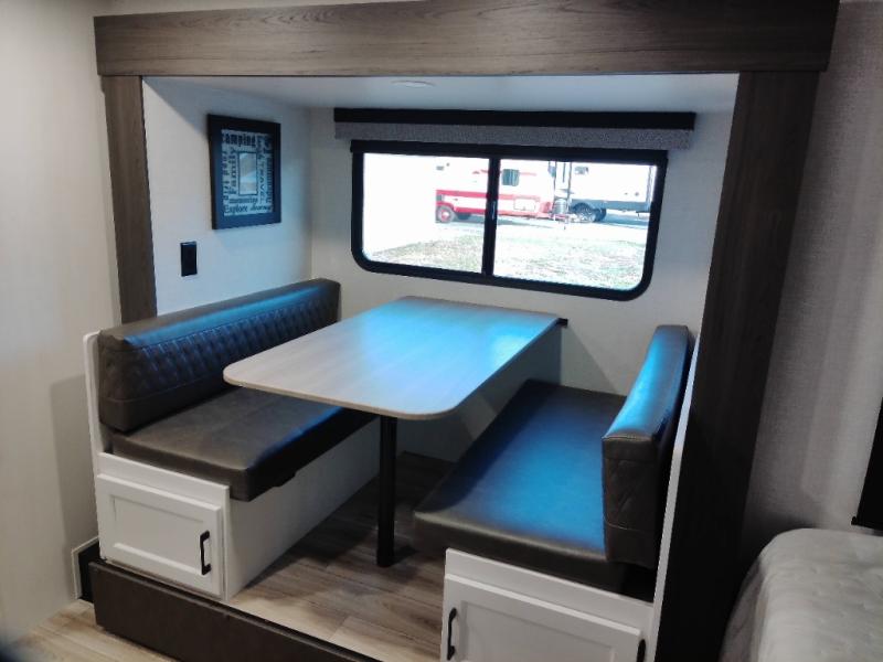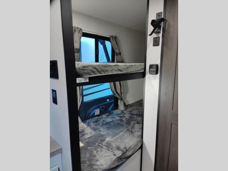 Step inside and you’re welcomed by a comfortable 60" x 75" bed positioned at the front, complete with a wardrobe at the foot of the bed and an overhead cabinet that provides ample storage for all your essentials. Moving toward the center, the kitchen area features a convenient slide-out that creates extra-living space, housing a 64" x 46" Sit N Slide dinette, perfect for meals or gathering around a board game after a day of adventure. Across from the dinette, you’ll find a microwave, a large single-bowl stainless steel undermount sink for easy meal prep, and a nearby 8 cu. ft. refrigerator to keep your groceries fresh. At the rear, the layout is thoughtfully designed with a full bathroom in one corner, featuring a 27" shower so you can skip the campground facilities, while the opposite corner offers two 28" x 74" bunks, giving the kids a cozy place to rest and recharge.