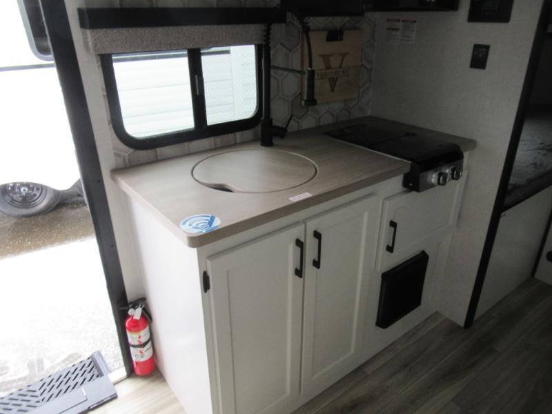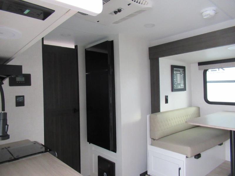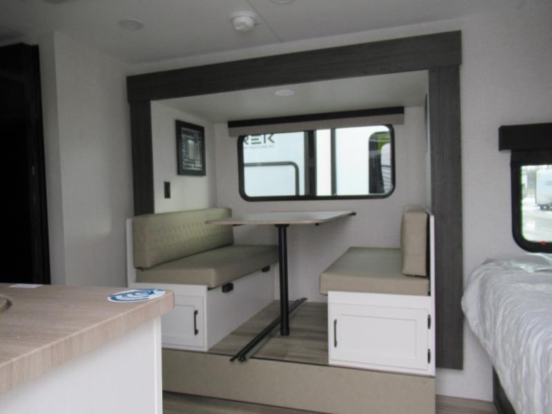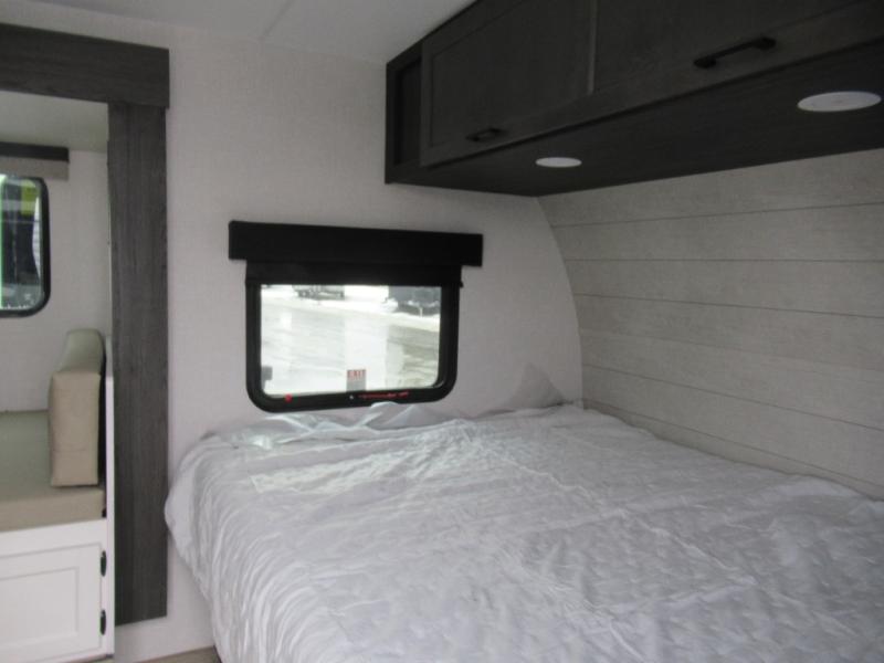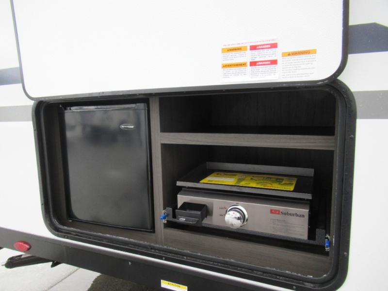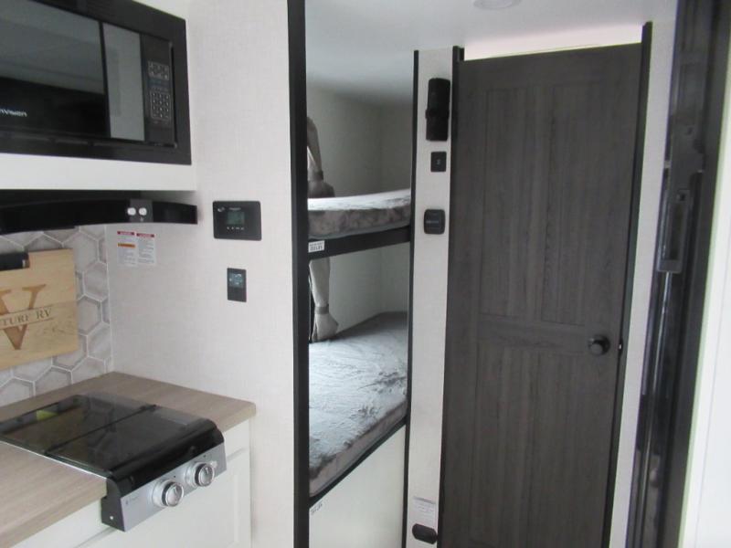 Step inside and you’re welcomed by a comfortable 60" x 75" bed positioned at the front, complete with a wardrobe at the foot of the bed and an overhead cabinet that provides ample storage for all your essentials. Moving toward the center, the kitchen area features a convenient slide-out that creates extra-living space, housing a 64" x 46" Sit N Slide dinette, perfect for meals or gathering around a board game after a day of adventure. Across from the dinette, you’ll find a microwave, a large single-bowl stainless steel undermount sink for easy meal prep, and a nearby 8 cu. ft. refrigerator to keep your groceries fresh. At the rear, the layout is thoughtfully designed with a full bathroom in one corner, featuring a 27" shower so you can skip the campground facilities, while the opposite corner offers two 28" x 74" bunks, giving the kids a cozy place to rest and recharge.