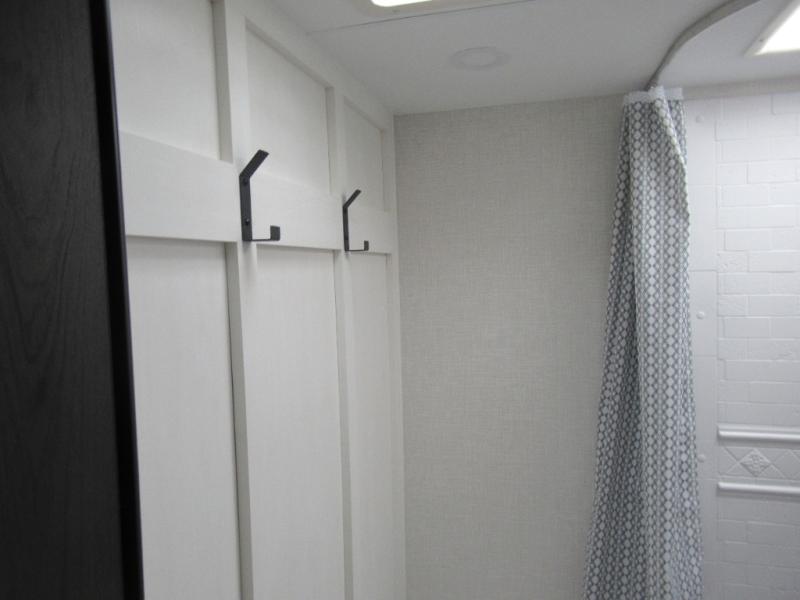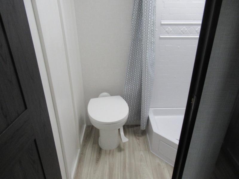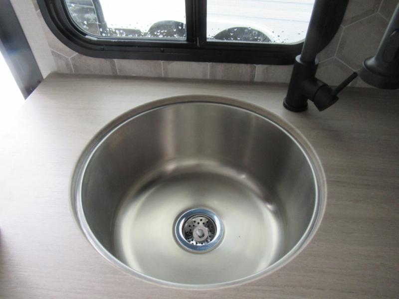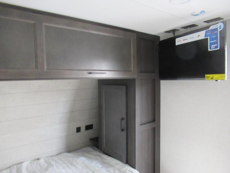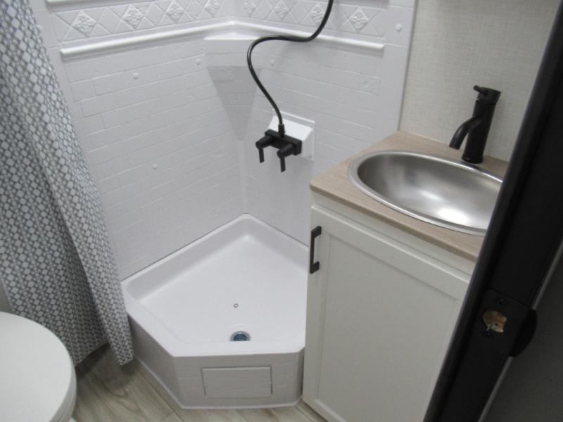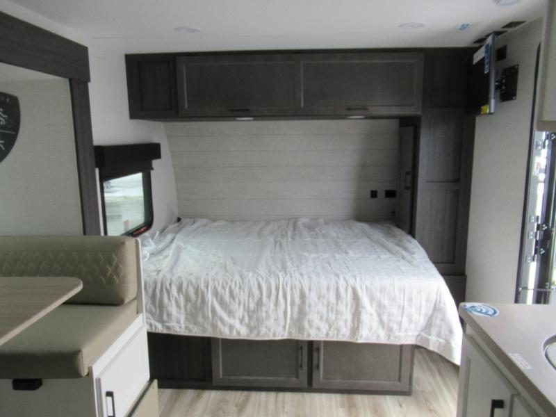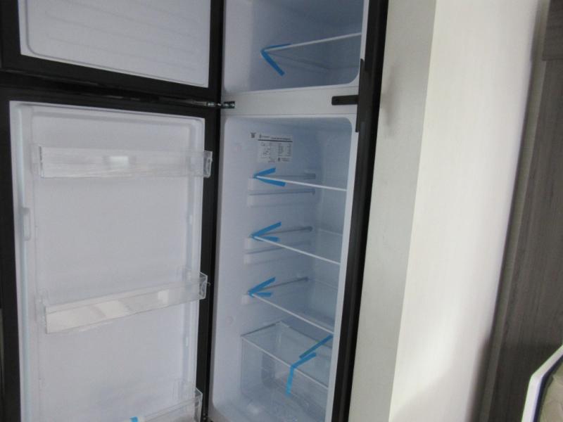 Step inside and you’re welcomed by a comfortable 60" x 75" bed positioned at the front, complete with a wardrobe at the foot of the bed and an overhead cabinet that provides ample storage for all your essentials. Moving toward the center, the kitchen area features a convenient slide-out that creates extra-living space, housing a 64" x 46" Sit N Slide dinette, perfect for meals or gathering around a board game after a day of adventure. Across from the dinette, you’ll find a microwave, a large single-bowl stainless steel undermount sink for easy meal prep, and a nearby 8 cu. ft. refrigerator to keep your groceries fresh. At the rear, the layout is thoughtfully designed with a full bathroom in one corner, featuring a 27" shower so you can skip the campground facilities, while the opposite corner offers two 28" x 74" bunks, giving the kids a cozy place to rest and recharge.