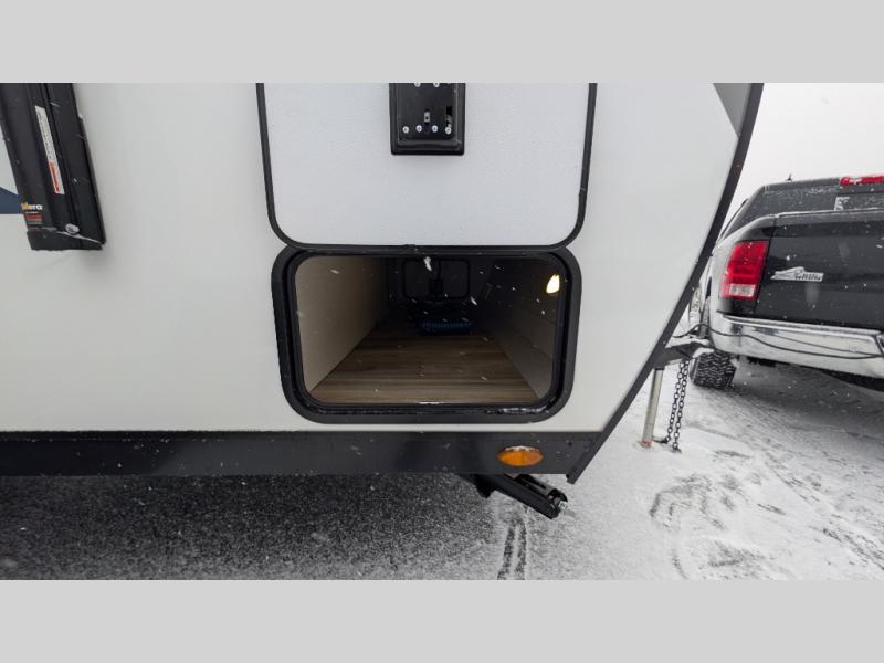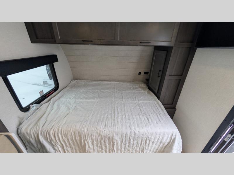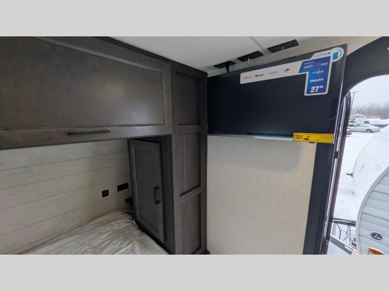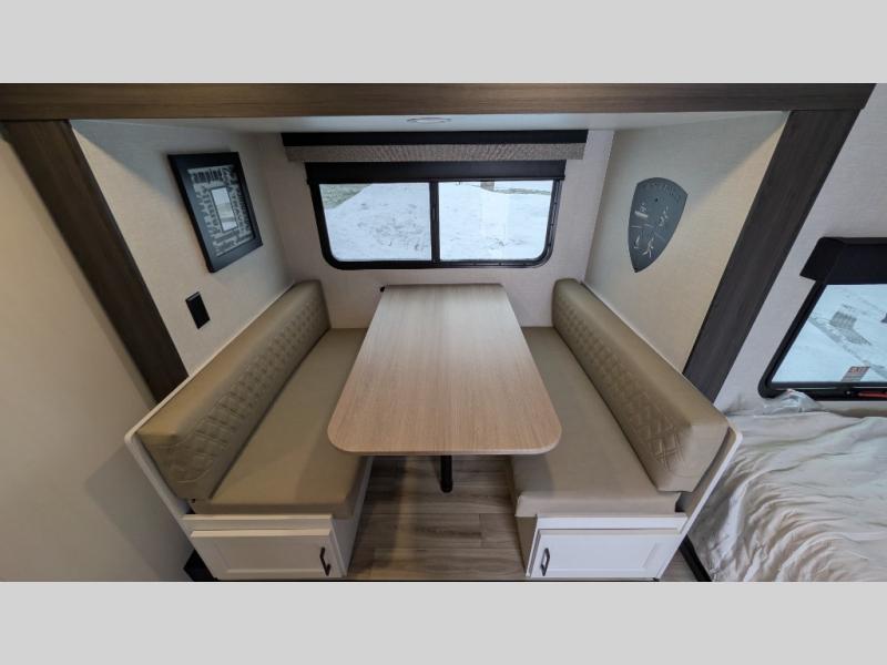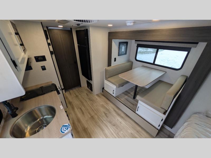 Step inside and you’re welcomed by a comfortable 60" x 75" bed positioned at the front, complete with a wardrobe at the foot of the bed and an overhead cabinet that provides ample storage for all your essentials. Moving toward the center, the kitchen area features a convenient slide-out that creates extra-living space, housing a 64" x 46" Sit N Slide dinette, perfect for meals or gathering around a board game after a day of adventure. Across from the dinette, you’ll find a microwave, a large single-bowl stainless steel undermount sink for easy meal prep, and a nearby 8 cu. ft. refrigerator to keep your groceries fresh. At the rear, the layout is thoughtfully designed with a full bathroom in one corner, featuring a 27" shower so you can skip the campground facilities, while the opposite corner offers two 28" x 74" bunks, giving the kids a cozy place to rest and recharge.