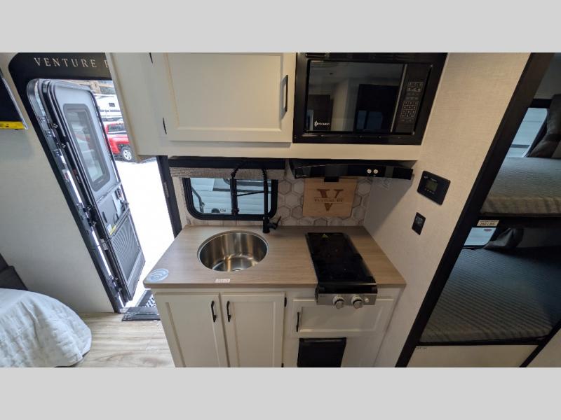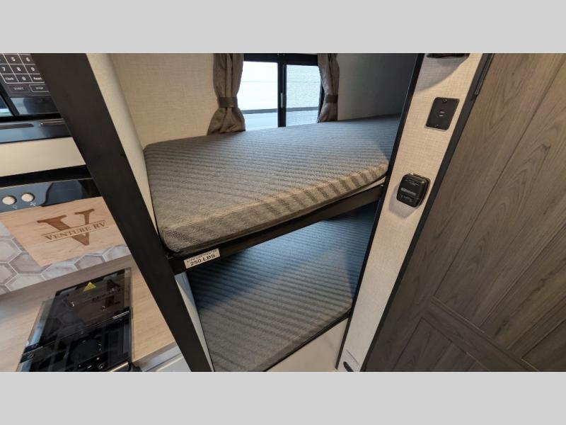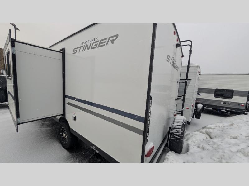 The Venture RV SportTrek Stinger Lite travel trailers are designed to elevate every journey, this model blends comfort, innovation, and durability in one refined package. Enjoy endless hot water with the tankless water heater, ensuring comfort no matter how long the adventure lasts. Inside, the modern farmhouse interior design with hardwood cabinet doors creates a warm, residential feel that’s both stylish and inviting. The 12V 8 cu. ft. refrigerator provides plenty of storage space for all your fresh foods, so you can enjoy homemade meals on the go without worrying about running out of space. Built to last, the Azdel laminated sidewalls add strength, moisture resistance, and reliability, giving you confidence wherever the road takes you.