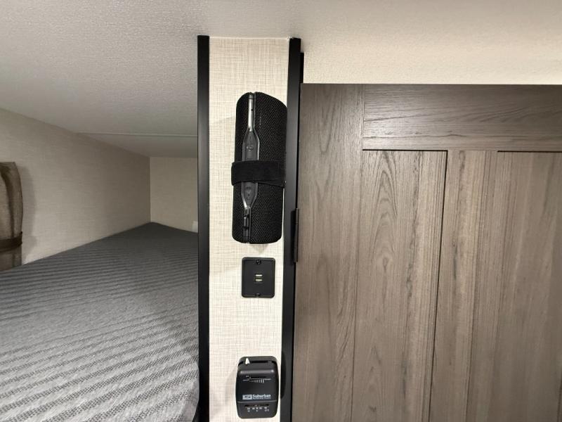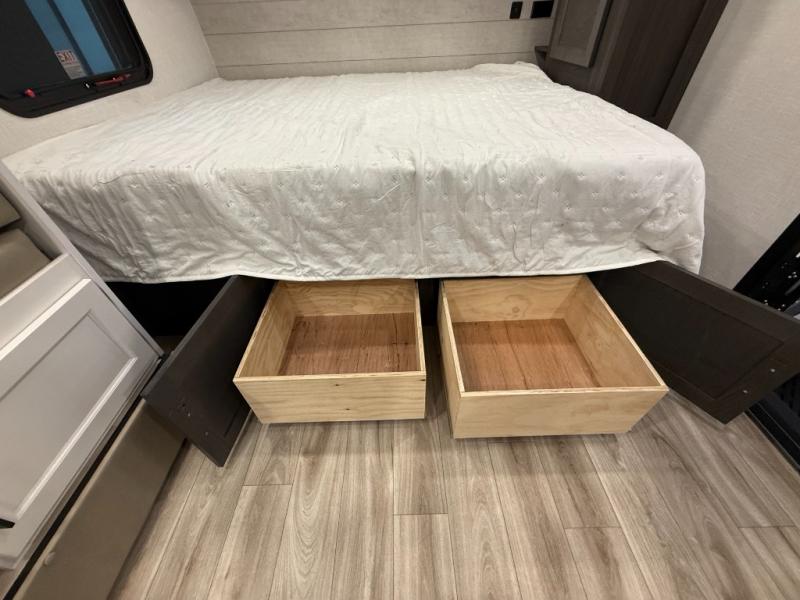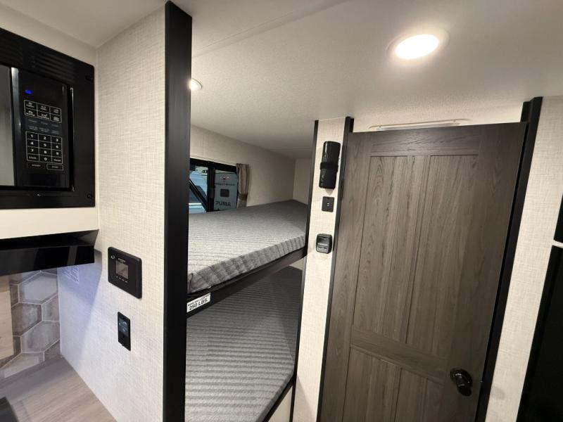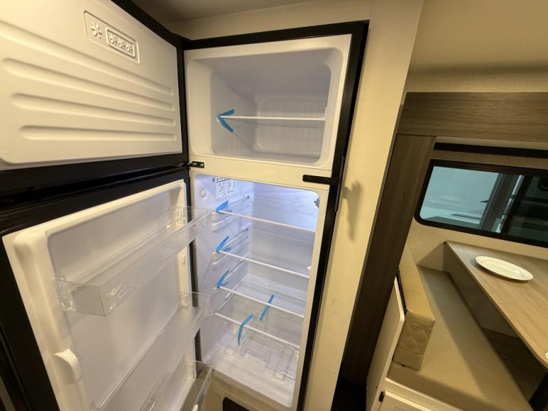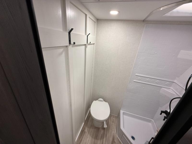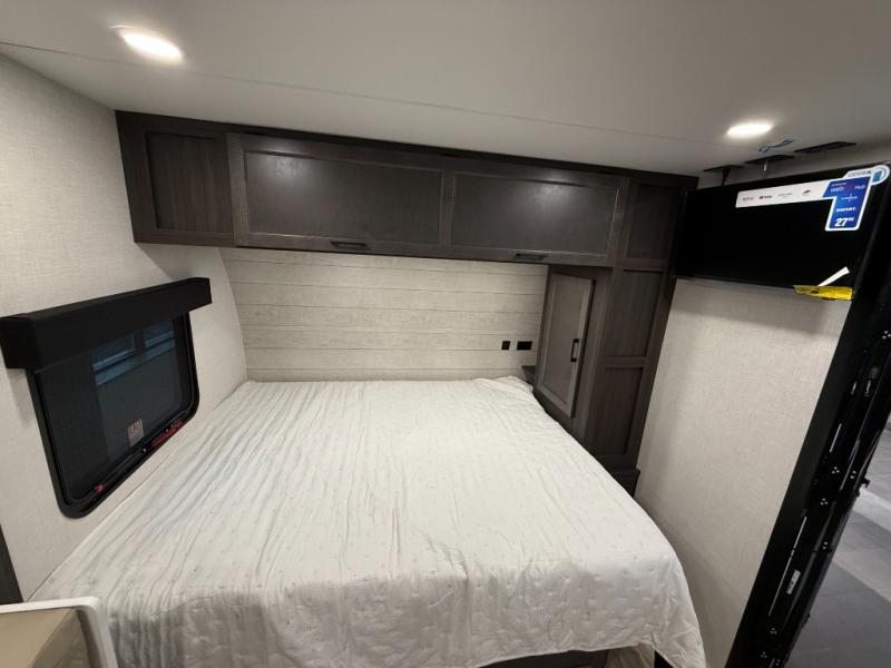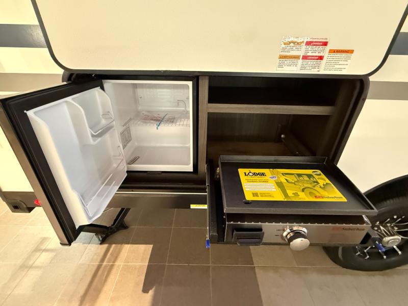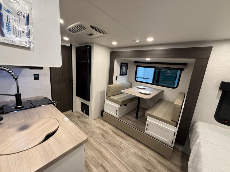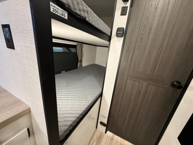 Step inside and you’re welcomed by a comfortable 60" x 75" bed positioned at the front, complete with a wardrobe at the foot of the bed and an overhead cabinet that provides ample storage for all your essentials. Moving toward the center, the kitchen area features a convenient slide-out that creates extra-living space, housing a 64" x 46" Sit N Slide dinette, perfect for meals or gathering around a board game after a day of adventure. Across from the dinette, you’ll find a microwave, a large single-bowl stainless steel undermount sink for easy meal prep, and a nearby 8 cu. ft. refrigerator to keep your groceries fresh. At the rear, the layout is thoughtfully designed with a full bathroom in one corner, featuring a 27" shower so you can skip the campground facilities, while the opposite corner offers two 28" x 74" bunks, giving the kids a cozy place to rest and recharge.