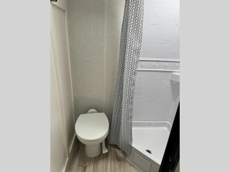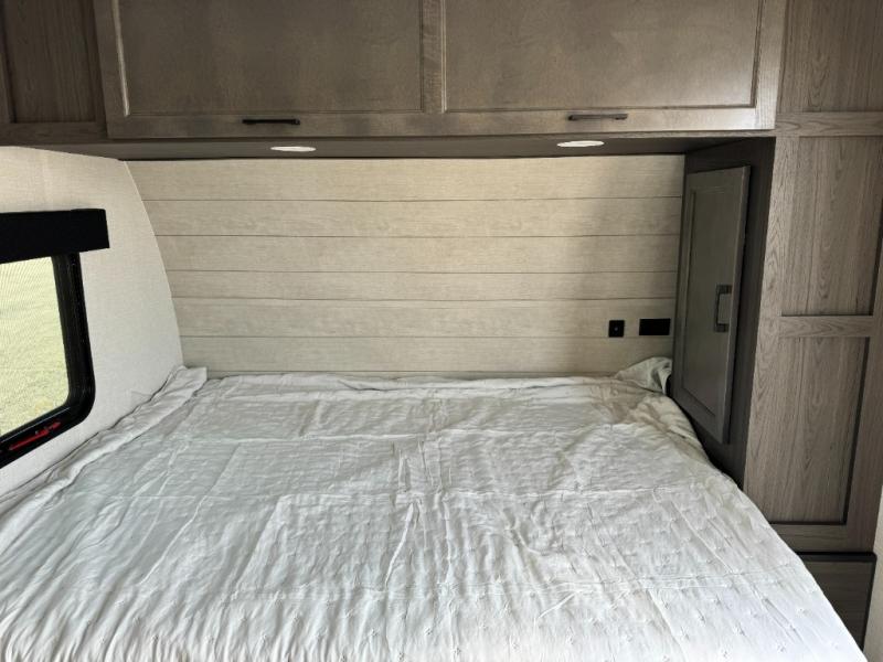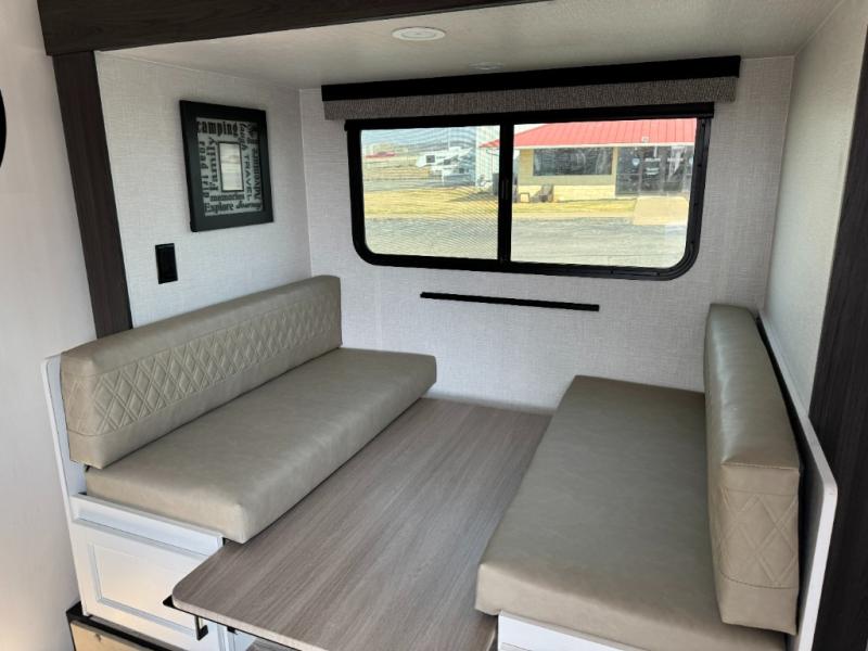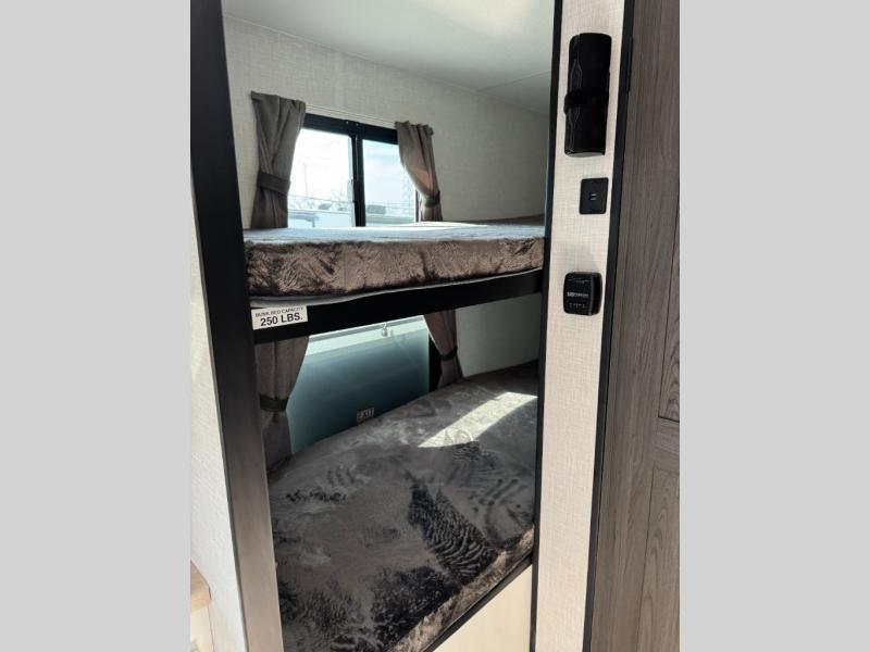 Step inside and you’re welcomed by a comfortable 60" x 75" bed positioned at the front, complete with a wardrobe at the foot of the bed and an overhead cabinet that provides ample storage for all your essentials. Moving toward the center, the kitchen area features a convenient slide-out that creates extra-living space, housing a 64" x 46" Sit N Slide dinette, perfect for meals or gathering around a board game after a day of adventure. Across from the dinette, you’ll find a microwave, a large single-bowl stainless steel undermount sink for easy meal prep, and a nearby 8 cu. ft. refrigerator to keep your groceries fresh. At the rear, the layout is thoughtfully designed with a full bathroom in one corner, featuring a 27" shower so you can skip the campground facilities, while the opposite corner offers two 28" x 74" bunks, giving the kids a cozy place to rest and recharge.
