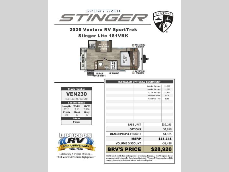 New 2026 Venture RV SportTrek Stinger Lite STS181VRK Travel Trailer
