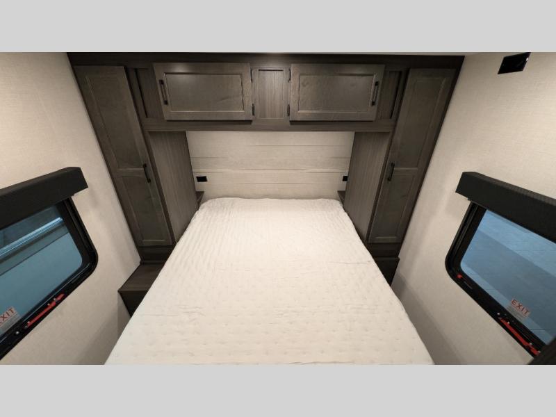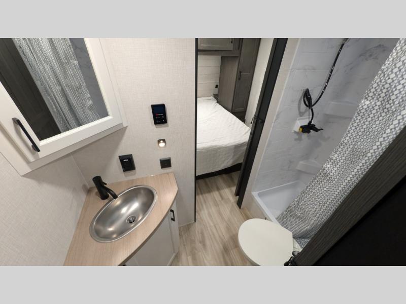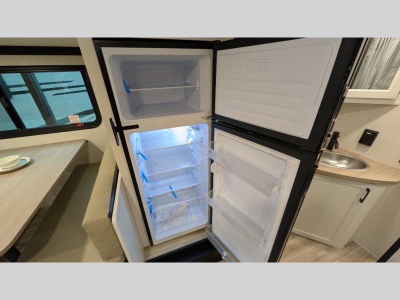This trailer offers a smart and comfortable layout designed for relaxation and convenience. At the front, the private bedroom features a 60" x 75" bed for a restful night’s sleep, with wardrobes on each side for clothing storage and an overhead cabinet for added space. Moving down the hall, the pass-through bathroom includes a spacious 30" x 36" shower and a linen shelf to keep toiletries organized. Toward the rear, the living and kitchen area opens up with a slide-out that houses a 64" x 46" Sit N Slide dinette, perfect for dining, playing board games, or converting into extra sleeping space at night. Nearby, the 8 cu. ft. refrigerator provides ample room for groceries and drinks. Across from the dinette, the L-shaped kitchen offers generous counter space, a three-burner cooktop, a microwave, and plenty of overhead cabinets for storage. At the rear, there is also the option to add theater seating, creating a comfortable spot to relax and enjoy your downtime.