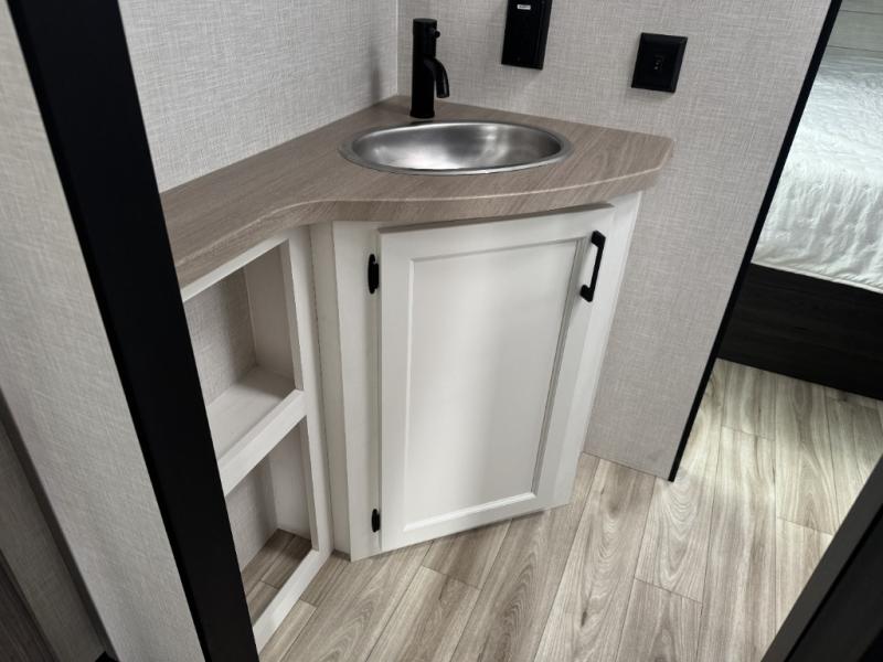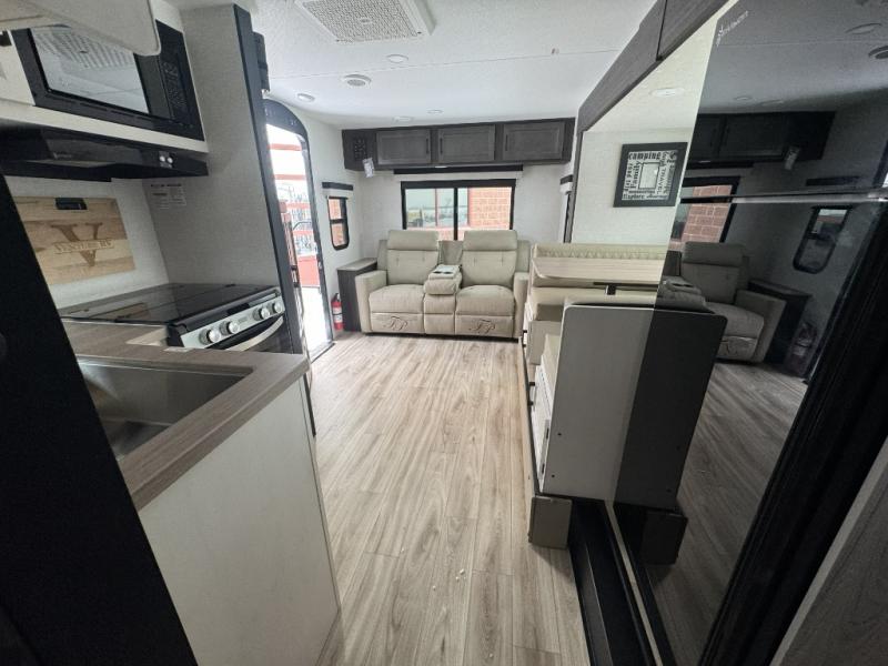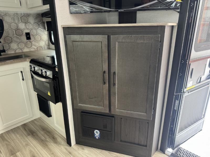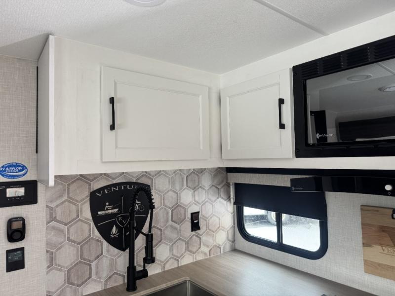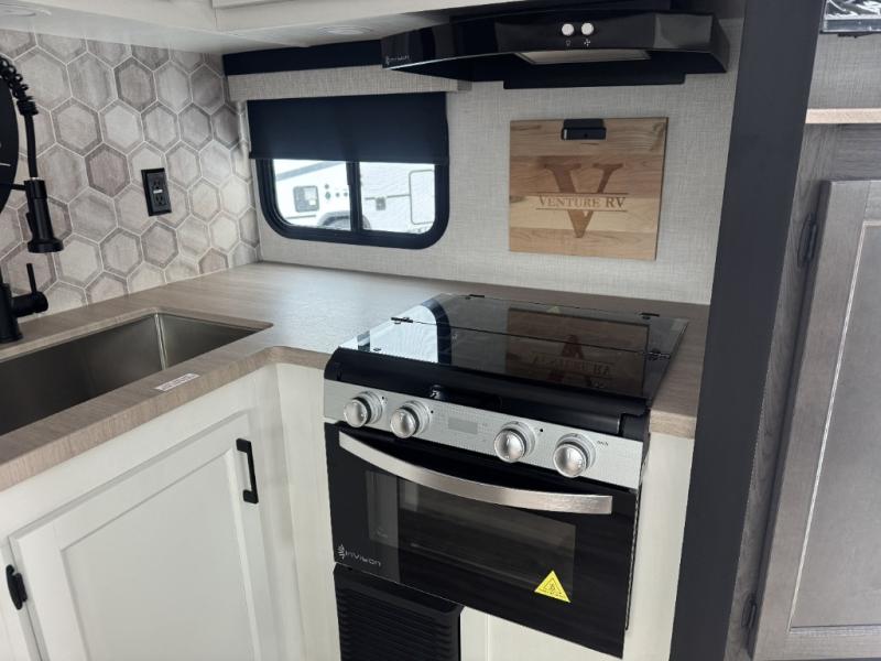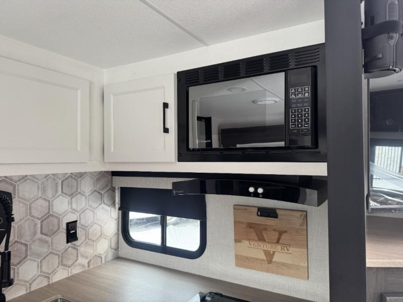 The Venture RV SportTrek Stinger travel trailers are built for both functionality and style, offering top-tier features for your comfort. With 3-sided double insulation, including radiant foil in the roof, floor, and front wall, you'll enjoy the climate control. The large pantry and extra cabinet storage ensure you have plenty of space for all your essentials, while the 12V 8 cu. ft. refrigerator keeps your groceries fresh on the road. For safety and ease, the trailer includes Dexter axles with self-adjusting brakes and a prewired tire monitor system, giving you peace of mind while you travel. Plus, the modern farmhouse interior design, featuring hardwood cabinet doors and a beautiful wooden hexagon backsplash, makes every meal and moment feel special.