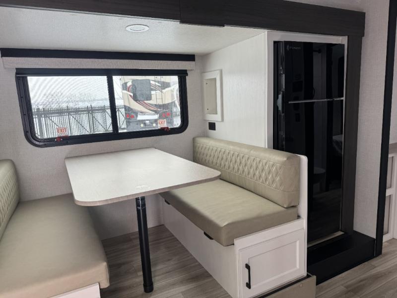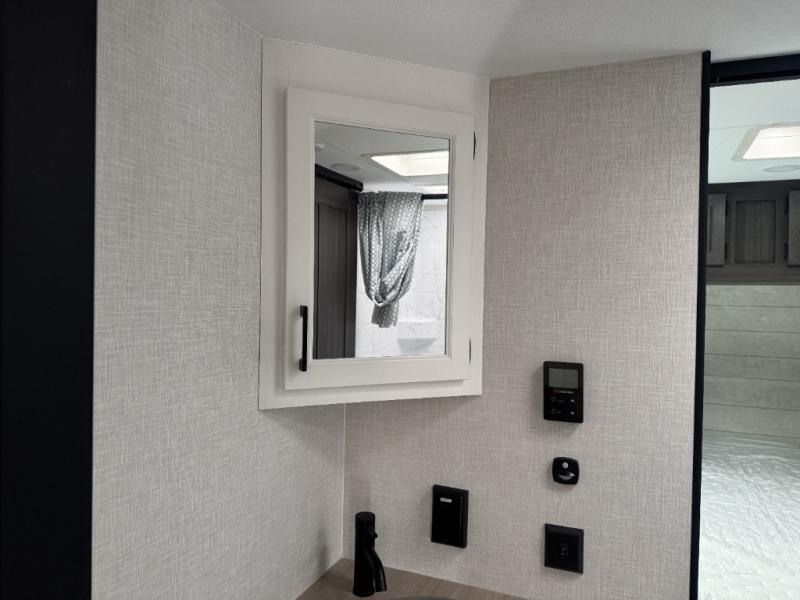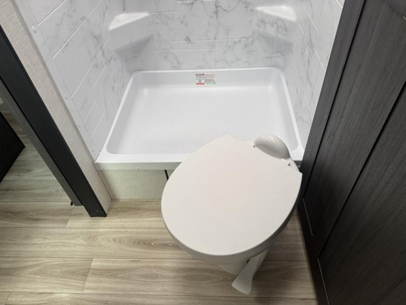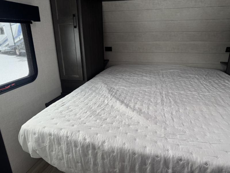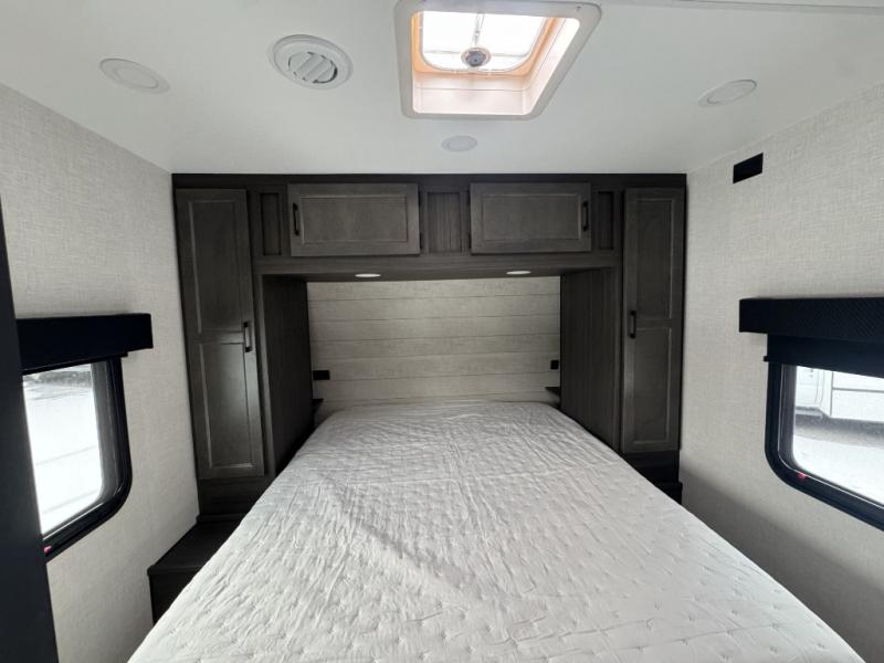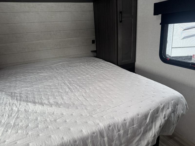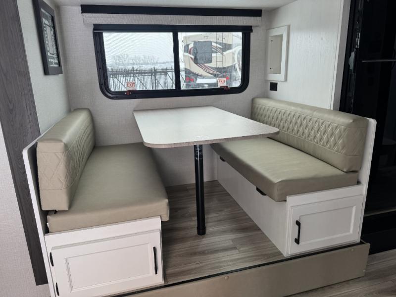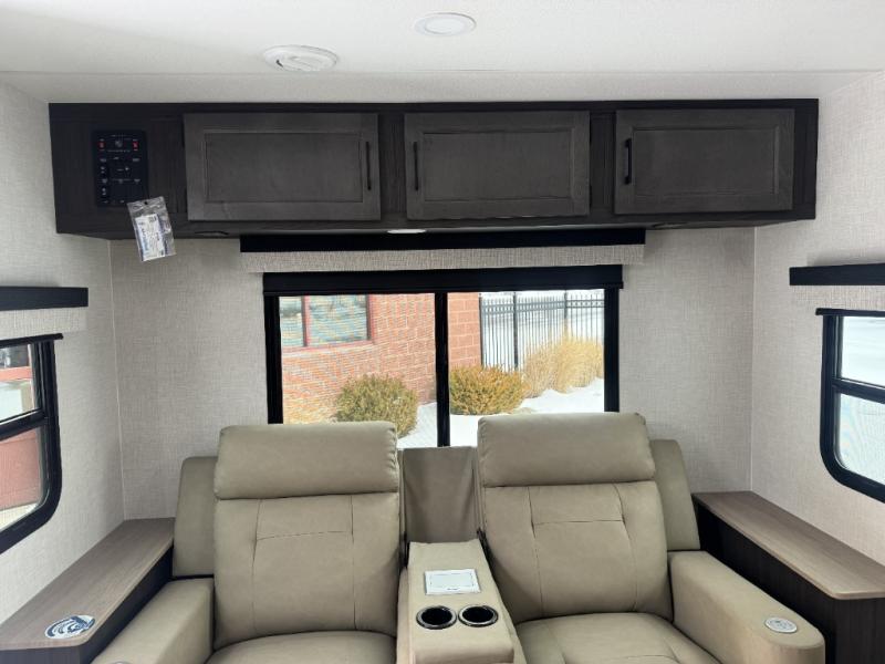 This trailer offers a smart and comfortable layout designed for relaxation and convenience. At the front, the private bedroom features a 60" x 75" bed for a restful night’s sleep, with wardrobes on each side for clothing storage and an overhead cabinet for added space. Moving down the hall, the pass-through bathroom includes a spacious 30" x 36" shower and a linen shelf to keep toiletries organized. Toward the rear, the living and kitchen area opens up with a slide-out that houses a 64" x 46" Sit N Slide dinette, perfect for dining, playing board games, or converting into extra sleeping space at night. Nearby, the 8 cu. ft. refrigerator provides ample room for groceries and drinks. Across from the dinette, the L-shaped kitchen offers generous counter space, a three-burner cooktop, a microwave, and plenty of overhead cabinets for storage. At the rear, there is also the option to add theater seating, creating a comfortable spot to relax and enjoy your downtime.