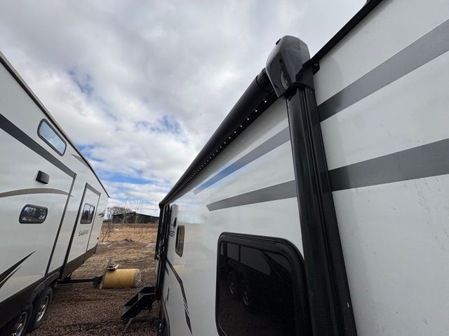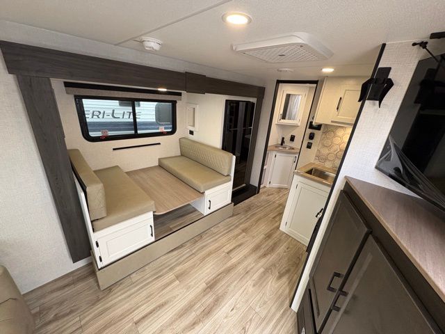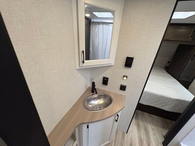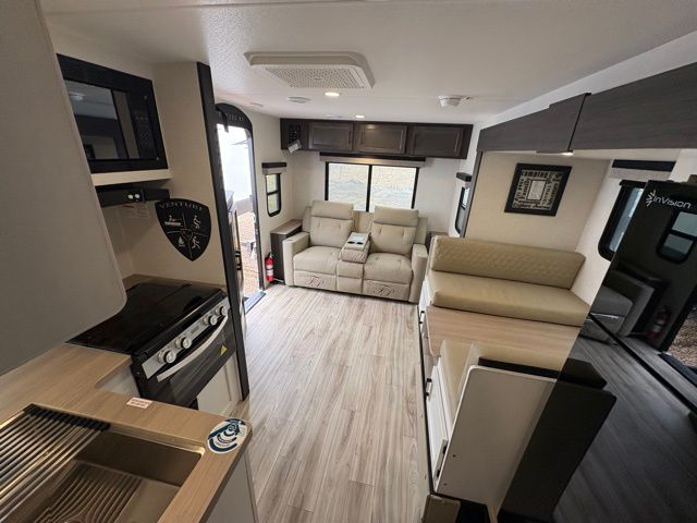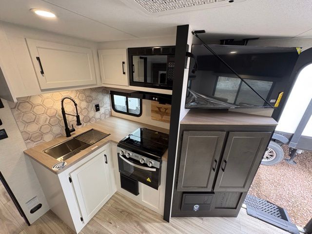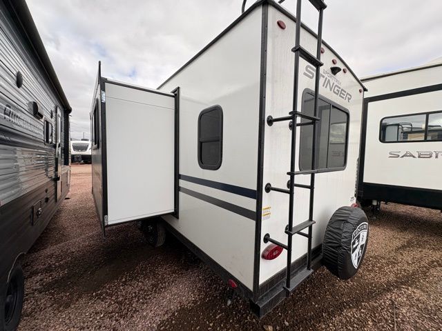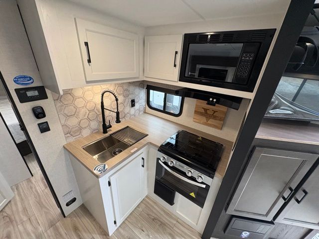 The Venture RV SportTrek Stinger travel trailers are built for both functionality and style, offering top-tier features for your comfort. With 3-sided double insulation, including radiant foil in the roof, floor, and front wall, you'll enjoy the climate control. The large pantry and extra cabinet storage ensure you have plenty of space for all your essentials, while the 12V 8 cu. ft. refrigerator keeps your groceries fresh on the road. For safety and ease, the trailer includes Dexter axles with self-adjusting brakes and a prewired tire monitor system, giving you peace of mind while you travel. Plus, the modern farmhouse interior design, featuring hardwood cabinet doors and a beautiful wooden hexagon backsplash, makes every meal and moment feel special.