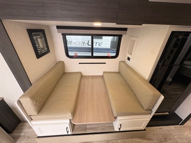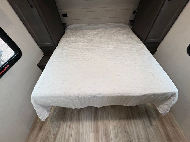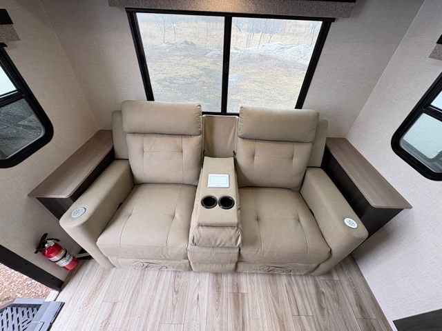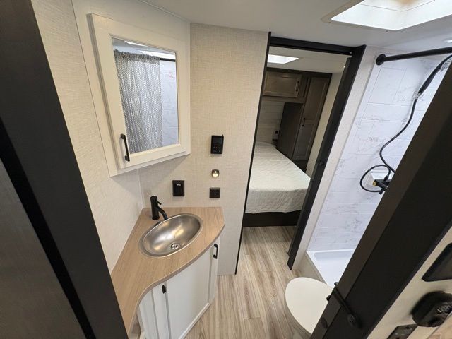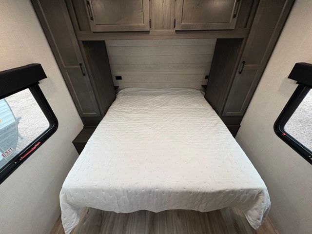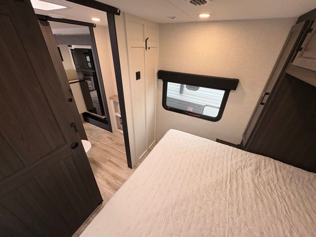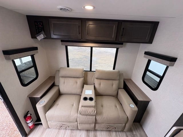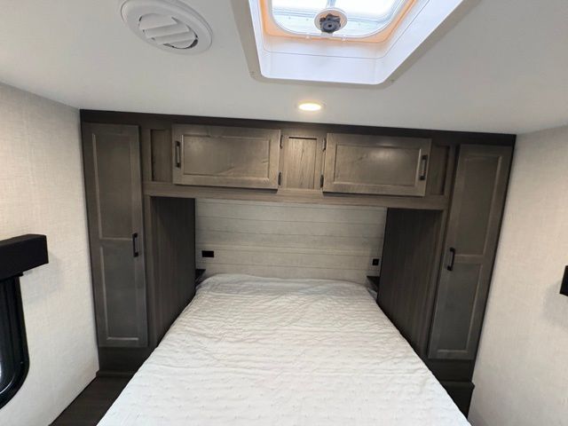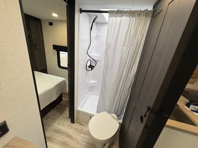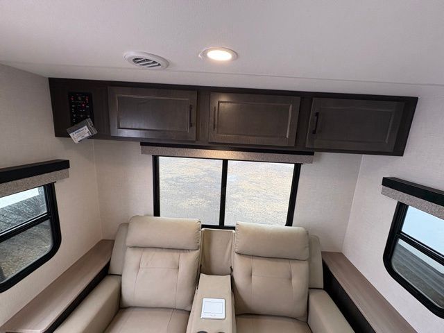 This trailer offers a smart and comfortable layout designed for relaxation and convenience. At the front, the private bedroom features a 60" x 75" bed for a restful night’s sleep, with wardrobes on each side for clothing storage and an overhead cabinet for added space. Moving down the hall, the pass-through bathroom includes a spacious 30" x 36" shower and a linen shelf to keep toiletries organized. Toward the rear, the living and kitchen area opens up with a slide-out that houses a 64" x 46" Sit N Slide dinette, perfect for dining, playing board games, or converting into extra sleeping space at night. Nearby, the 8 cu. ft. refrigerator provides ample room for groceries and drinks. Across from the dinette, the L-shaped kitchen offers generous counter space, a three-burner cooktop, a microwave, and plenty of overhead cabinets for storage. At the rear, there is also the option to add theater seating, creating a comfortable spot to relax and enjoy your downtime.