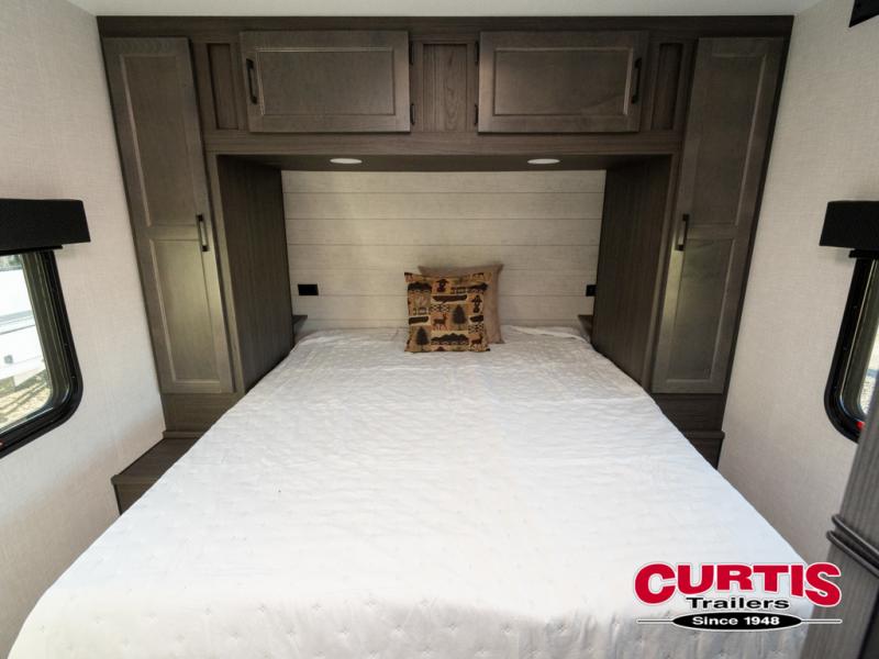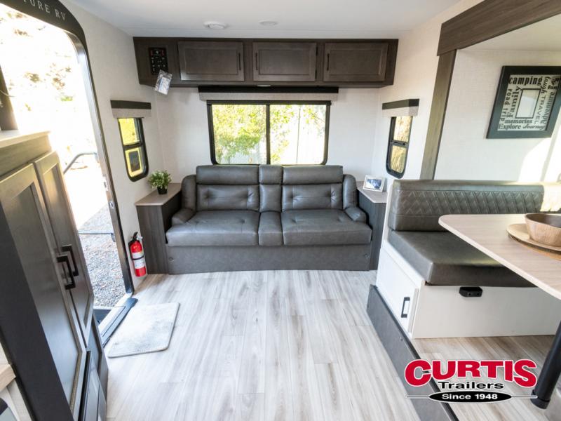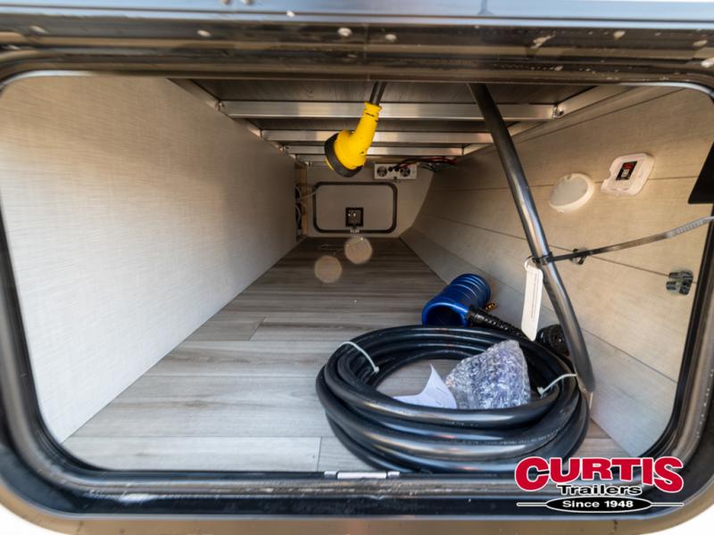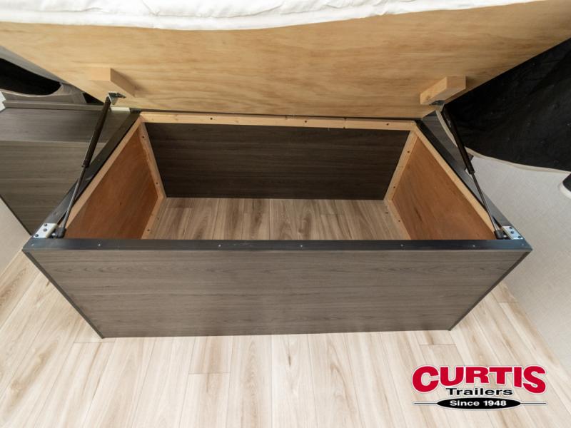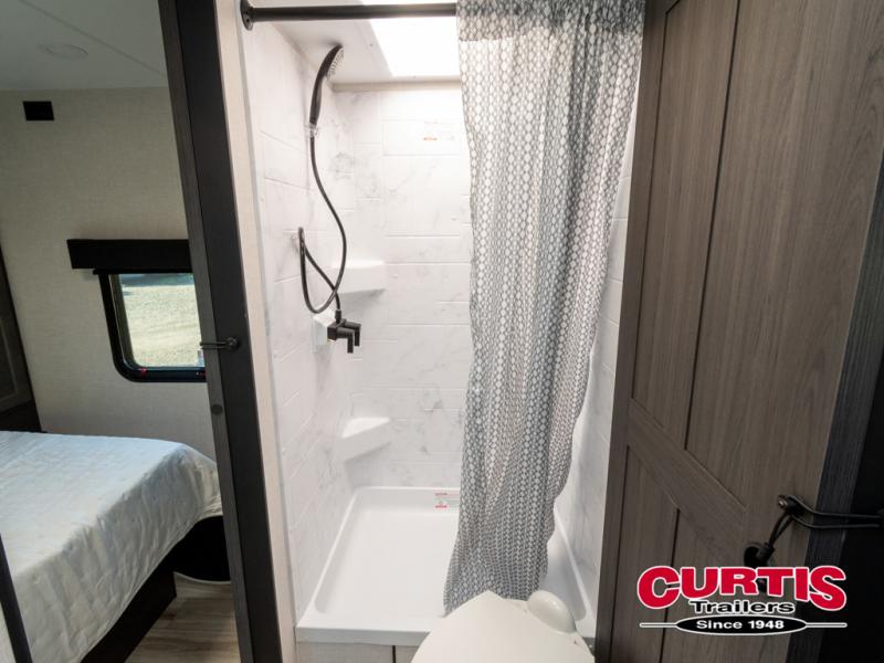 This trailer offers a smart and comfortable layout designed for relaxation and convenience. At the front, the private bedroom features a 60" x 75" bed for a restful night’s sleep, with wardrobes on each side for clothing storage and an overhead cabinet for added space. Moving down the hall, the pass-through bathroom includes a spacious 30" x 36" shower and a linen shelf to keep toiletries organized. Toward the rear, the living and kitchen area opens up with a slide-out that houses a 64" x 46" Sit N Slide dinette, perfect for dining, playing board games, or converting into extra sleeping space at night. Nearby, the 8 cu. ft. refrigerator provides ample room for groceries and drinks. Across from the dinette, the L-shaped kitchen offers generous counter space, a three-burner cooktop, a microwave, and plenty of overhead cabinets for storage. At the rear, there is also the option to add theater seating, creating a comfortable spot to relax and enjoy your downtime.