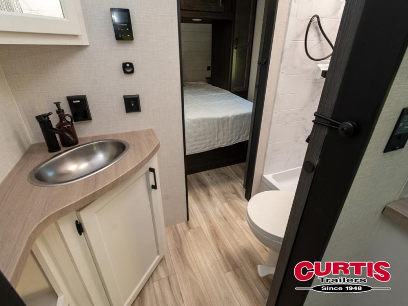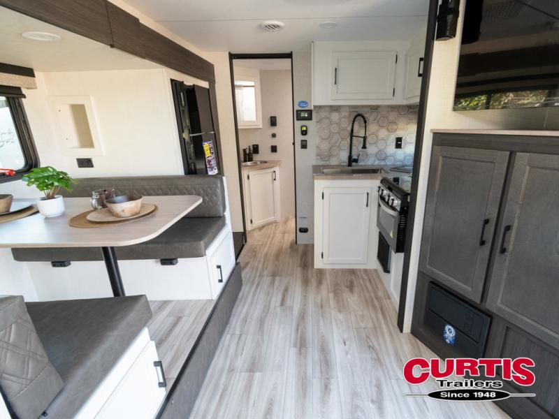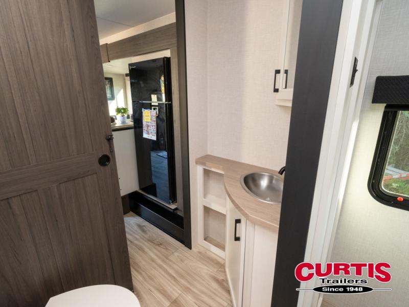 The Venture RV SportTrek Stinger travel trailers are built for both functionality and style, offering top-tier features for your comfort. With 3-sided double insulation, including radiant foil in the roof, floor, and front wall, you'll enjoy the climate control. The large pantry and extra cabinet storage ensure you have plenty of space for all your essentials, while the 12V 8 cu. ft. refrigerator keeps your groceries fresh on the road. For safety and ease, the trailer includes Dexter axles with self-adjusting brakes and a prewired tire monitor system, giving you peace of mind while you travel. Plus, the modern farmhouse interior design, featuring hardwood cabinet doors and a beautiful wooden hexagon backsplash, makes every meal and moment feel special.