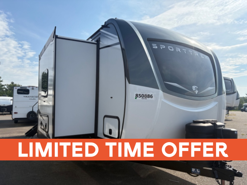 An elegant design and new features come with every one of these Venture RV SportTrek Touring Edition travel trailers! The NXG Huck bolt frame holds these units together and a walkable roof covers them. Heads will turn down the highway and at the campsite with an upgraded graphics package and a painted fiberglass front cap with integrated LED light. The exterior pass-through storage area has slam latch baggage doors with magnetic catches so you don't have to worry about them closing on you and a motion activated light to see your items clearly even at night. Luxury abounds throughout these units, especially with the mandatory Interior Luxury package which comes with solid surface kitchen countertops, designer valances with fabric nightshades, two 30" frameless fireplaces, and Beauflor wood plank flooring that is easy to clean. Come find your favorite model today!