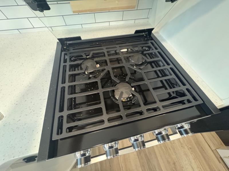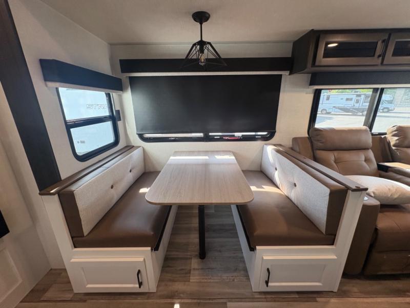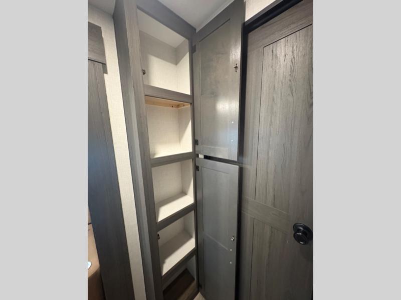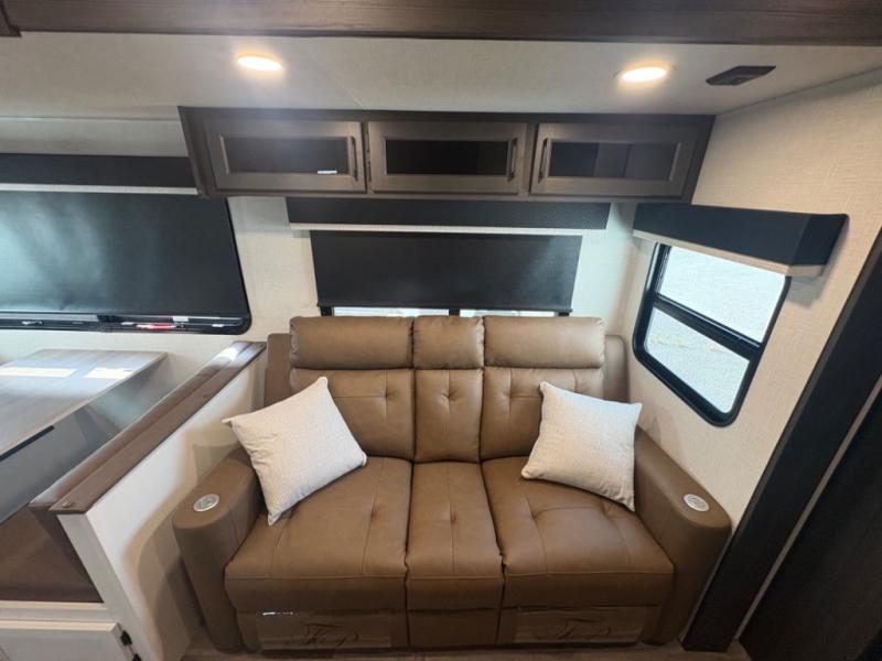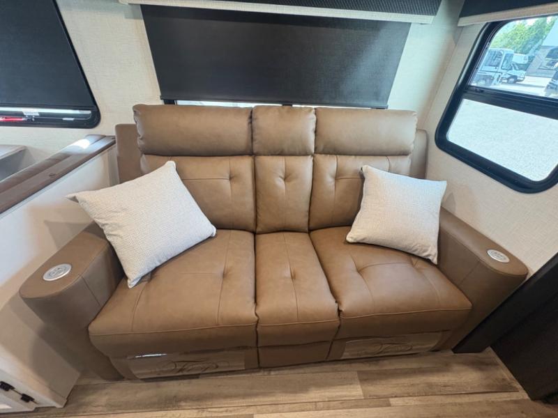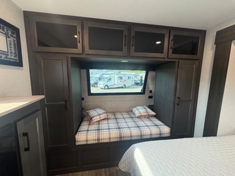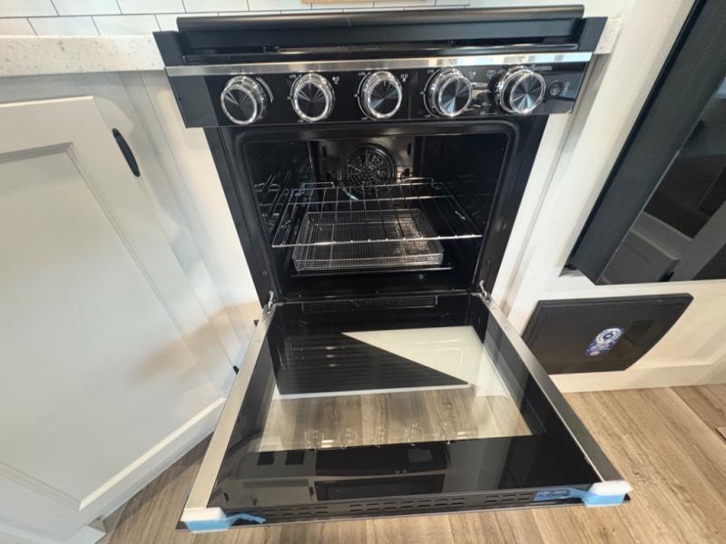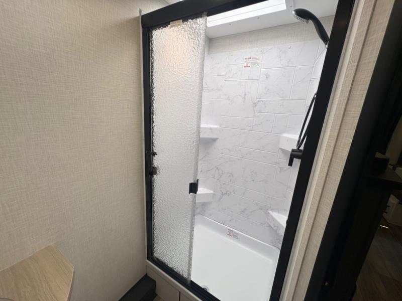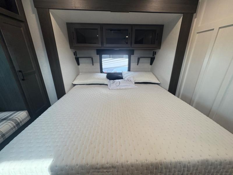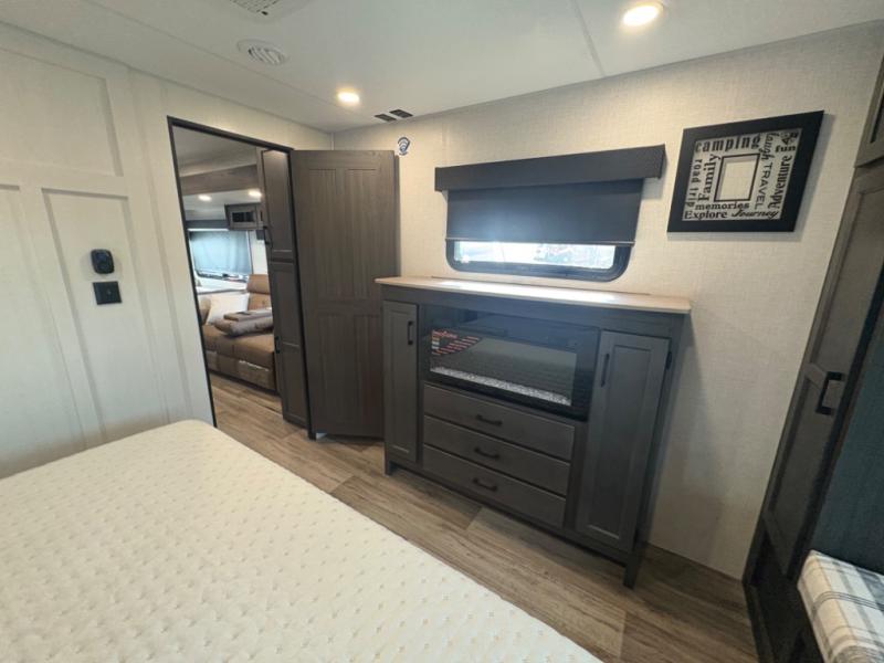 This travel trailer is perfect for two people who want to escape from everyday life! The front private bedroom has a 70" x 80" Sleep Tight king bed slide for more interior space, a dresser with a 30" frameless fireplace and TV, and a window seat to read a book with a view. Freshen up each morning in the full bathroom with the 30" x 36" shower then head to the rear kitchen to fry up some eggs on the three burner cooktop. The Sit N' Slide table offers a comfortable place to enjoy your meals, play card games, and even transform into an extra sleeping space. Grab a snack from the walk-in pantry and relax on the 70" tri-fold sofa across from the entertainment center with a 30" frameless fireplace!