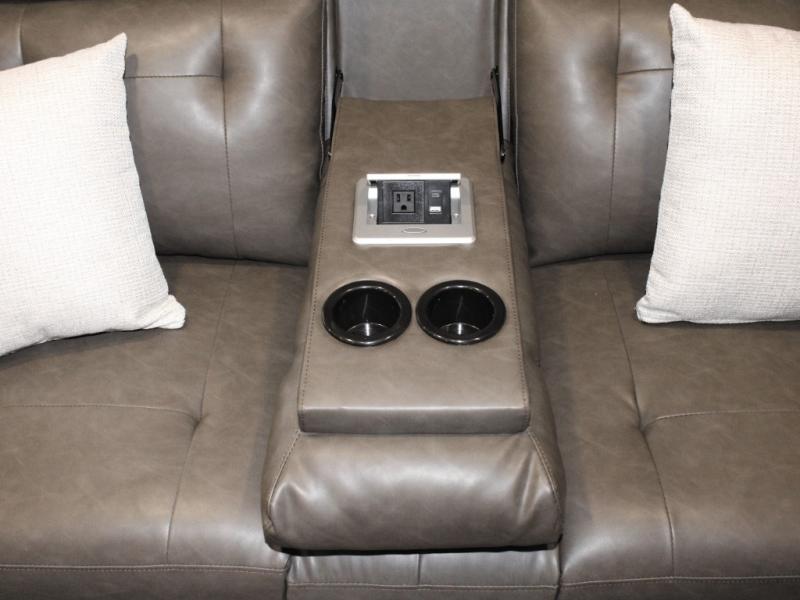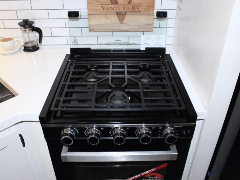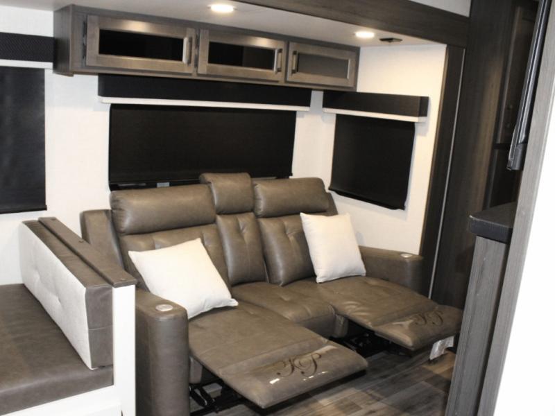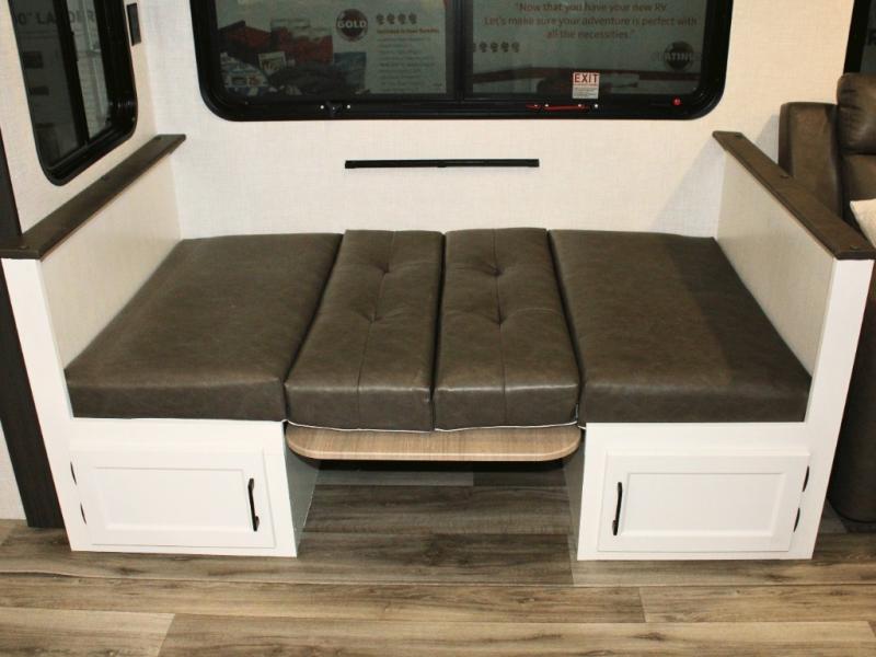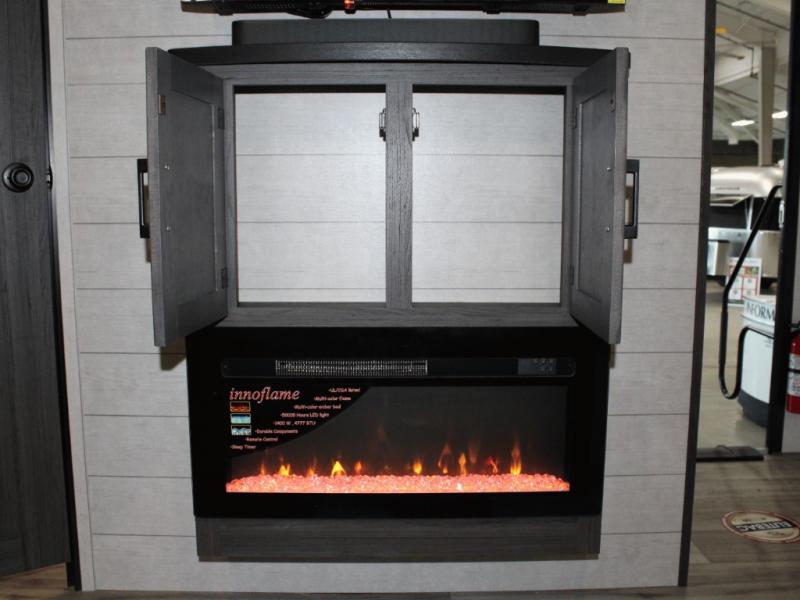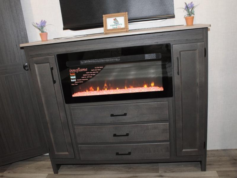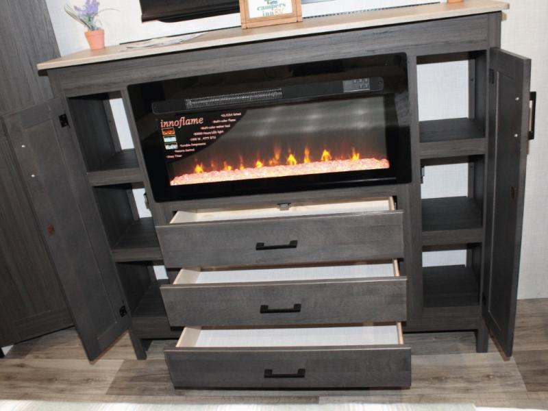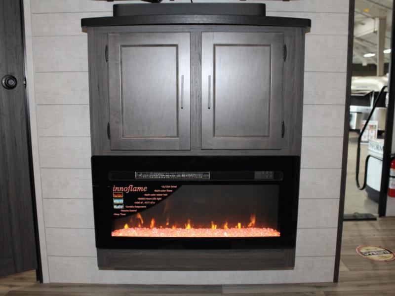 Cooking on the road has never been this enjoyable. The rear kitchen layout features solid surface countertops, a three-burner cooktop, and a walk-in pantry for all your essentials. Enjoy meals at the Sit N’ Slide dinette, which easily converts into extra sleeping space. After dinner, stretch out on the 70" tri-fold sofa across from the entertainment center and second fireplace—the perfect setup for cozy evenings in.