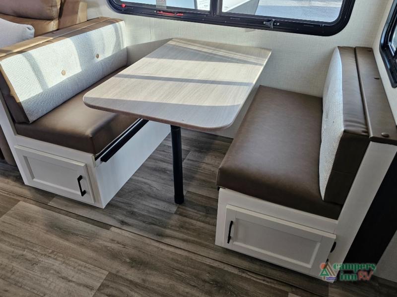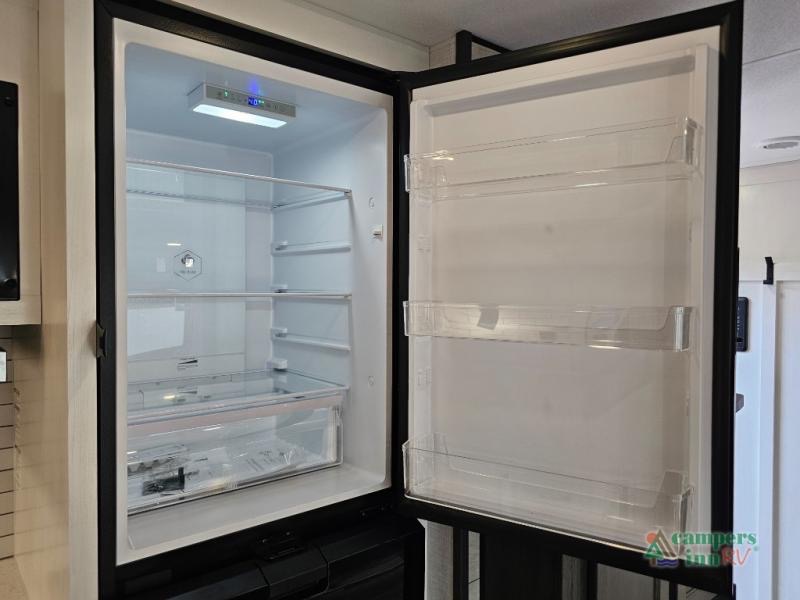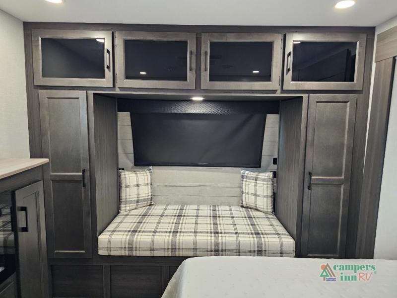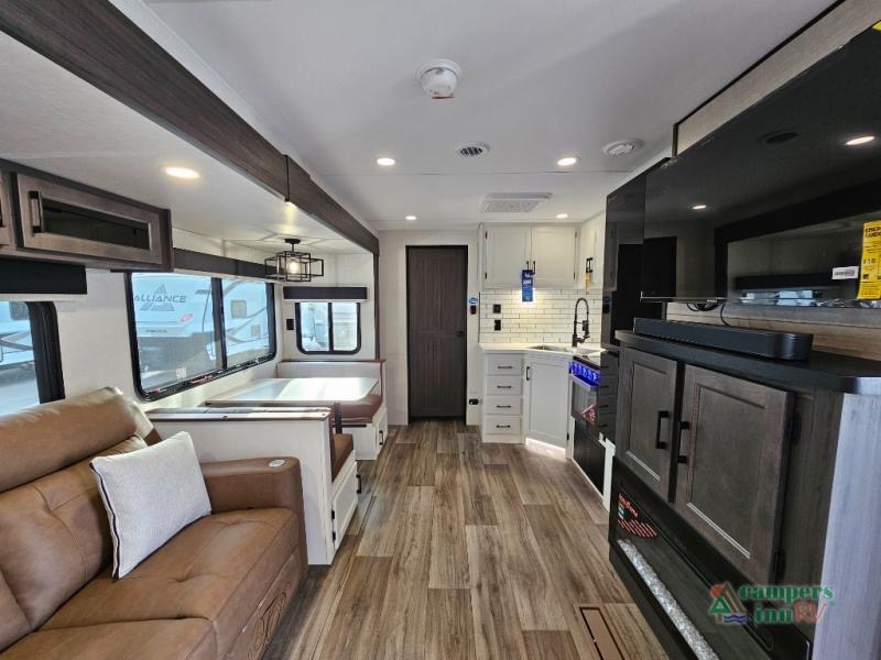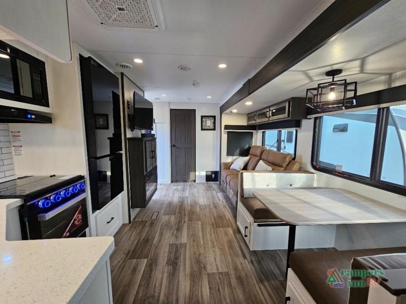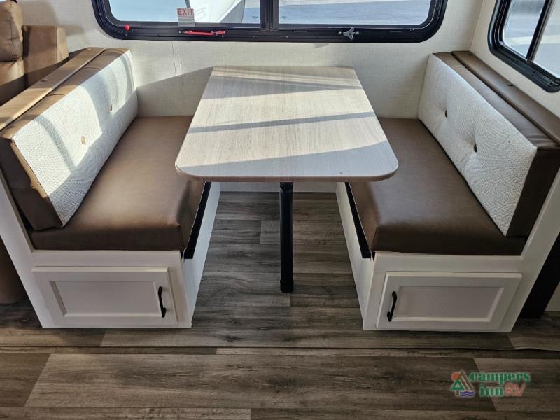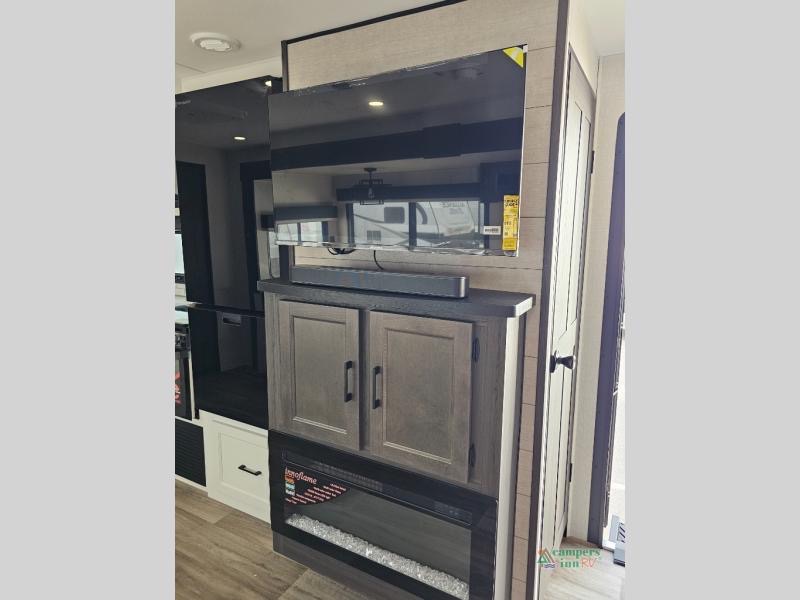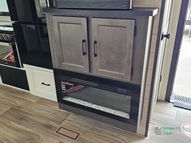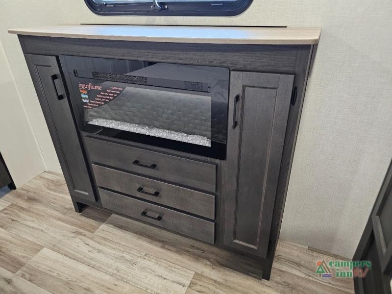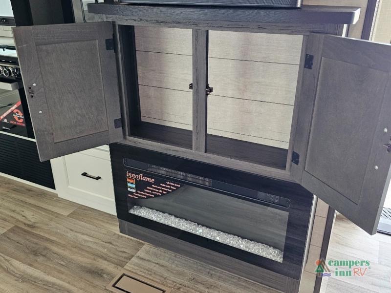 Pack your bags for an adventure of a lifetime with your spouse in this travel trailer! The front private bedroom has a 70" x 80" Sleep Tight king bed slide for more interior space, a dresser with a 30" frameless fireplace and TV, and a window seat to read a book with a view. Freshen up each morning in the rear full bathroom with the 30" x 36" shower, and store your linens in the three door linen closet, then head to the fully equipped kitchen to fry up some eggs on the three burner cooktop. The Sit N' Slide table offers a comfortable place to enjoy your meals, play card games, and even transform into an extra sleeping space. Grab a snack from the walk-in pantry with coat hooks and relax on the 70" tri-fold sofa bed across from the entertainment center with a 30" frameless fireplace!