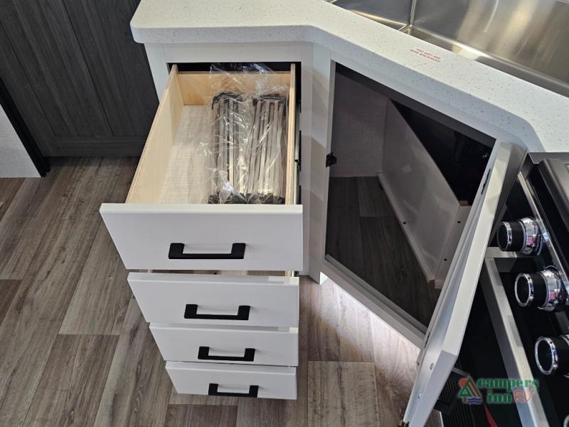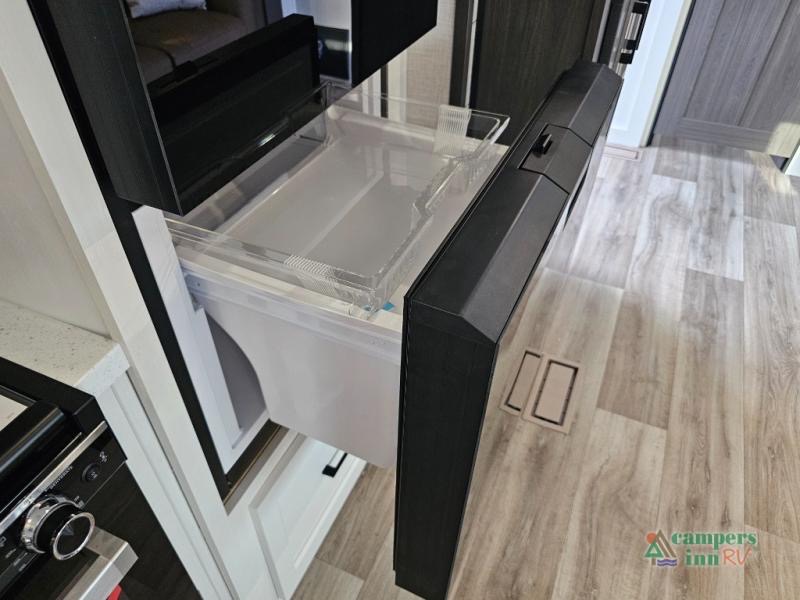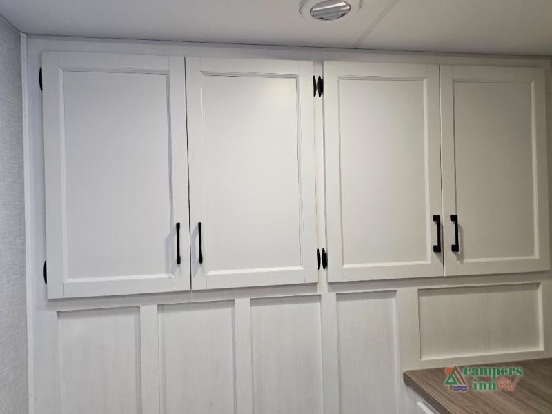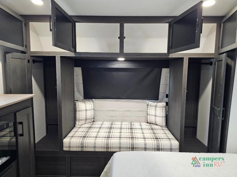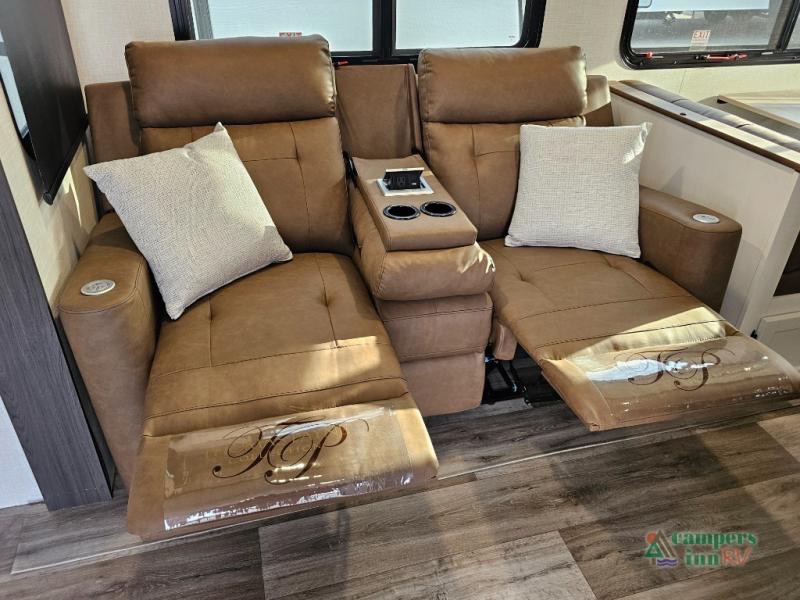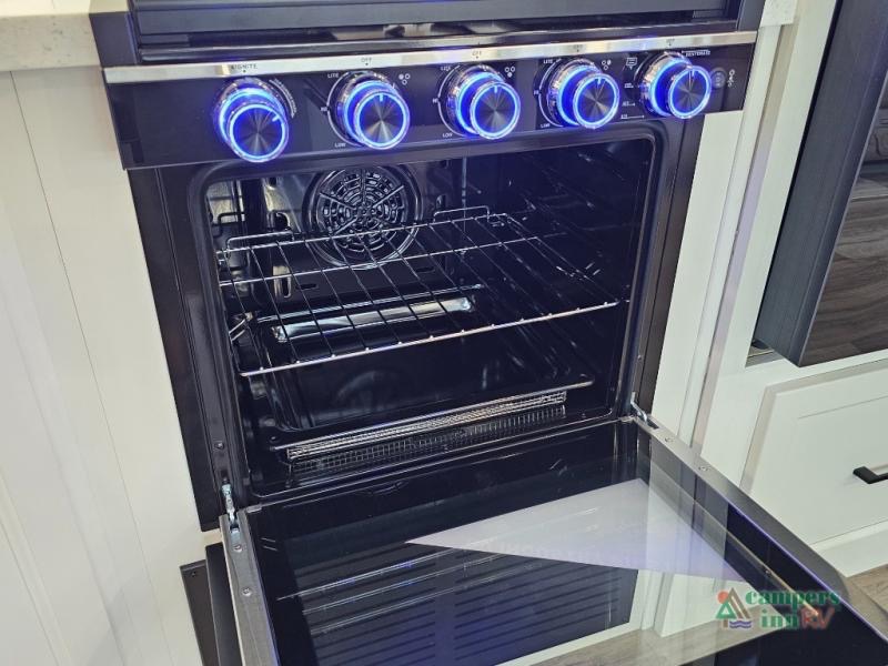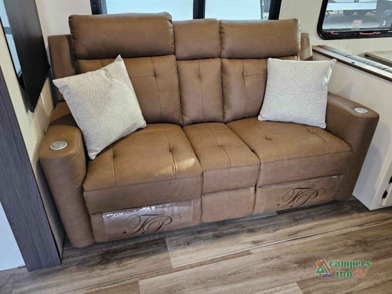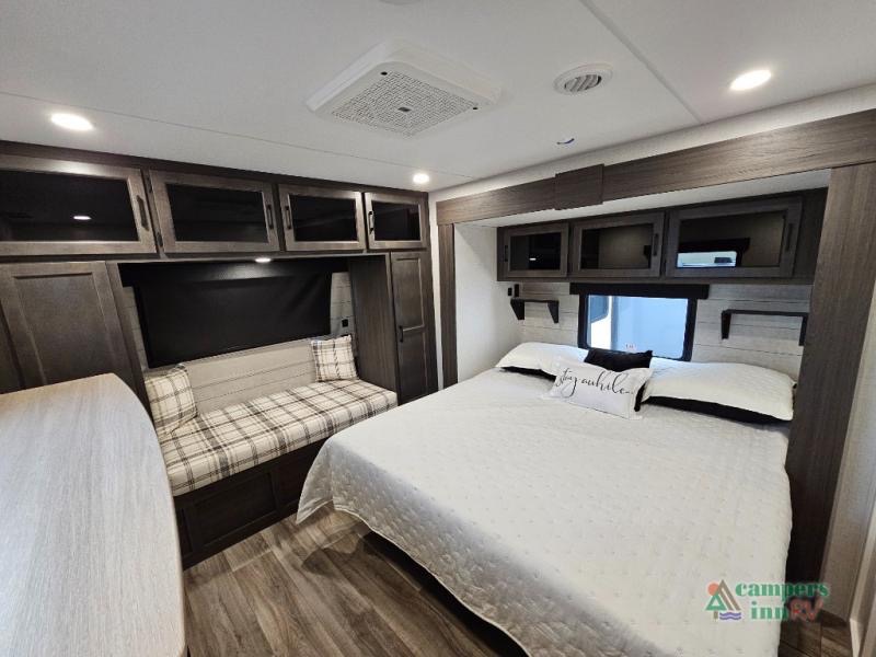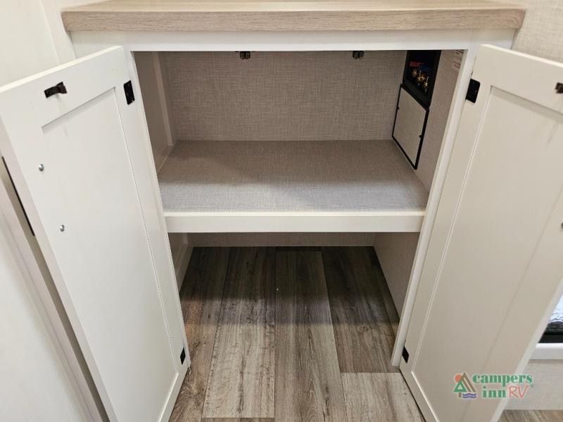 Pack your bags for an adventure of a lifetime with your spouse in this travel trailer! The front private bedroom has a 70" x 80" Sleep Tight king bed slide for more interior space, a dresser with a 30" frameless fireplace and TV, and a window seat to read a book with a view. Freshen up each morning in the rear full bathroom with the 30" x 36" shower, and store your linens in the three door linen closet, then head to the fully equipped kitchen to fry up some eggs on the three burner cooktop. The Sit N' Slide table offers a comfortable place to enjoy your meals, play card games, and even transform into an extra sleeping space. Grab a snack from the walk-in pantry with coat hooks and relax on the 70" tri-fold sofa bed across from the entertainment center with a 30" frameless fireplace!
