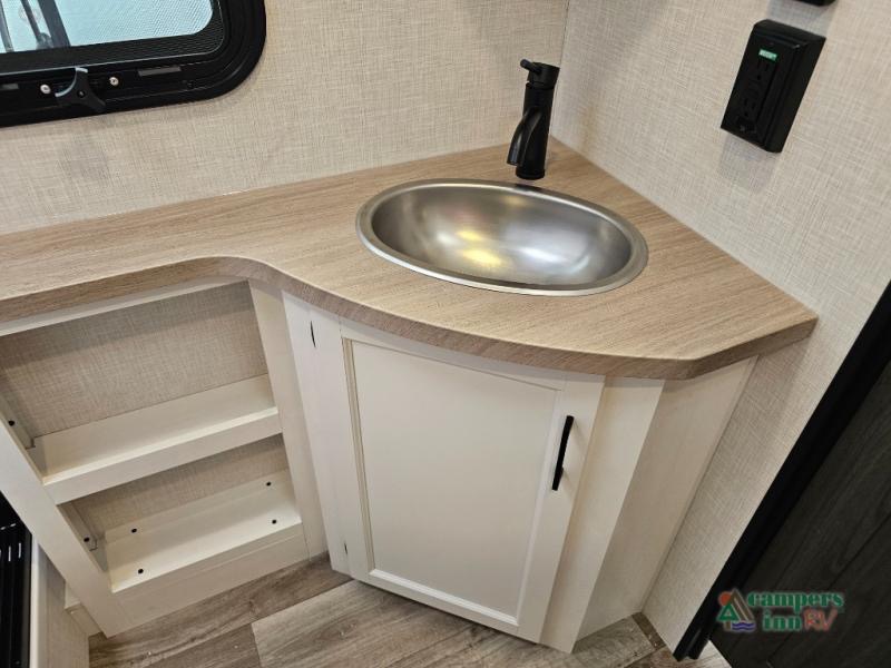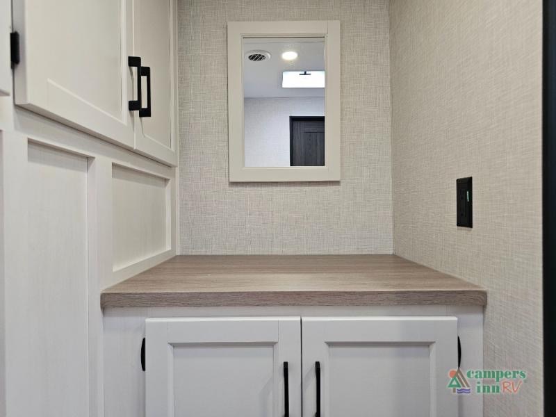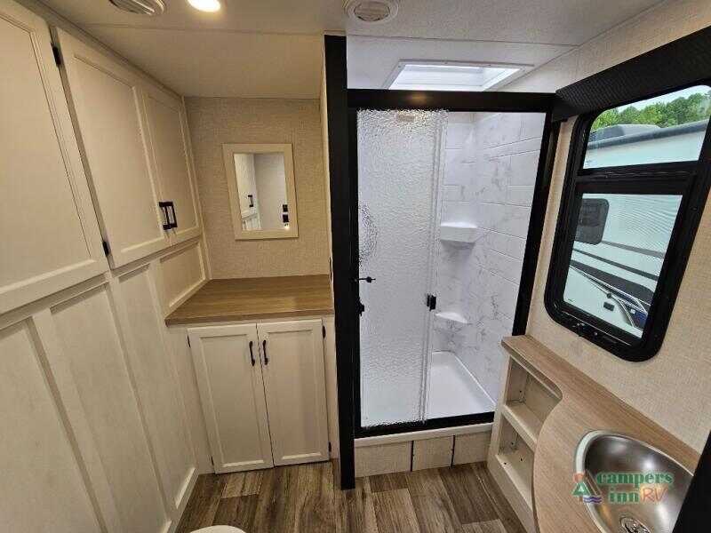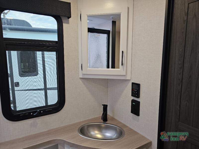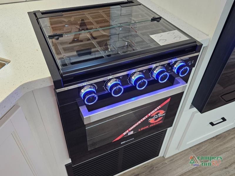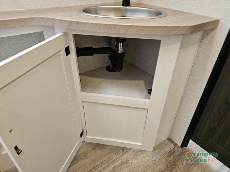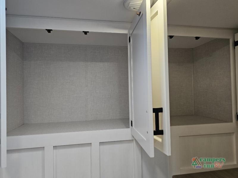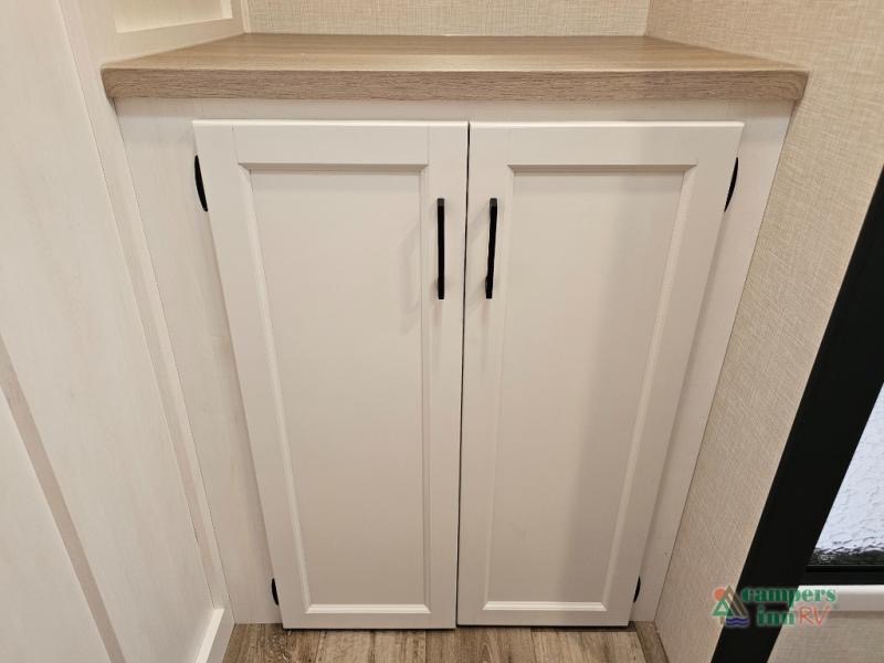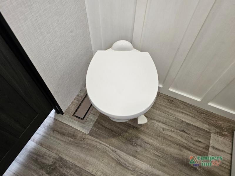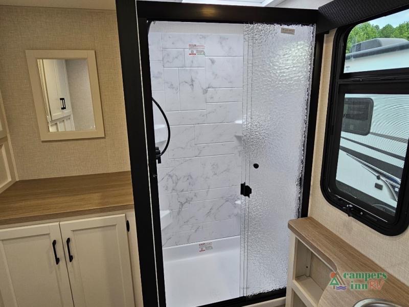 Pack your bags for an adventure of a lifetime with your spouse in this travel trailer! The front private bedroom has a 70" x 80" Sleep Tight king bed slide for more interior space, a dresser with a 30" frameless fireplace and TV, and a window seat to read a book with a view. Freshen up each morning in the rear full bathroom with the 30" x 36" shower, and store your linens in the three door linen closet, then head to the fully equipped kitchen to fry up some eggs on the three burner cooktop. The Sit N' Slide table offers a comfortable place to enjoy your meals, play card games, and even transform into an extra sleeping space. Grab a snack from the walk-in pantry with coat hooks and relax on the 70" tri-fold sofa bed across from the entertainment center with a 30" frameless fireplace!