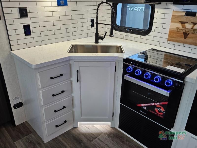 An elegant design and new features come with every one of these Venture RV SportTrek Touring Edition travel trailers! The NXG Huck bolt frame holds these units together and a walkable roof covers them. Heads will turn down the highway and at the campsite with an upgraded graphics package and a painted fiberglass front cap with integrated LED light. The exterior pass-through storage area has slam latch baggage doors with magnetic catches so you don't have to worry about them closing on you and a motion activated light to see your items clearly even at night. Luxury abounds throughout these units, especially with the mandatory Interior Luxury package which comes with solid surface kitchen countertops, designer valances with fabric nightshades, two 30" frameless fireplaces, and Beauflor wood plank flooring that is easy to clean. Come find your favorite model today!