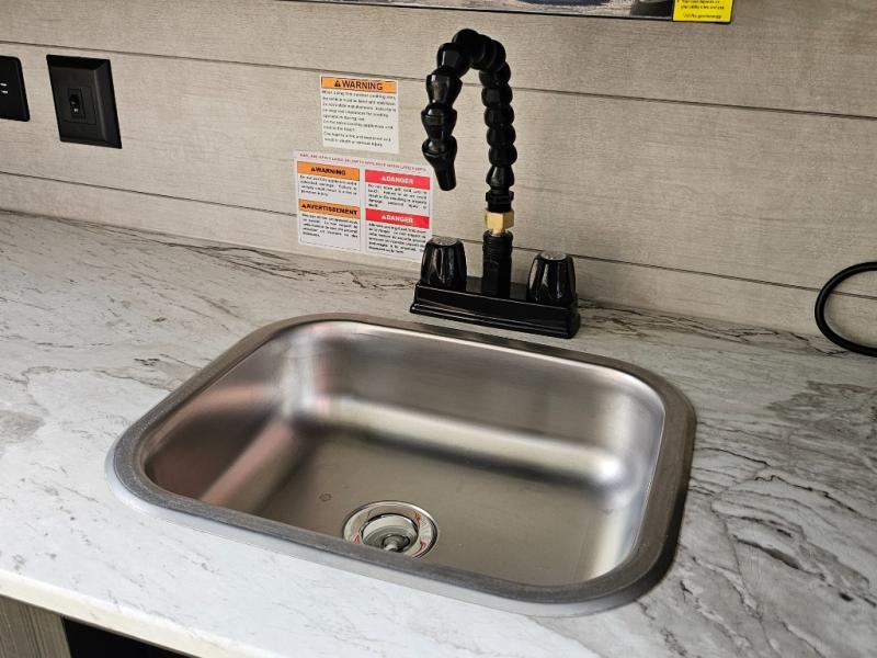 Exterior campfire café with griddle, refrigerator, sink, and countertop space