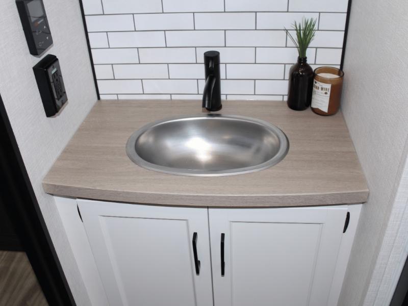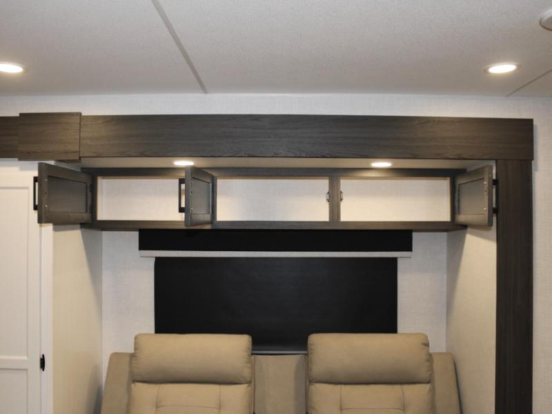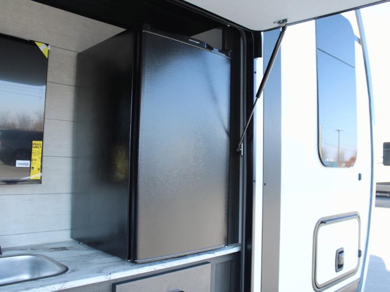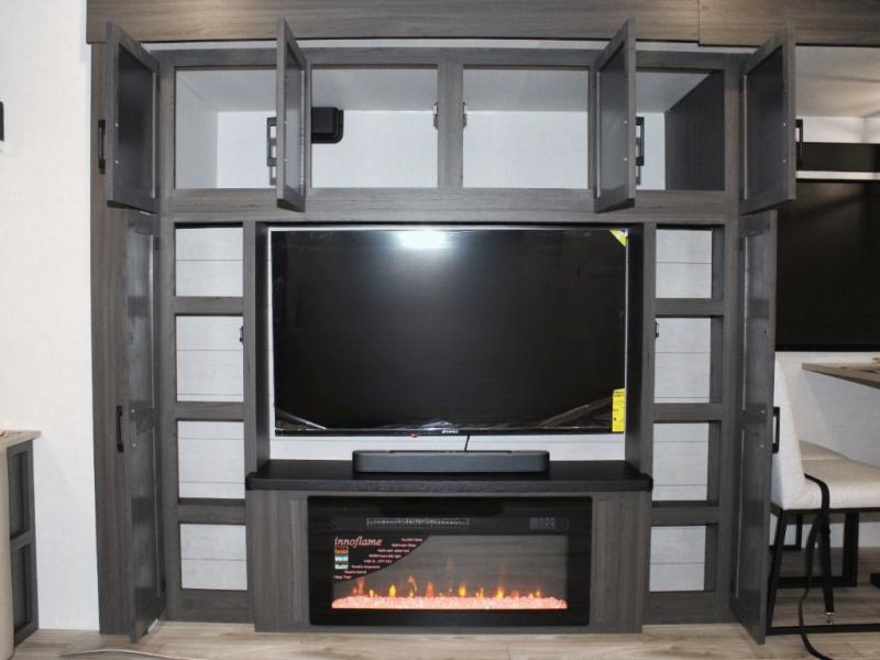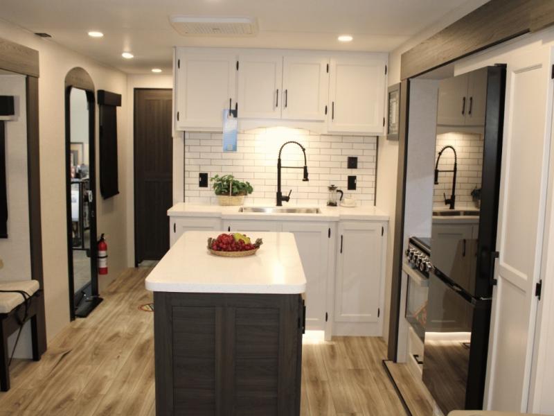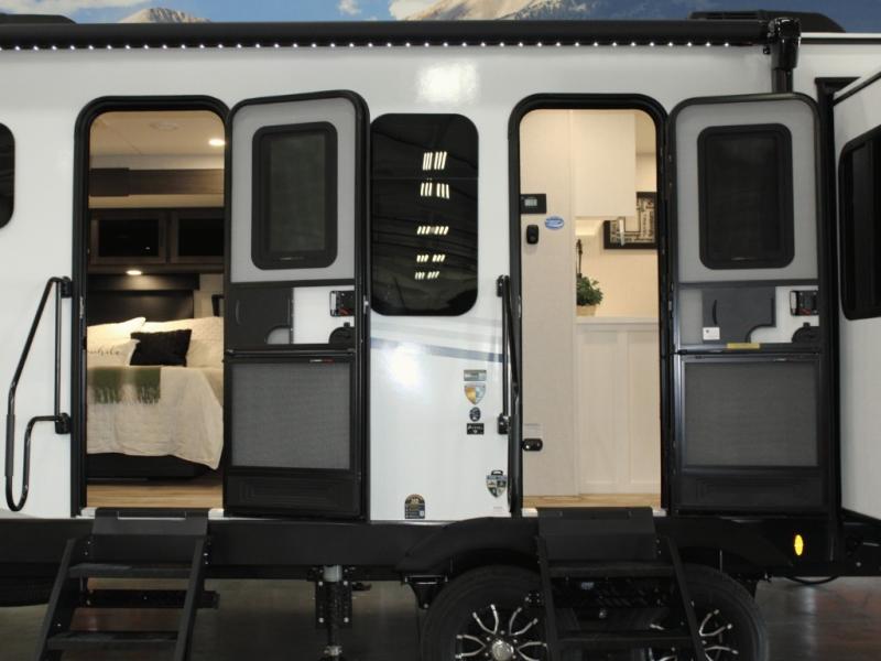 Cooking is a pleasure in the 333VMI’s elegant kitchen, featuring solid surface countertops, a kitchen island for easy meal prep, and a residential refrigerator to store all your fresh ingredients. Enjoy meals and conversation at the table and chairs, then transition seamlessly to outdoor fun with the exterior campfire café, complete with a refrigerator, griddle, sink, and extra counter space. From sunrise breakfasts to late-night snacks under the awning, every meal becomes an experience.