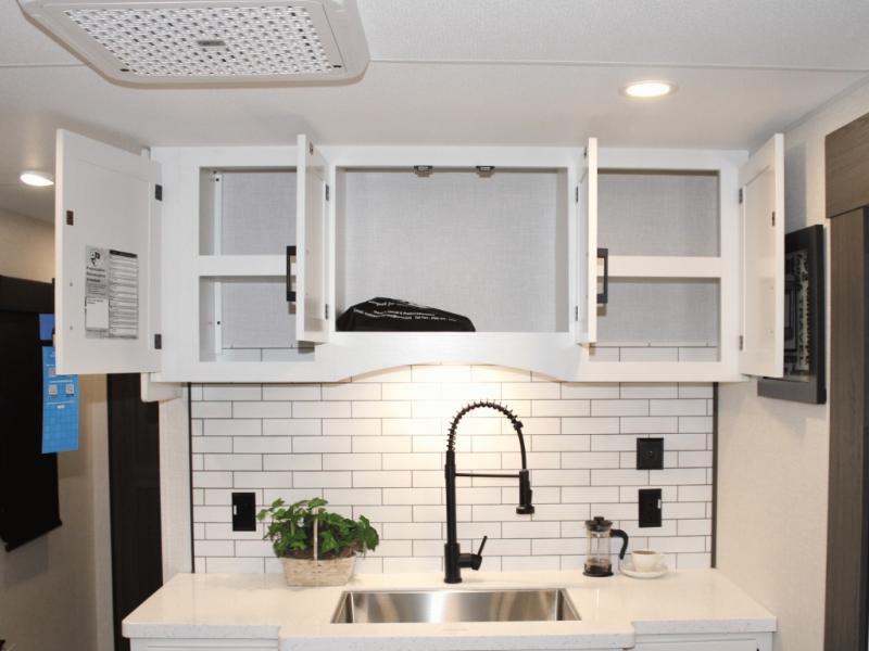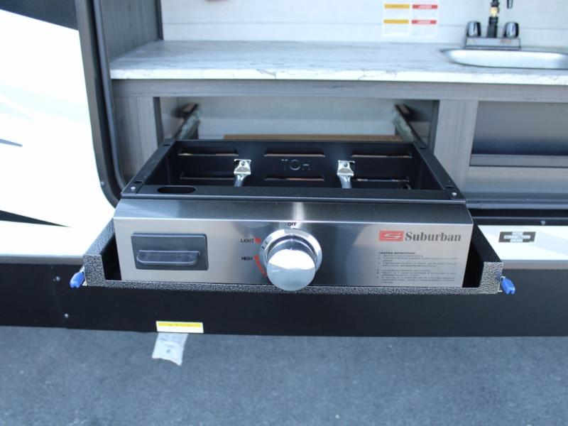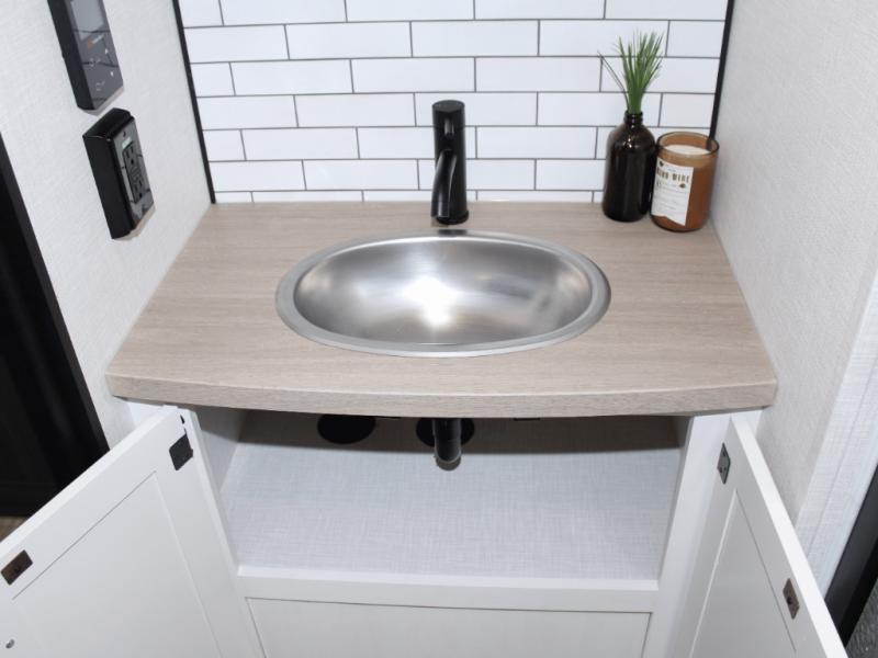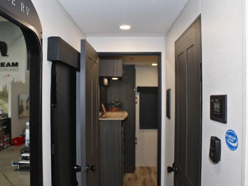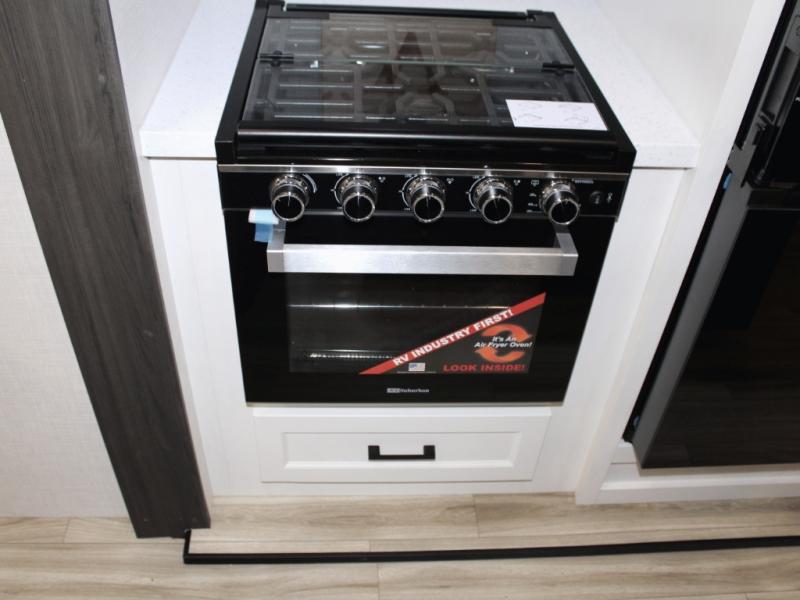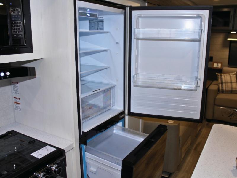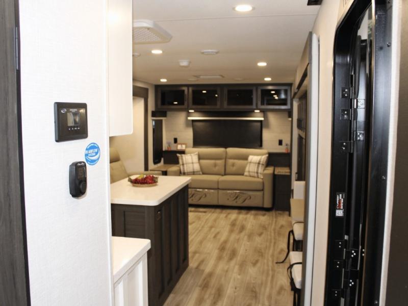 Cooking is a pleasure in the 333VMI’s elegant kitchen, featuring solid surface countertops, a kitchen island for easy meal prep, and a residential refrigerator to store all your fresh ingredients. Enjoy meals and conversation at the table and chairs, then transition seamlessly to outdoor fun with the exterior campfire café, complete with a refrigerator, griddle, sink, and extra counter space. From sunrise breakfasts to late-night snacks under the awning, every meal becomes an experience.