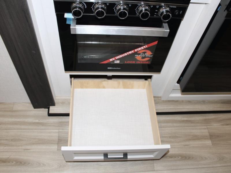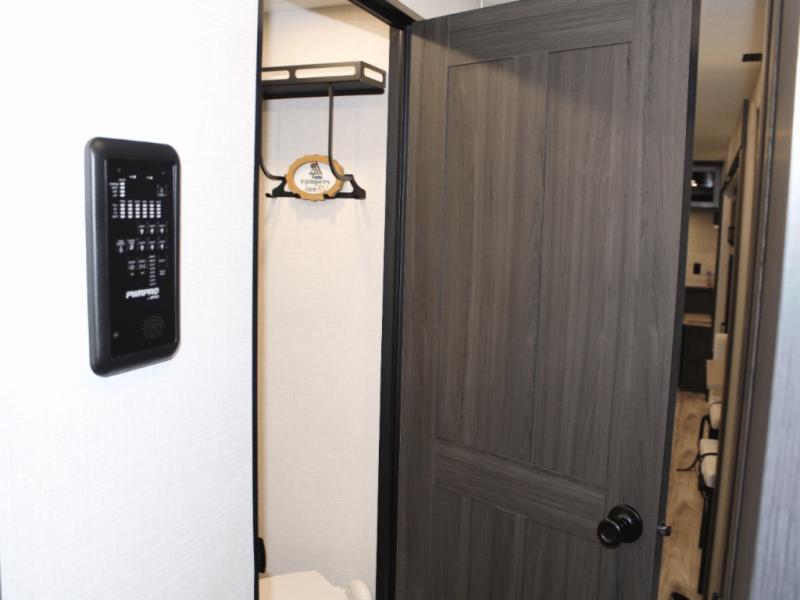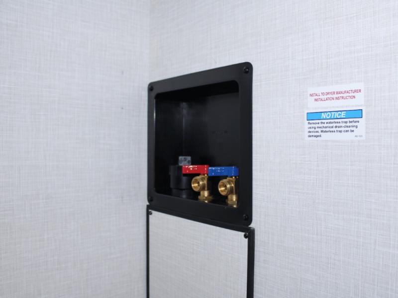 Unwind at night in your rear private bedroom featuring a Sleep Tight 70" x 80" king bed slide, a dresser with a 30" frameless fireplace, and a wardrobe with washer/dryer prep for extended stays. Dual entry doors—including one with triple pull-out aluminum steps—make coming and going simple and convenient. With this level of luxury, every journey feels like a first-class getaway.