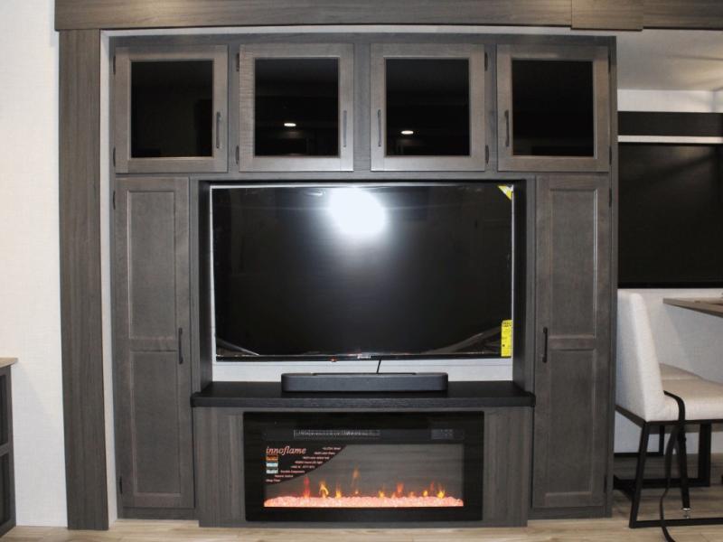 Inside, you’ll enjoy premium touches from the Interior Luxury Package—including Beauflor wood plank flooring, designer valances with fabric nightshades, and dual frameless fireplaces that elevate the atmosphere of every room. This isn’t just a travel trailer—it’s a mobile luxury retreat.