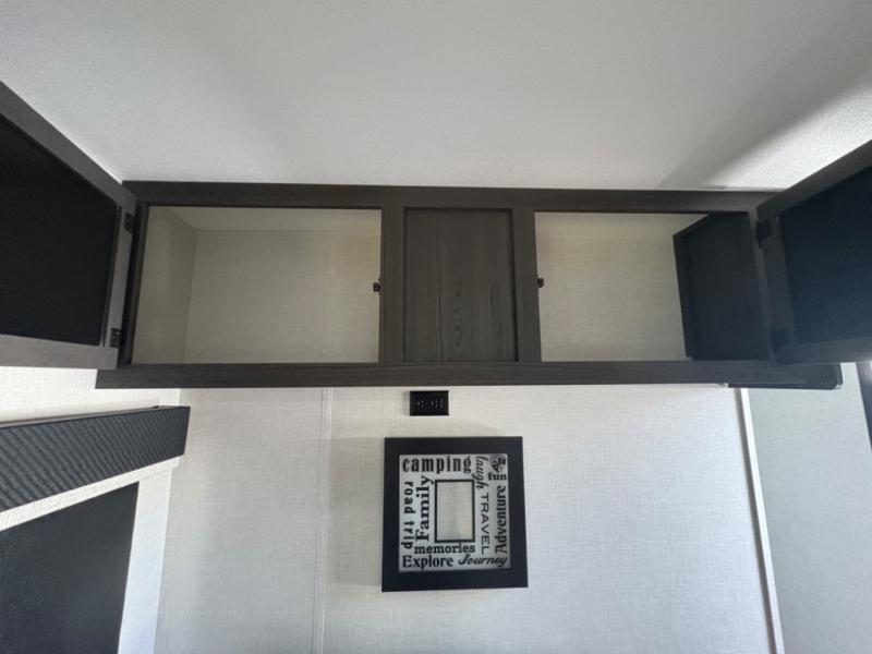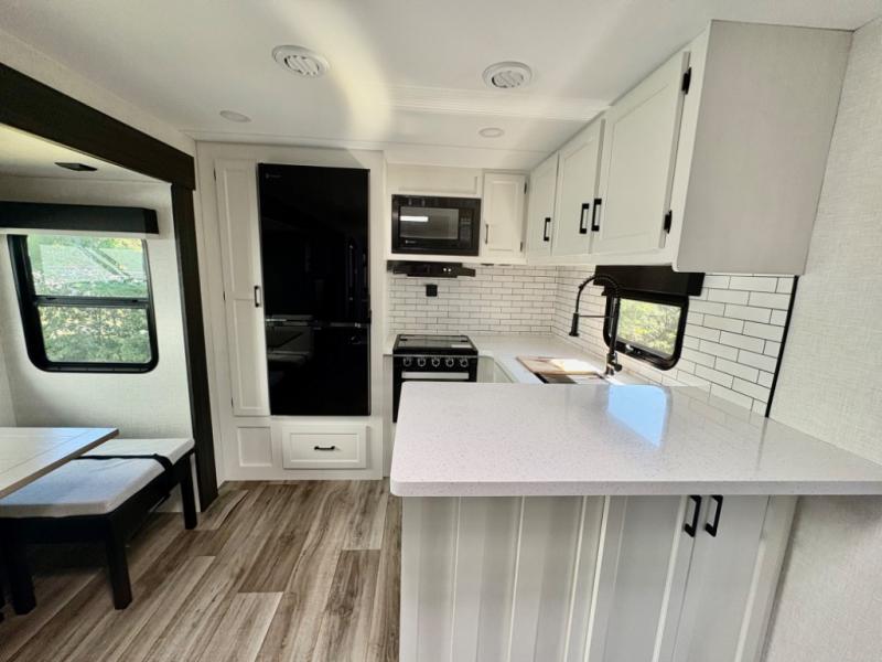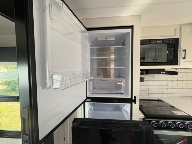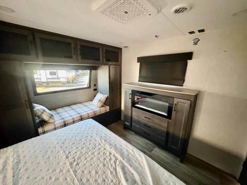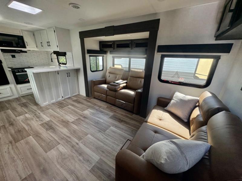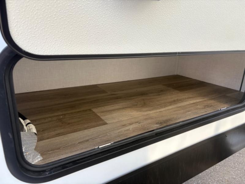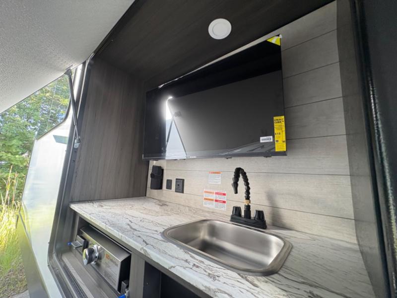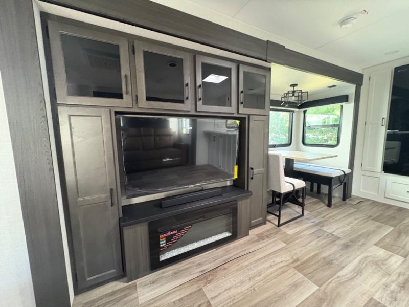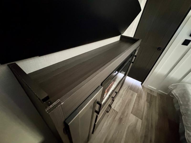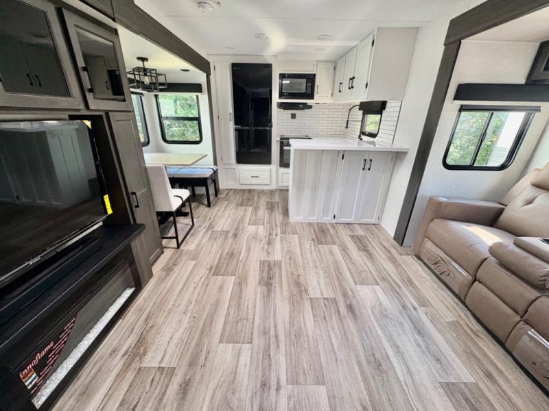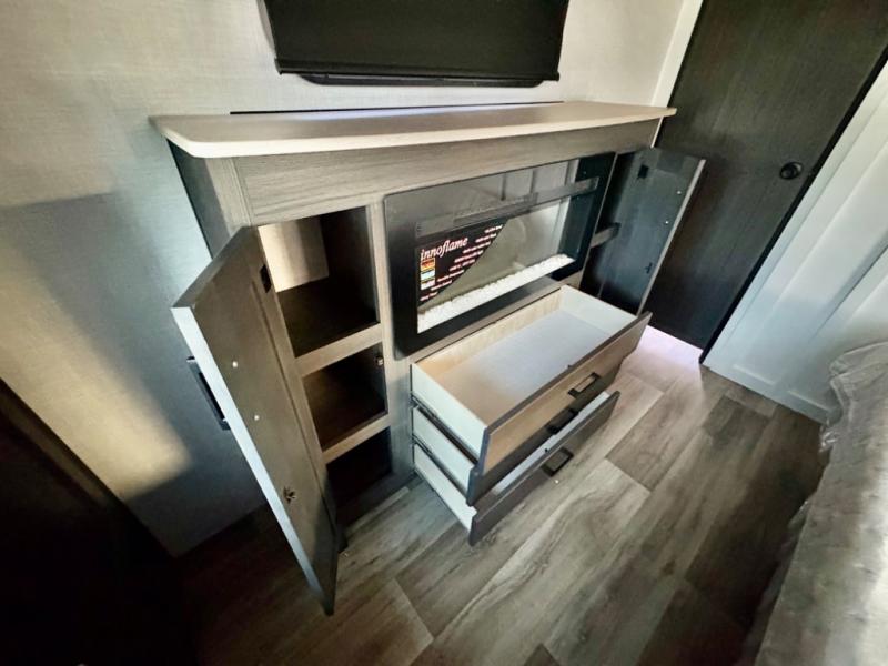The chef will feel right at home cooking in the rear kitchen with all of the countertop space in this travel trailer! They can even head outside to breathe in some fresh air while cooking at the exterior campfire café with a refrigerator, a sink with countertop space, and a griddle. Relax each night in the middle living area with the 64" sofa and the slide that has theater seating with USB charging across from the entertainment center with a TV and 30" frameless fireplace. When you're ready to wind down your nights, take a hot shower in the full bathroom with the 30" x 36" shower then head to the front private bedroom and either read a book at the window seat or lay in the 70" x 80" sleep tight king bed slide while watching a movie with the TV or watch the 30" frameless fireplace!