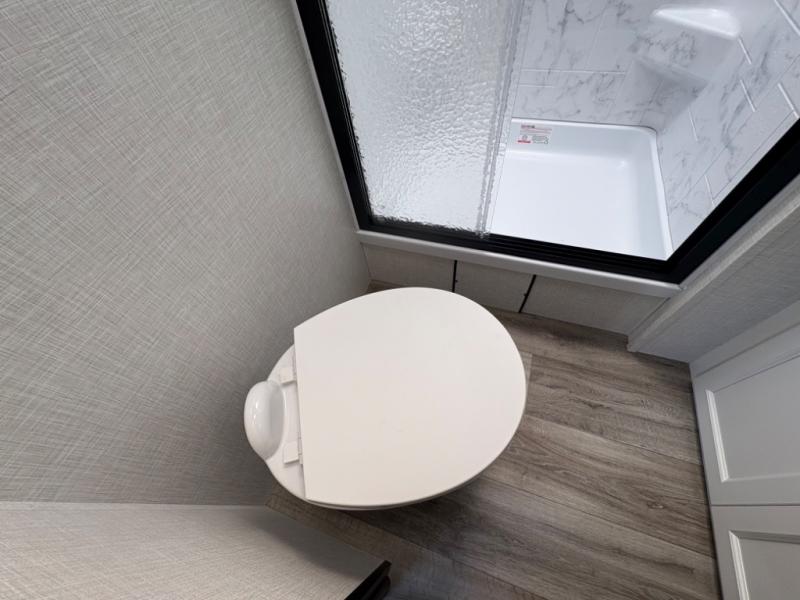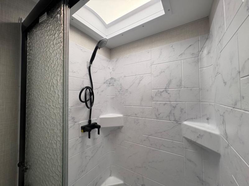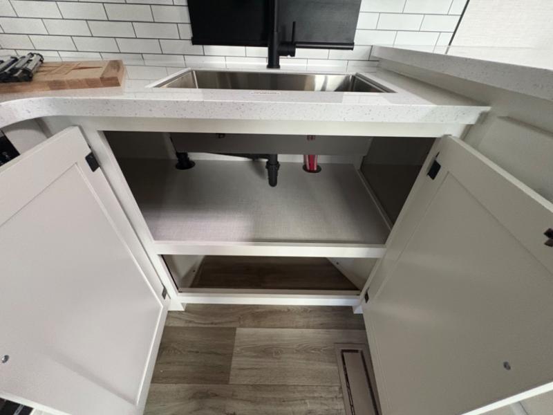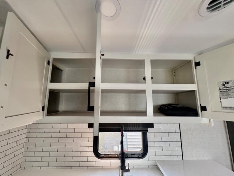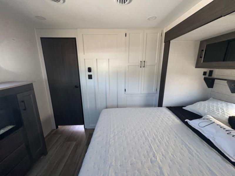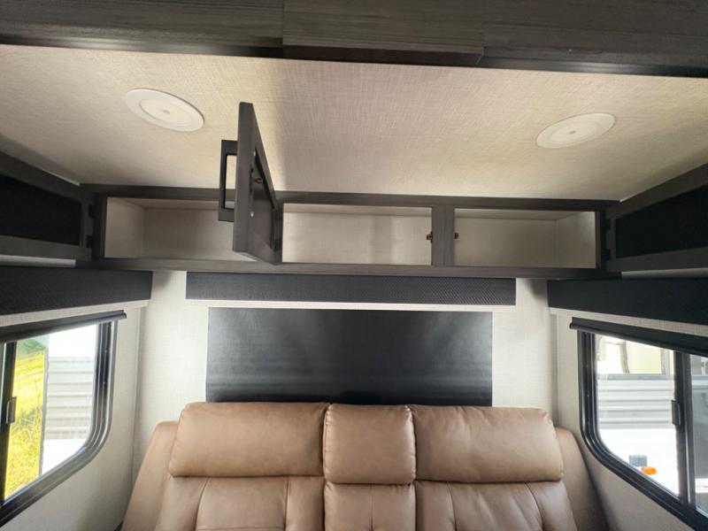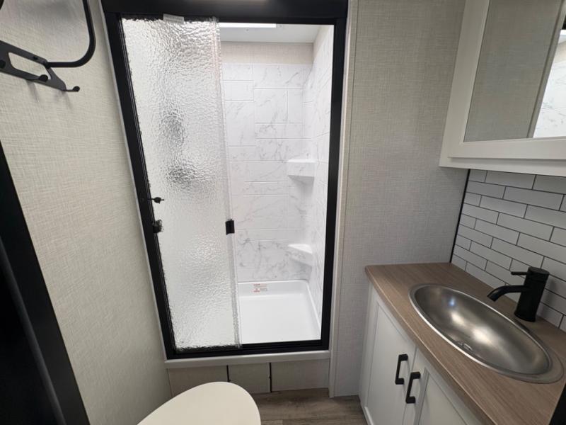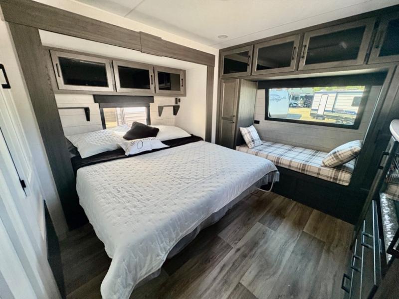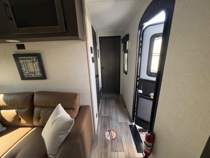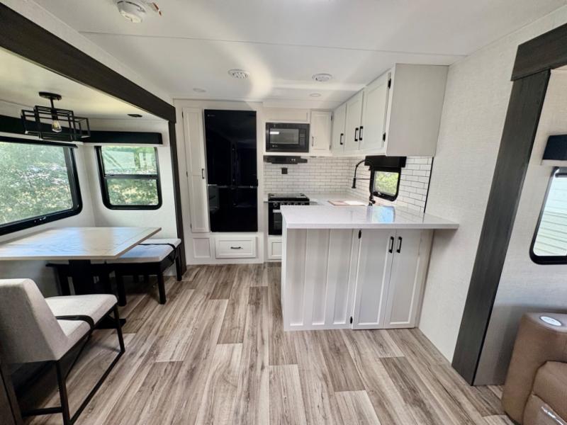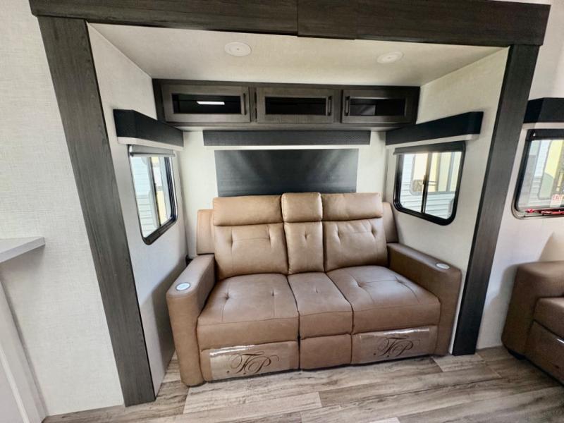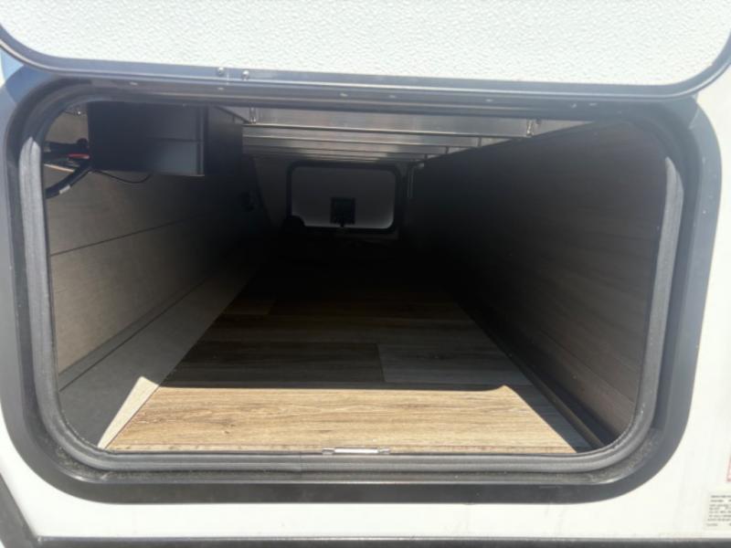 The chef will feel right at home cooking in the rear kitchen with all of the countertop space in this travel trailer! They can even head outside to breathe in some fresh air while cooking at the exterior campfire café with a refrigerator, a sink with countertop space, and a griddle. Relax each night in the middle living area with the 64" sofa and the slide that has theater seating with USB charging across from the entertainment center with a TV and 30" frameless fireplace. When you're ready to wind down your nights, take a hot shower in the full bathroom with the 30" x 36" shower then head to the front private bedroom and either read a book at the window seat or lay in the 70" x 80" sleep tight king bed slide while watching a movie with the TV or watch the 30" frameless fireplace!