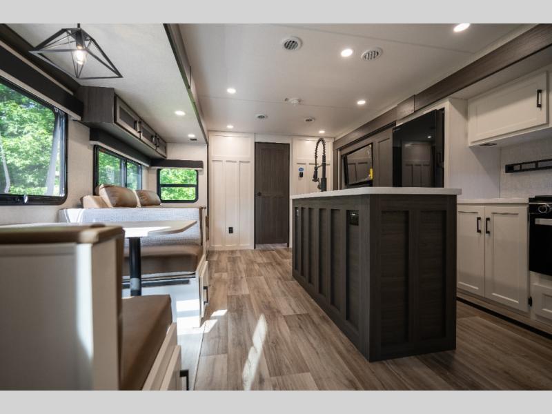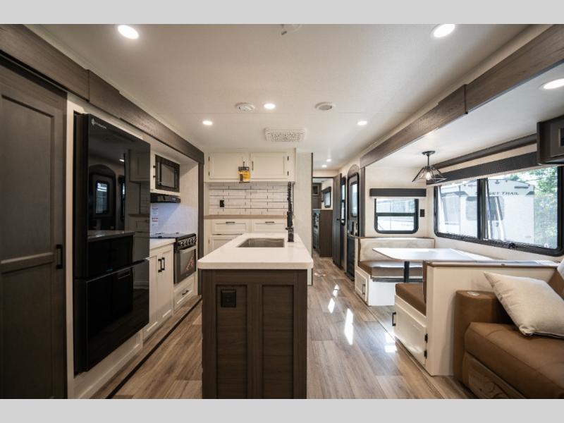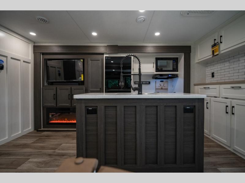 At 38 feet in length, the 343VIB features a unique Versa Bunk floorplan with a flexible rear bunk room that easily converts into an office, playroom, or extra sleeping space — ideal for growing families or remote workers. The front of the trailer boasts a private king bedroom with abundant wardrobe storage and washer/dryer prep, while the central living area features theater seating, an entertainment center with a fireplace, and a freestanding dinette.