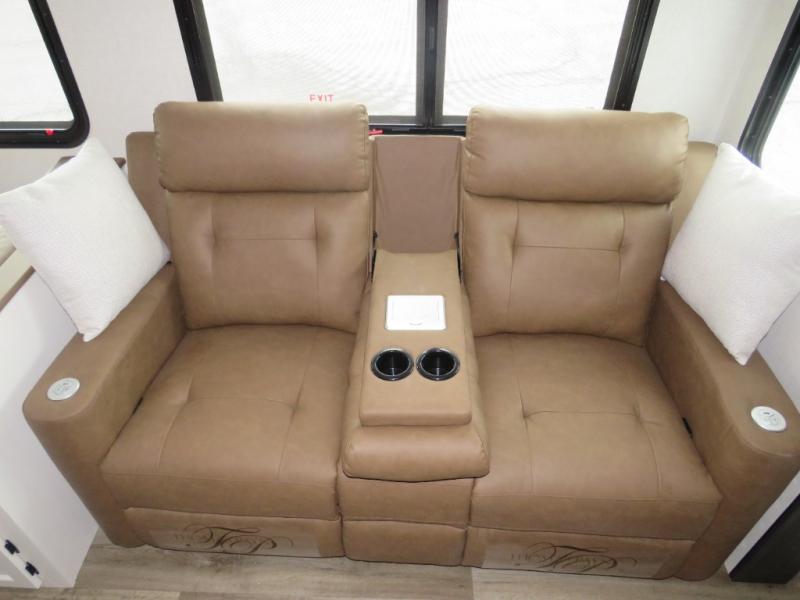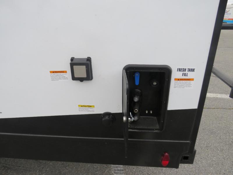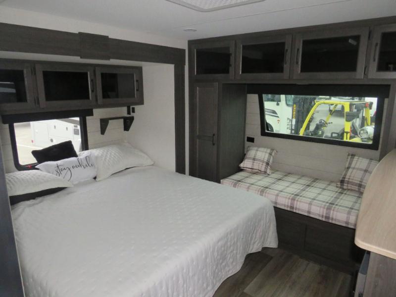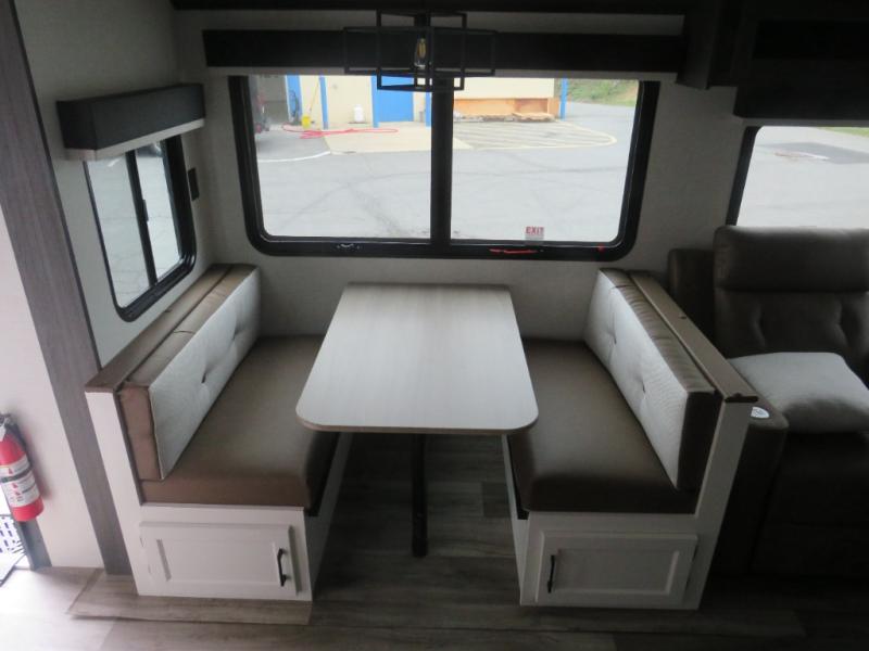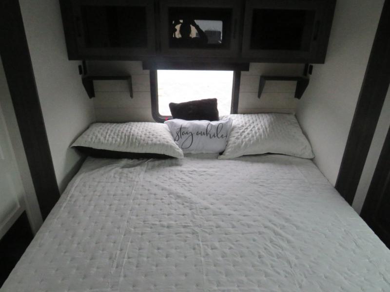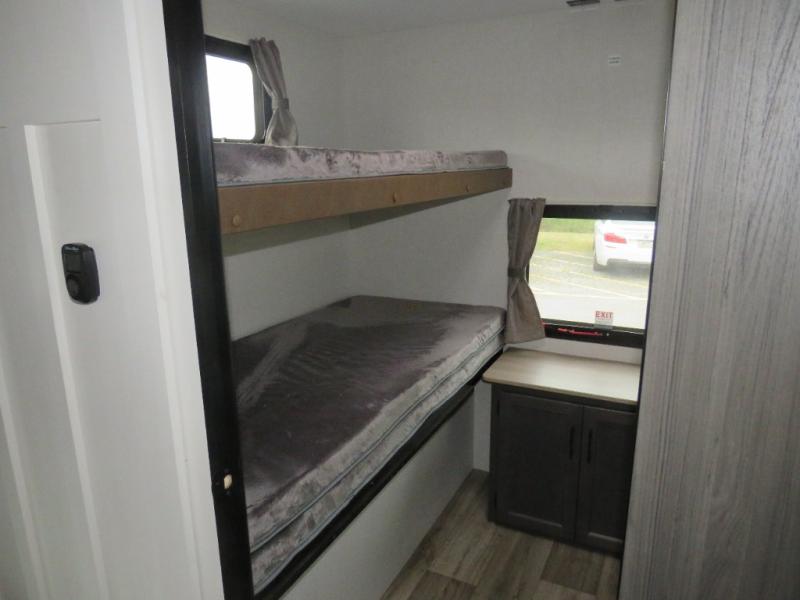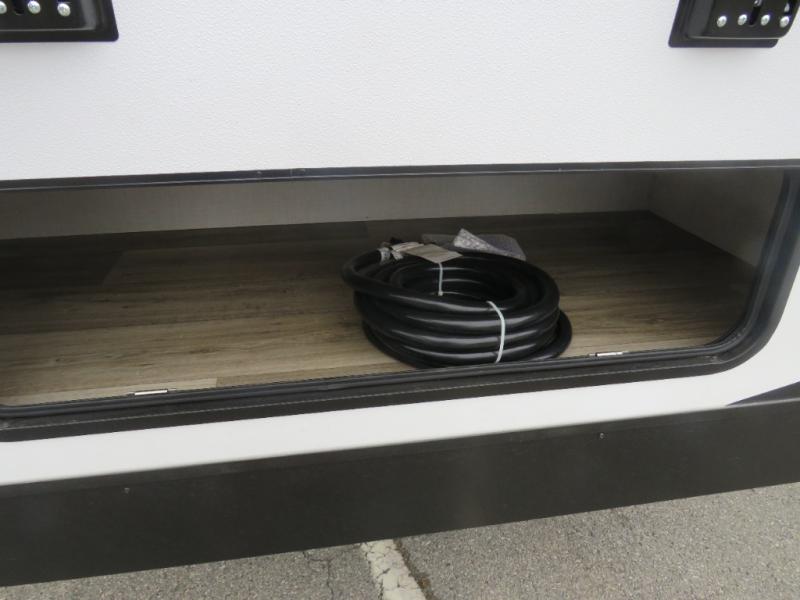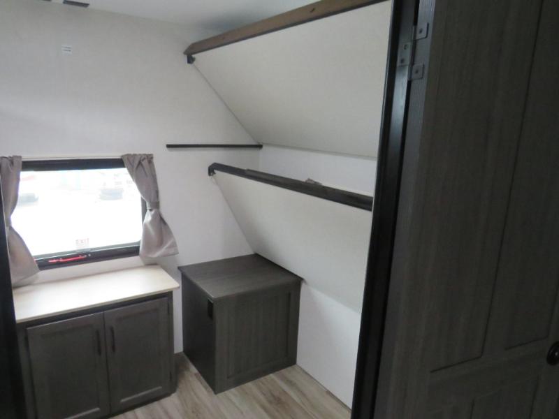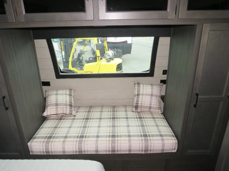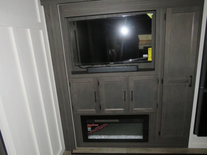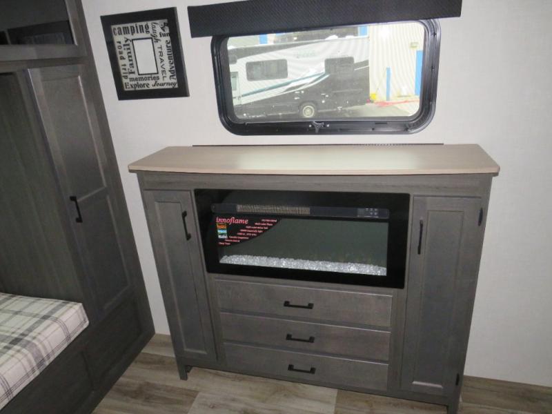 Versatility abounds in this travel trailer! The rear private bunkhouse has a set of 32" x 70" bunk beds and a set of 28" x 70" flip up bunk beds, but what is really special about this room is its ability to convert to a flex room with a desk, king bed, extra storage or a pet palace. The chef will enjoy having their choice of either cooking indoors with the kitchen island and three burner cooktop or cooking at the exterior campfire café with a refrigerator, a griddle, and a sink with countertop space. Relax each night in true comfort with a 70" tri-fold sofa across from the entertainment center with a 30" frameless fireplace, plus the front private bedroom has a 30" frameless fireplace across from a 60" x 80" queen bed slide. You can even transform the sofa and the Sit N' Slide table into extra sleeping spaces. The bedroom also has a window seat so you can look out at your beautiful scenery while reading a book and an interior wall wardrobe with washer and dryer prep!