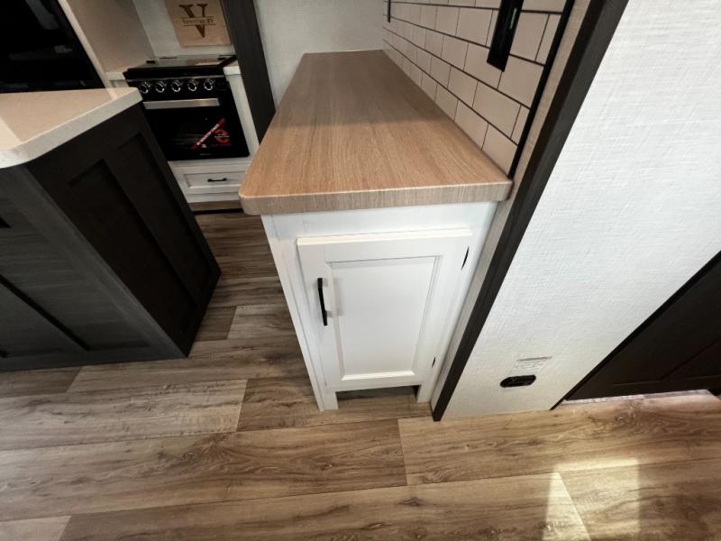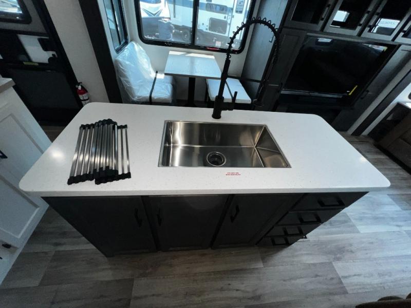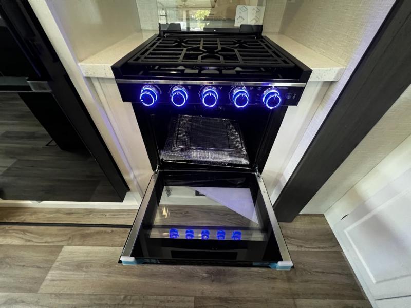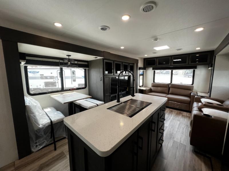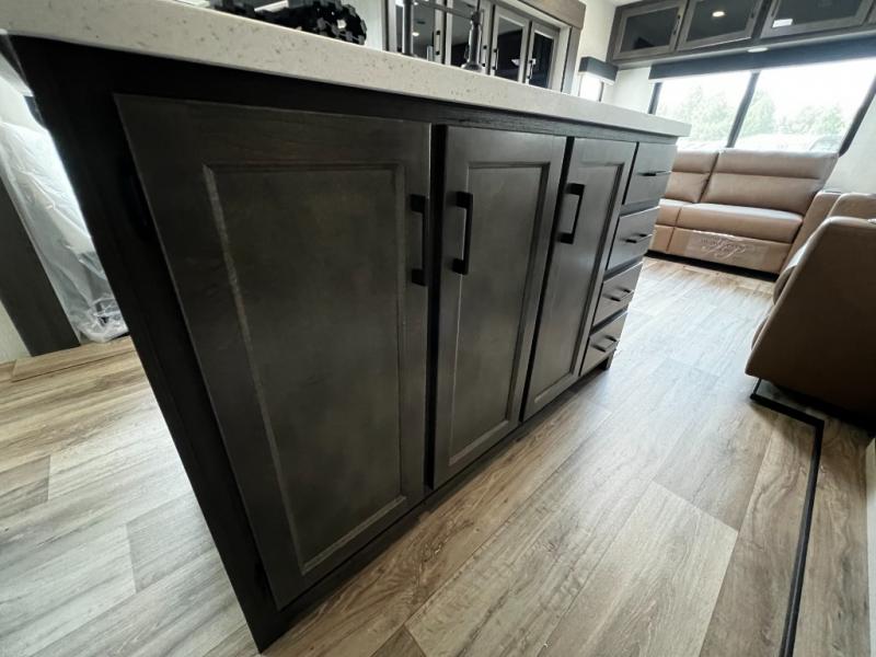 Gourmet Kitchen with Island – Cook like a pro on the road with solid surface countertops, 3-burner cooktop, and prep space galore.