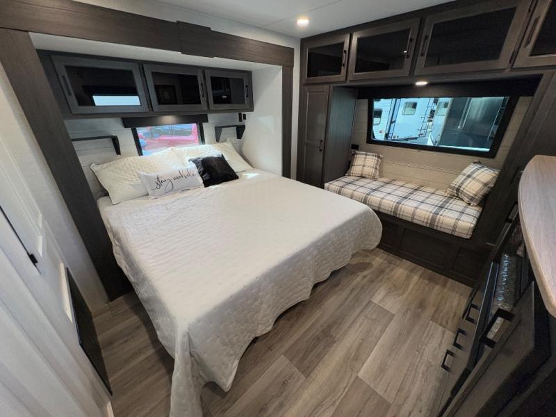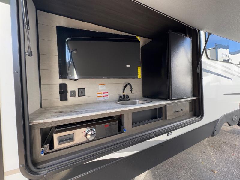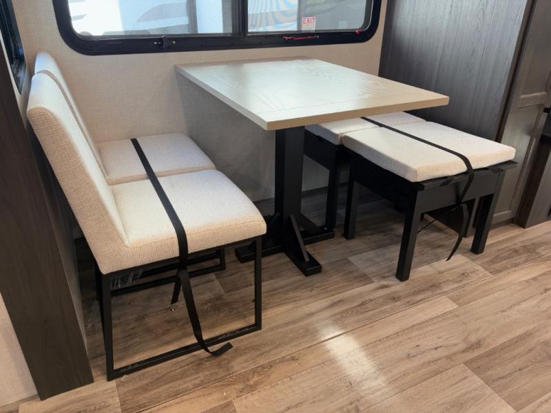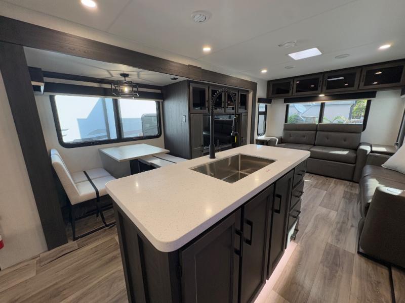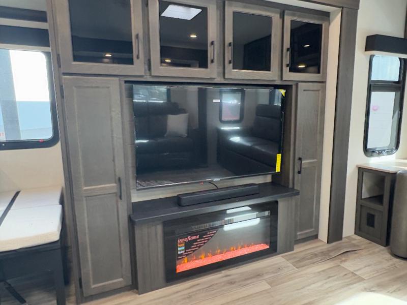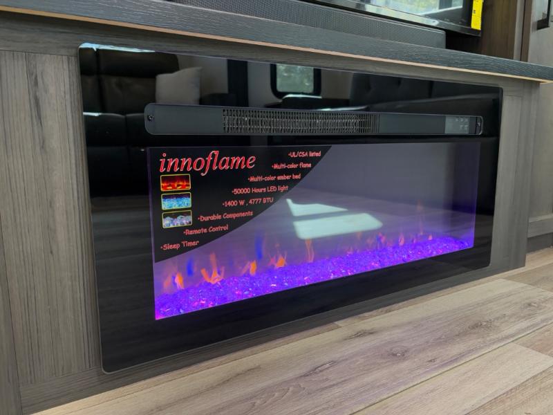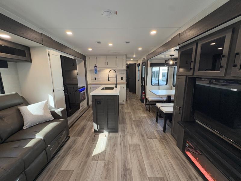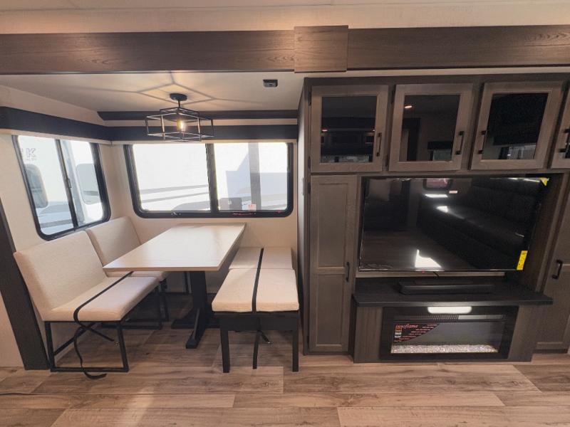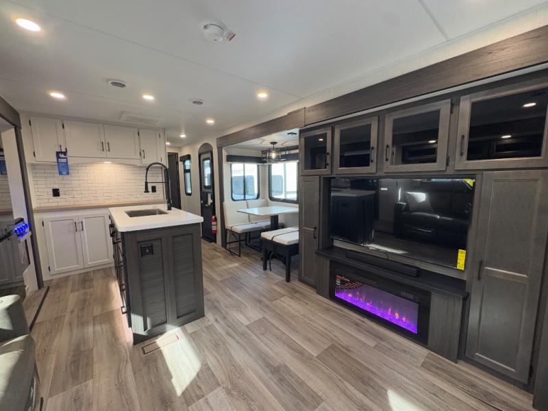 Pack your bags and hitch up this travel trailer for a great weekend camping trip! The front private bedroom has a 70" x 80" Sleep Tight king bed slide to lay your head at night, a dresser with a 30" frameless fireplace, a window seat with shelves on either side for your books, and a wardrobe with washer and dryer prep. Freshen up each morning in the full bathroom with the 30" x 36" shower then head to the kitchen to fry up some eggs on the three burner cooktop and pour a cold glass of orange juice stored in the 10 cu. ft. refrigerator. The kitchen island will make your meal prepping easier and the table and chairs offer a comfortable place to enjoy your meals or play card games. You could even cook your meals at the exterior campfire café and set up a table underneath one of the two power awnings!