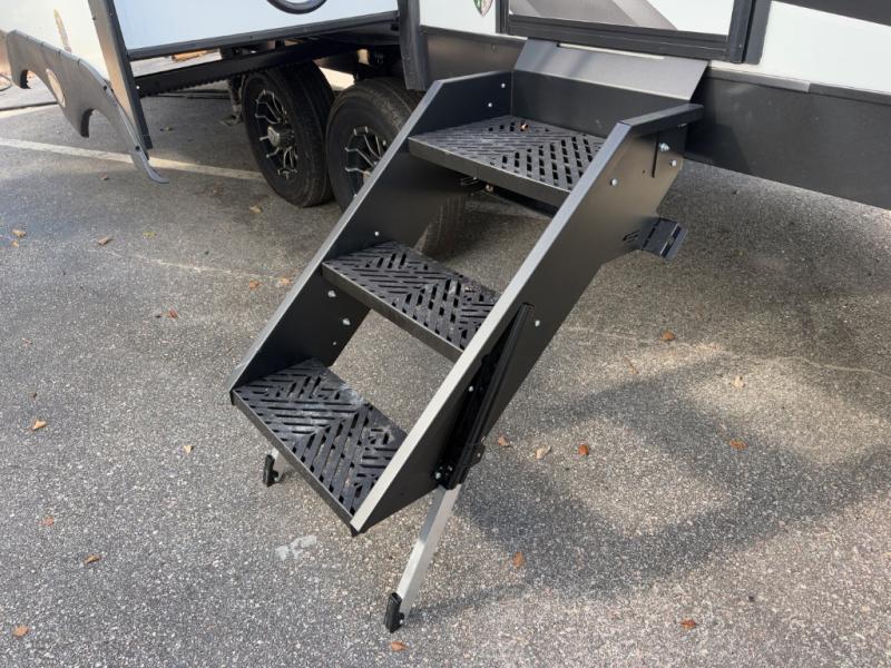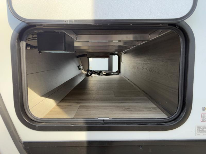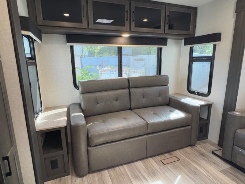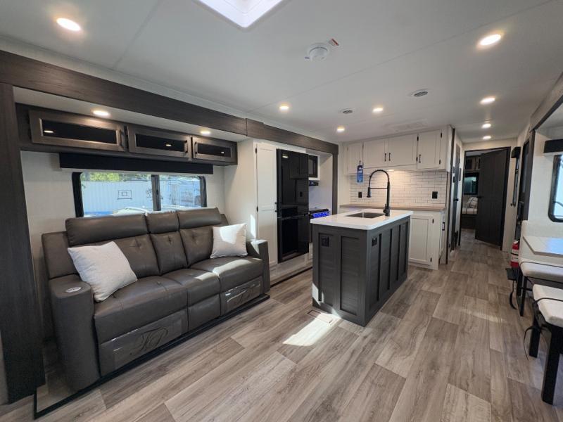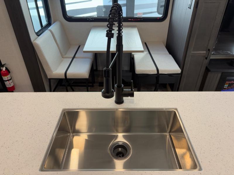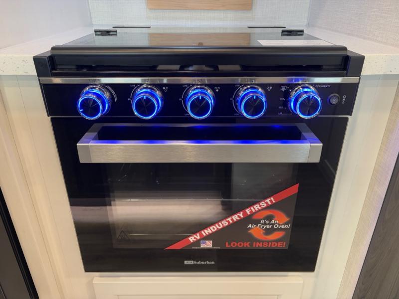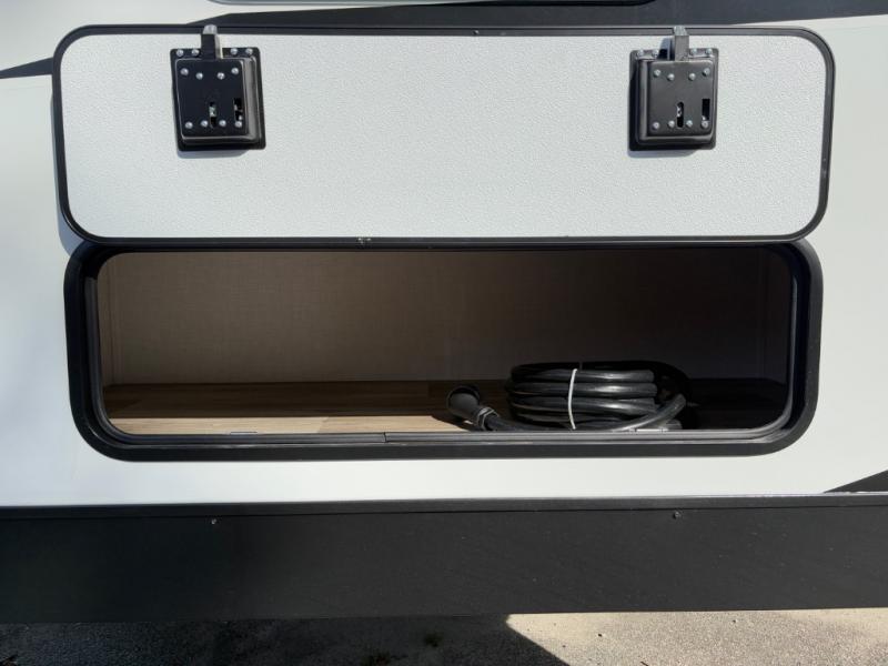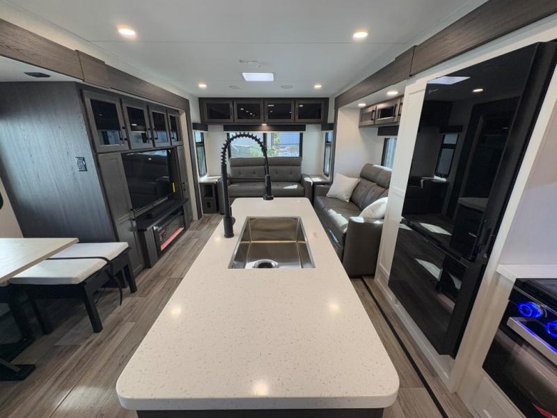 Pack your bags and hitch up this travel trailer for a great weekend camping trip! The front private bedroom has a 70" x 80" Sleep Tight king bed slide to lay your head at night, a dresser with a 30" frameless fireplace, a window seat with shelves on either side for your books, and a wardrobe with washer and dryer prep. Freshen up each morning in the full bathroom with the 30" x 36" shower then head to the kitchen to fry up some eggs on the three burner cooktop and pour a cold glass of orange juice stored in the 10 cu. ft. refrigerator. The kitchen island will make your meal prepping easier and the table and chairs offer a comfortable place to enjoy your meals or play card games. You could even cook your meals at the exterior campfire café and set up a table underneath one of the two power awnings!