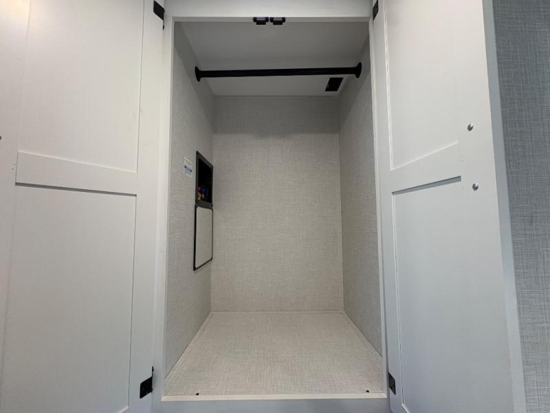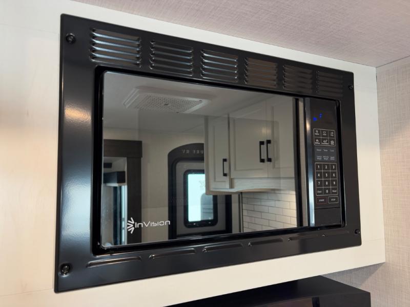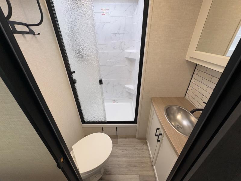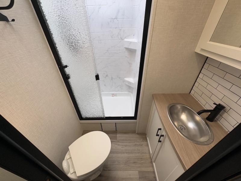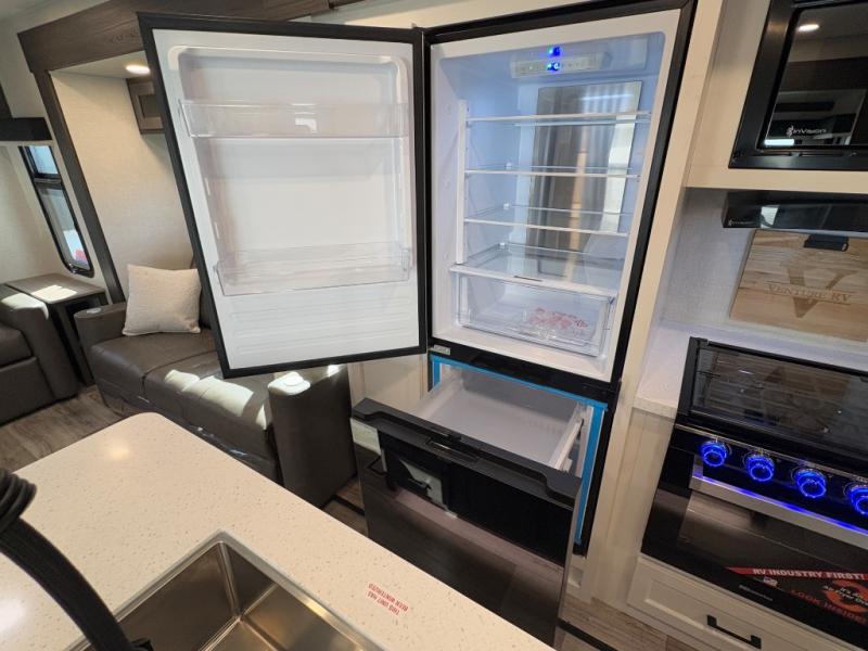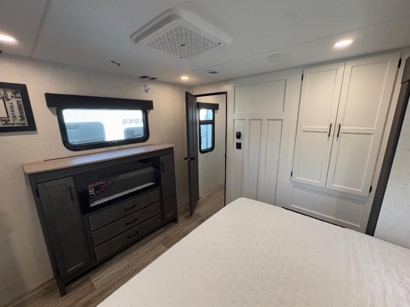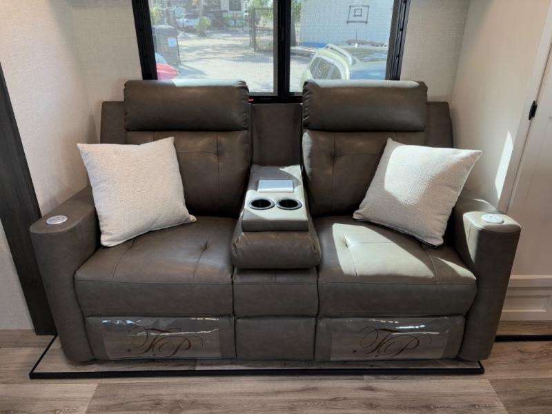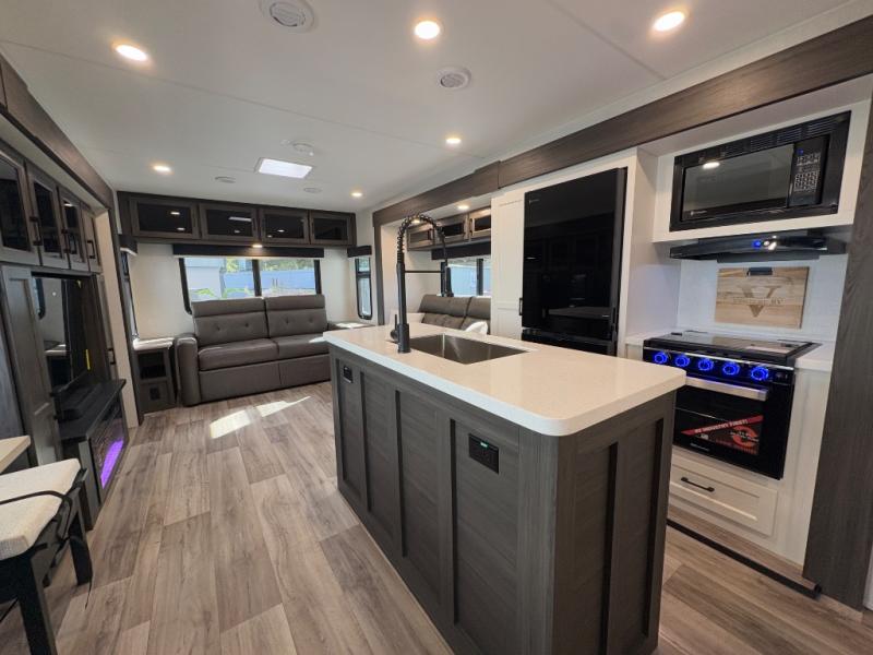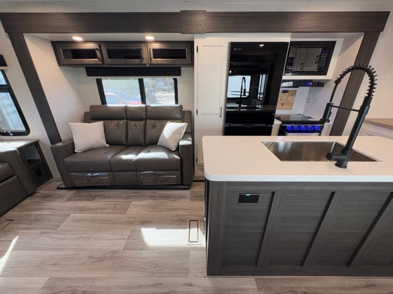 Pack your bags and hitch up this travel trailer for a great weekend camping trip! The front private bedroom has a 70" x 80" Sleep Tight king bed slide to lay your head at night, a dresser with a 30" frameless fireplace, a window seat with shelves on either side for your books, and a wardrobe with washer and dryer prep. Freshen up each morning in the full bathroom with the 30" x 36" shower then head to the kitchen to fry up some eggs on the three burner cooktop and pour a cold glass of orange juice stored in the 10 cu. ft. refrigerator. The kitchen island will make your meal prepping easier and the table and chairs offer a comfortable place to enjoy your meals or play card games. You could even cook your meals at the exterior campfire café and set up a table underneath one of the two power awnings!