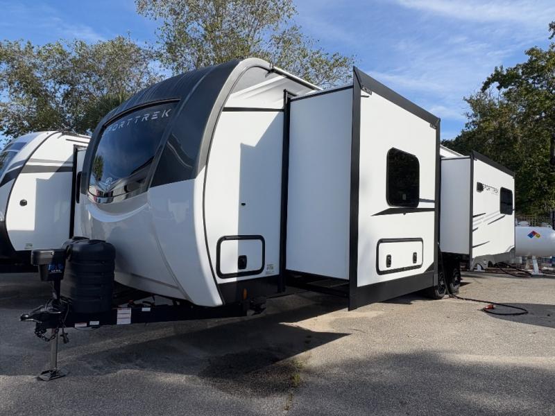 An elegant design and new features come with every one of these Venture RV SportTrek Touring Edition travel trailers! The NXG Huck bolt frame holds these units together and a walkable roof covers them. Heads will turn down the highway and at the campsite with an upgraded graphics package and a painted fiberglass front cap with integrated LED light. The exterior pass-through storage area has slam latch baggage doors with magnetic catches so you don't have to worry about them closing on you and a motion activated light to see your items clearly even at night. Luxury abounds throughout these units, especially with the mandatory Interior Luxury package which comes solid surface kitchen countertops, designer valances with fabric nightshades, two 30" frameless fireplaces, and Beauflor wood plank flooring that is easy to clean. Come find your favorite model today!