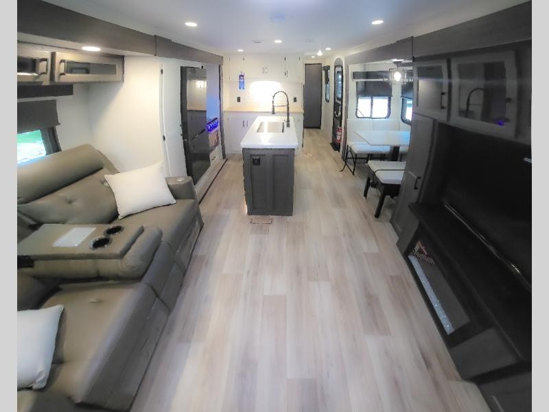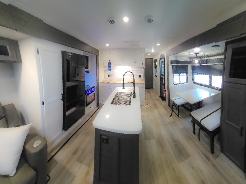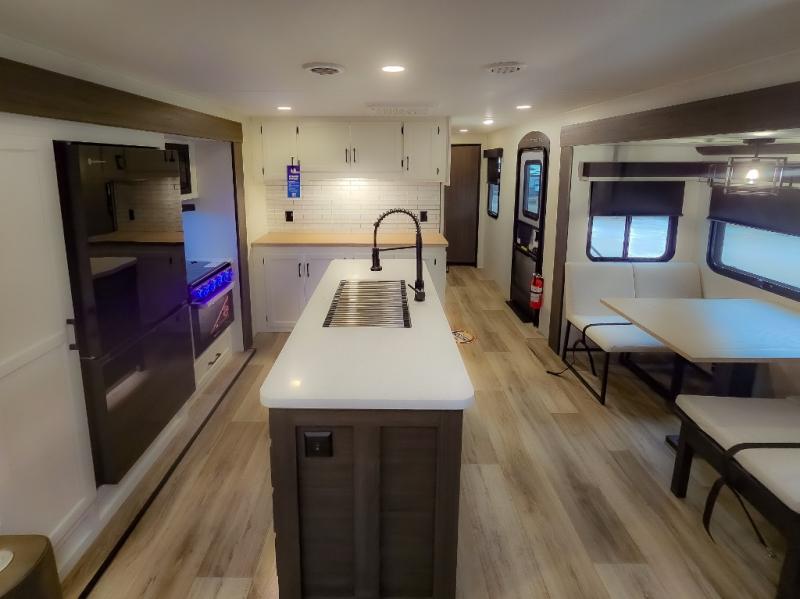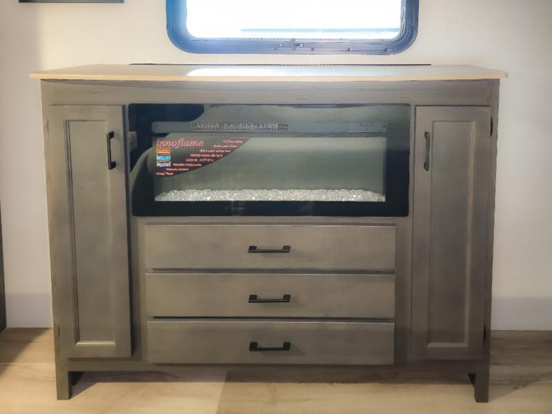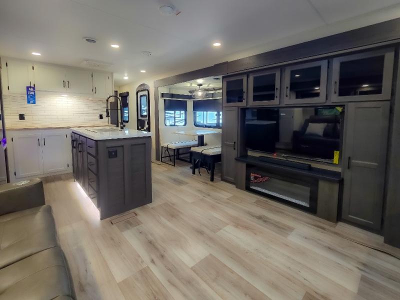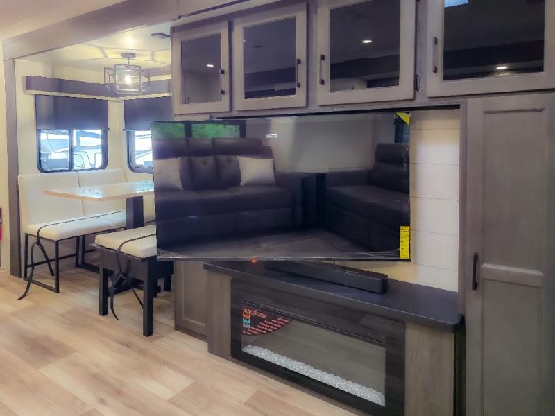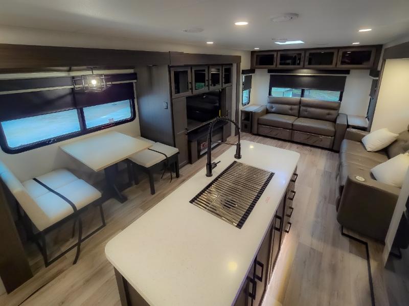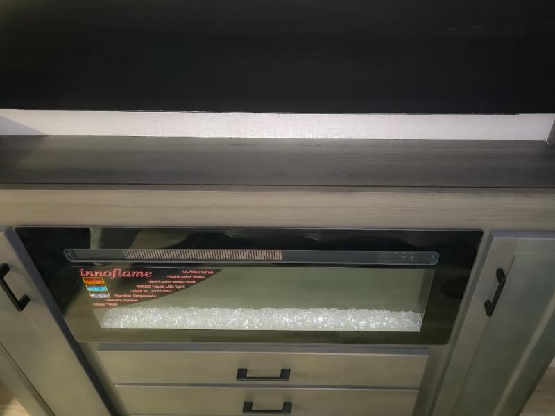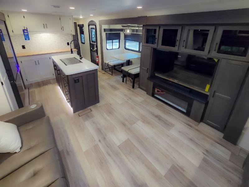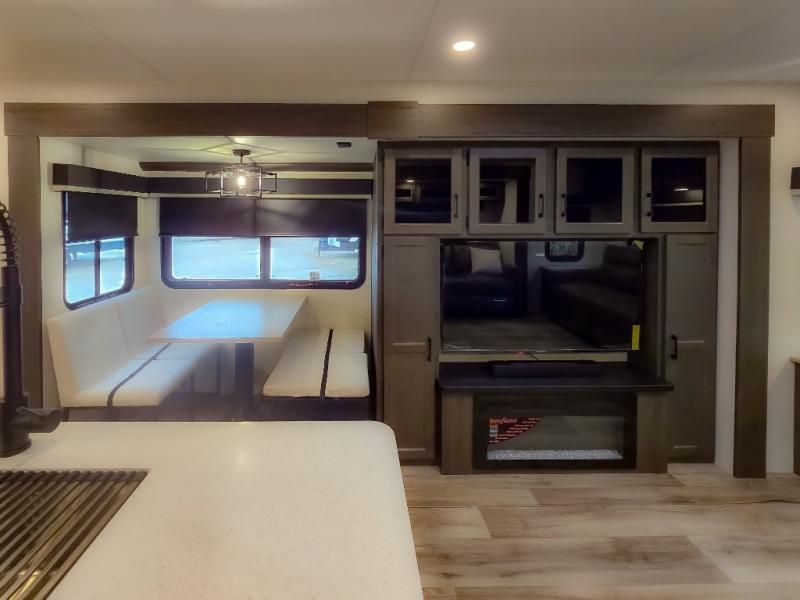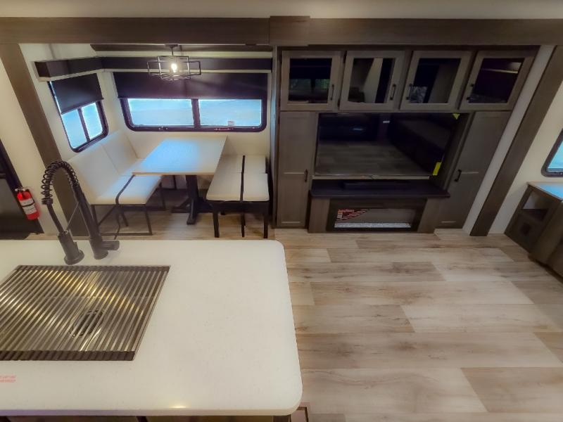 Pack your bags and hitch up this travel trailer for a great weekend camping trip! The front private bedroom has a 70" x 80" Sleep Tight king bed slide to lay your head at night, a dresser with a 30" frameless fireplace, a window seat with shelves on either side for your books, and a wardrobe with washer and dryer prep. Freshen up each morning in the full bathroom with the 30" x 36" shower then head to the kitchen to fry up some eggs on the three burner cooktop and pour a cold glass of orange juice stored in the 10 cu. ft. refrigerator. The kitchen island will make your meal prepping easier and the table and chairs offer a comfortable place to enjoy your meals or play card games. You could even cook your meals at the exterior campfire café and set up a table underneath one of the two power awnings!
