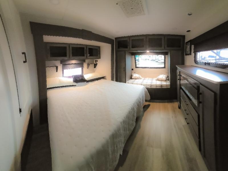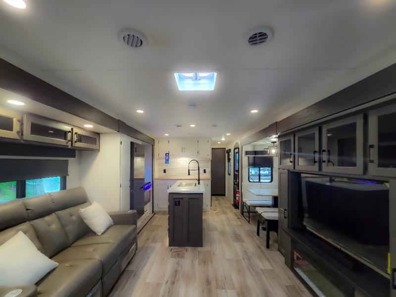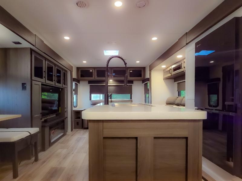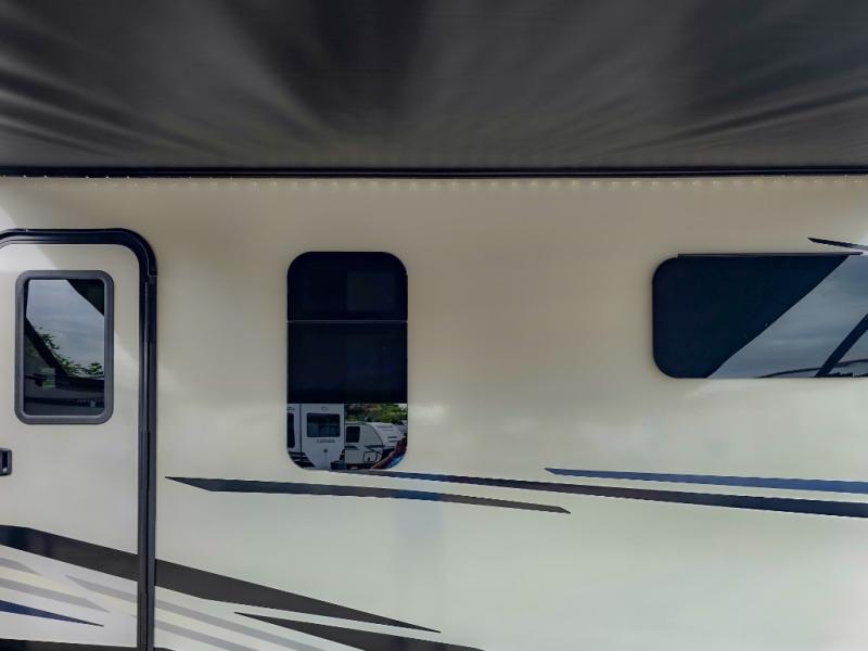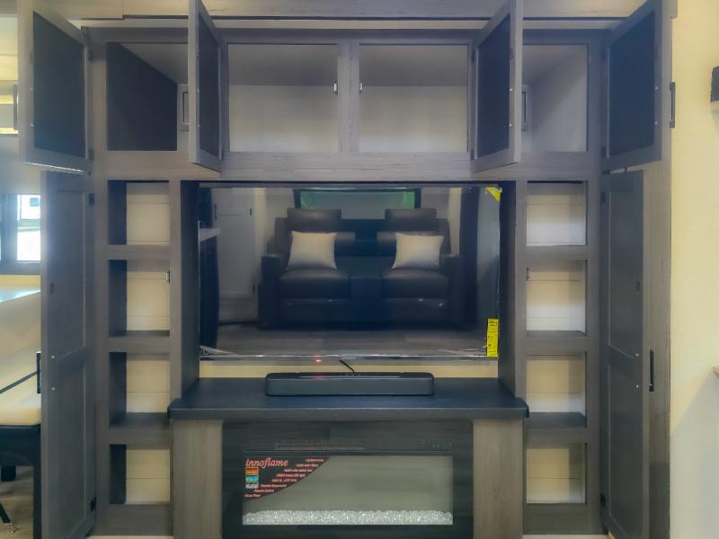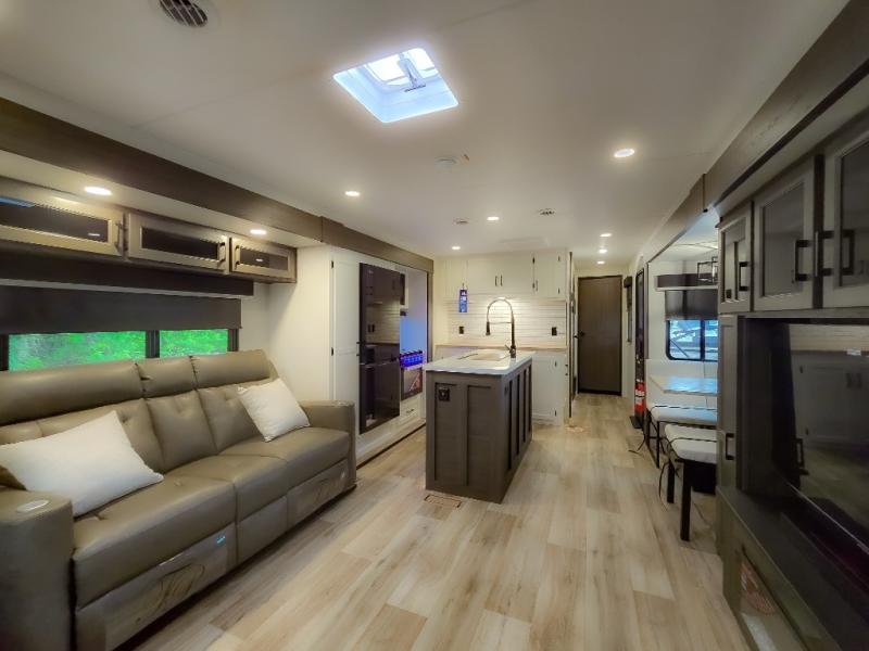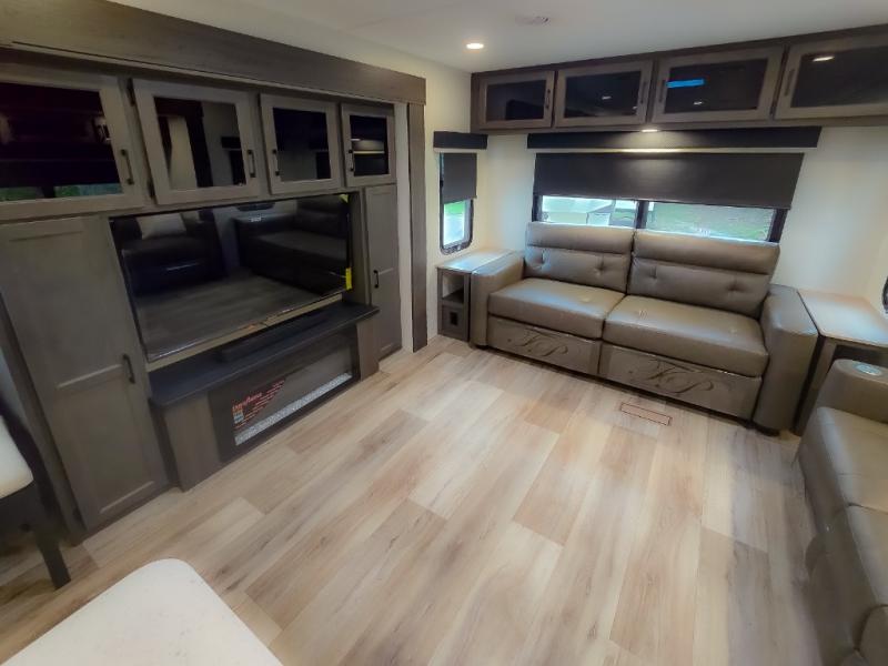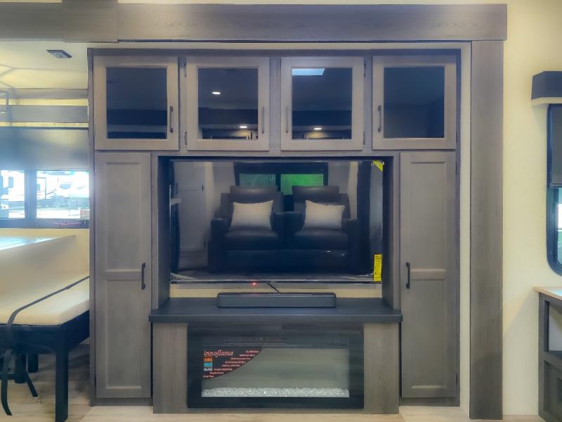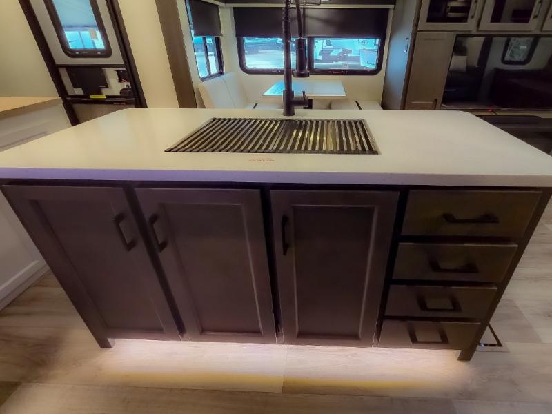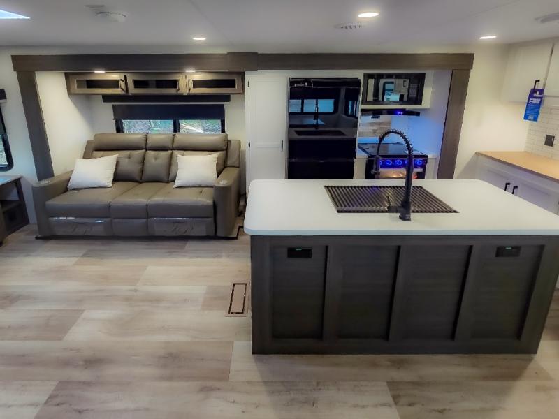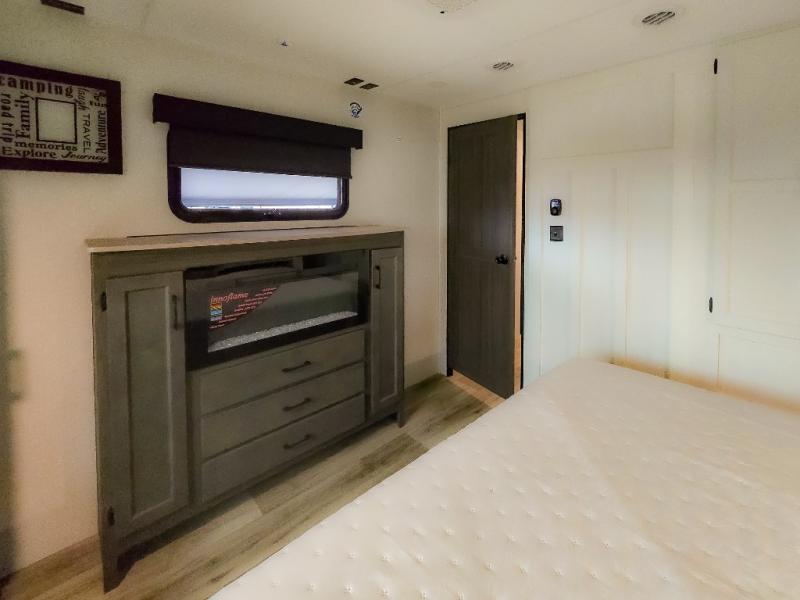 Pack your bags and hitch up this travel trailer for a great weekend camping trip! The front private bedroom has a 70" x 80" Sleep Tight king bed slide to lay your head at night, a dresser with a 30" frameless fireplace, a window seat with shelves on either side for your books, and a wardrobe with washer and dryer prep. Freshen up each morning in the full bathroom with the 30" x 36" shower then head to the kitchen to fry up some eggs on the three burner cooktop and pour a cold glass of orange juice stored in the 10 cu. ft. refrigerator. The kitchen island will make your meal prepping easier and the table and chairs offer a comfortable place to enjoy your meals or play card games. You could even cook your meals at the exterior campfire café and set up a table underneath one of the two power awnings!