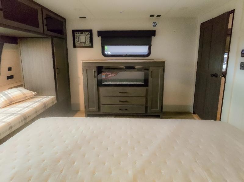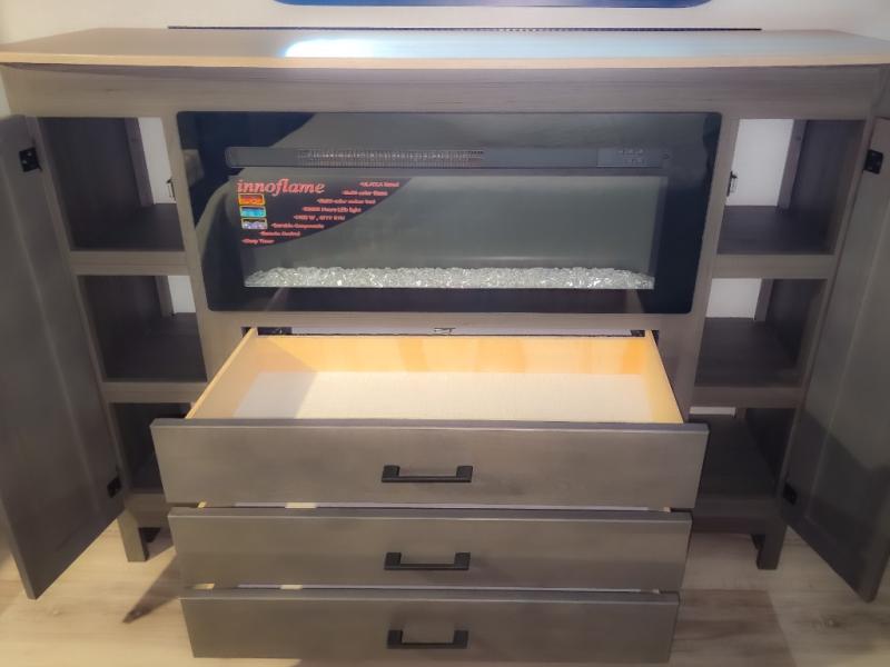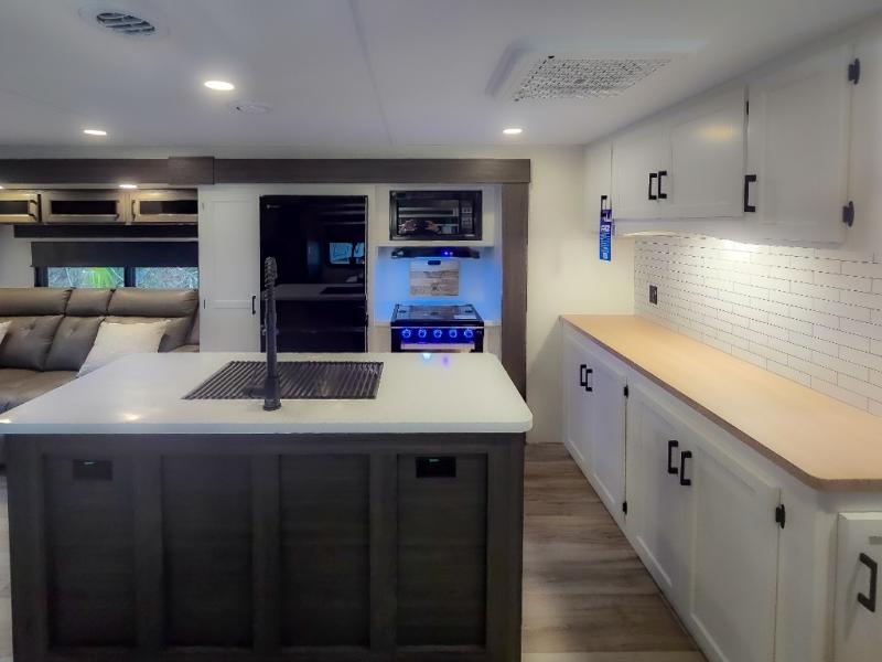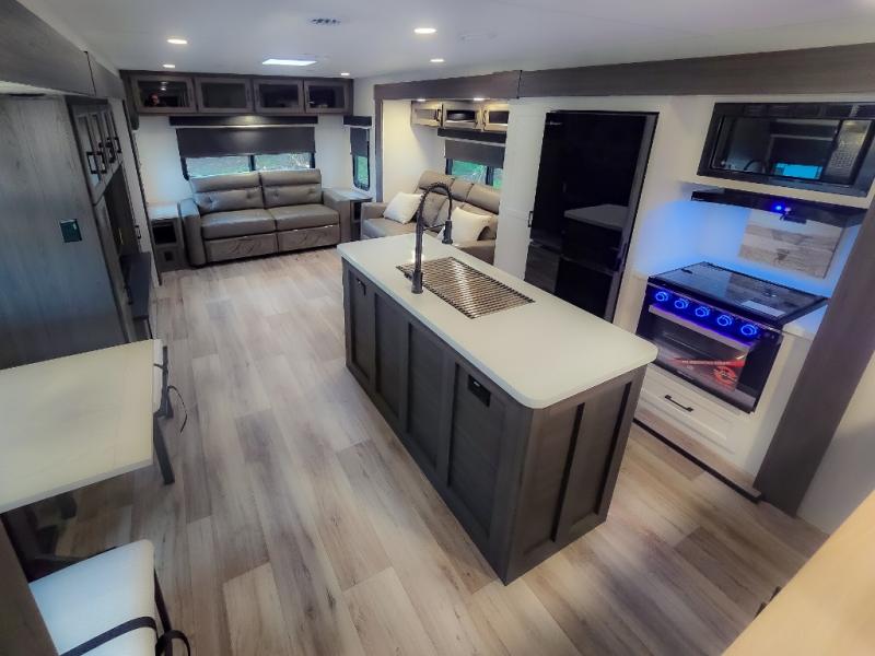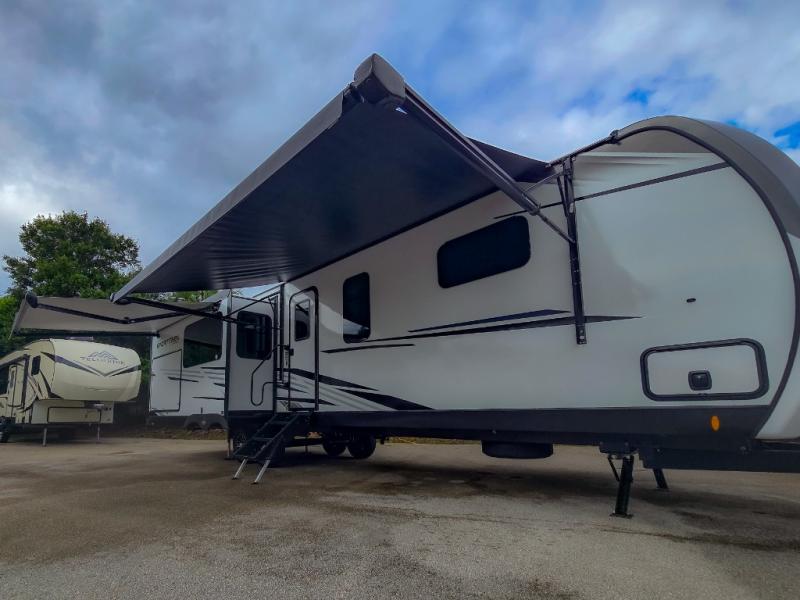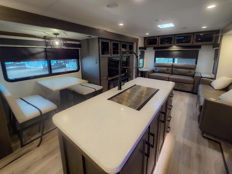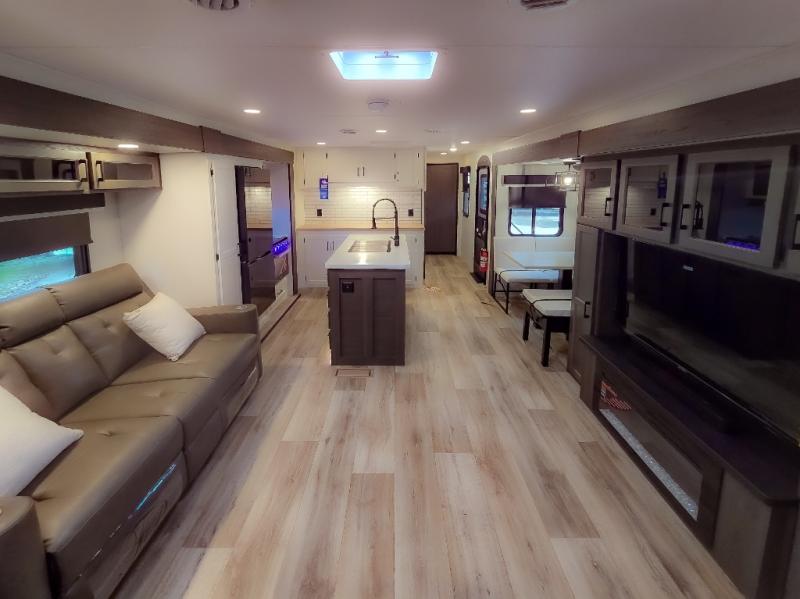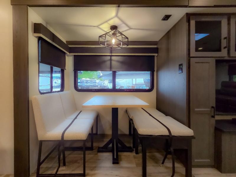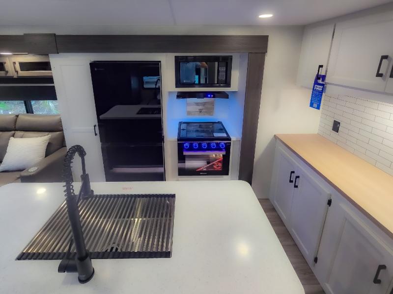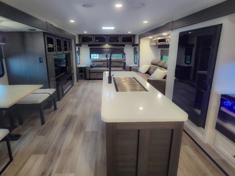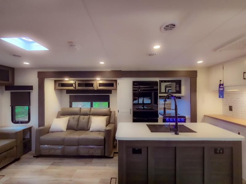 Pack your bags and hitch up this travel trailer for a great weekend camping trip! The front private bedroom has a 70" x 80" Sleep Tight king bed slide to lay your head at night, a dresser with a 30" frameless fireplace, a window seat with shelves on either side for your books, and a wardrobe with washer and dryer prep. Freshen up each morning in the full bathroom with the 30" x 36" shower then head to the kitchen to fry up some eggs on the three burner cooktop and pour a cold glass of orange juice stored in the 10 cu. ft. refrigerator. The kitchen island will make your meal prepping easier and the table and chairs offer a comfortable place to enjoy your meals or play card games. You could even cook your meals at the exterior campfire café and set up a table underneath one of the two power awnings!