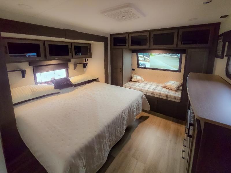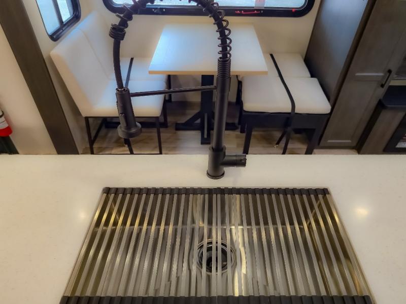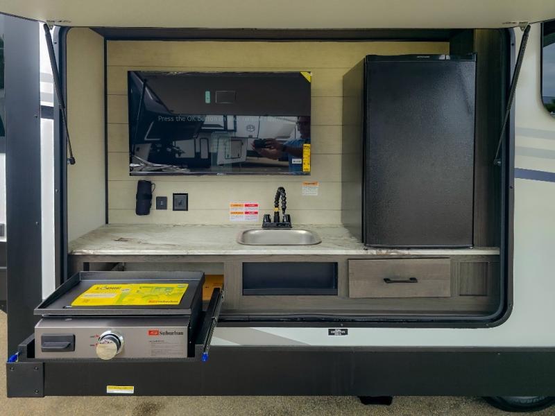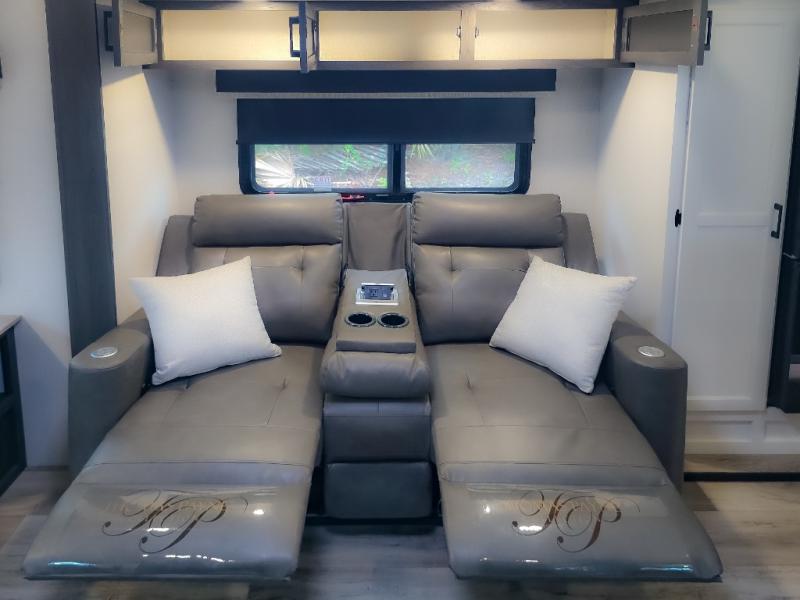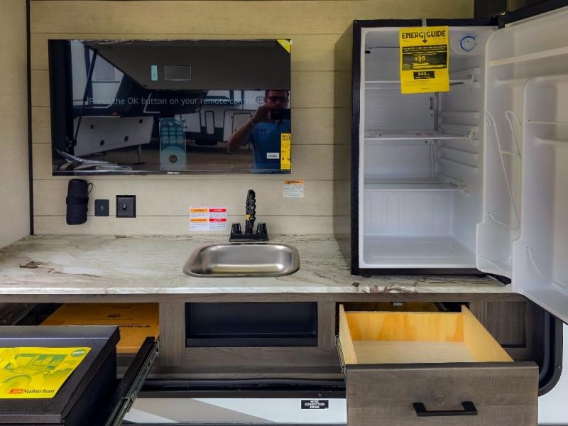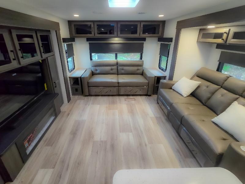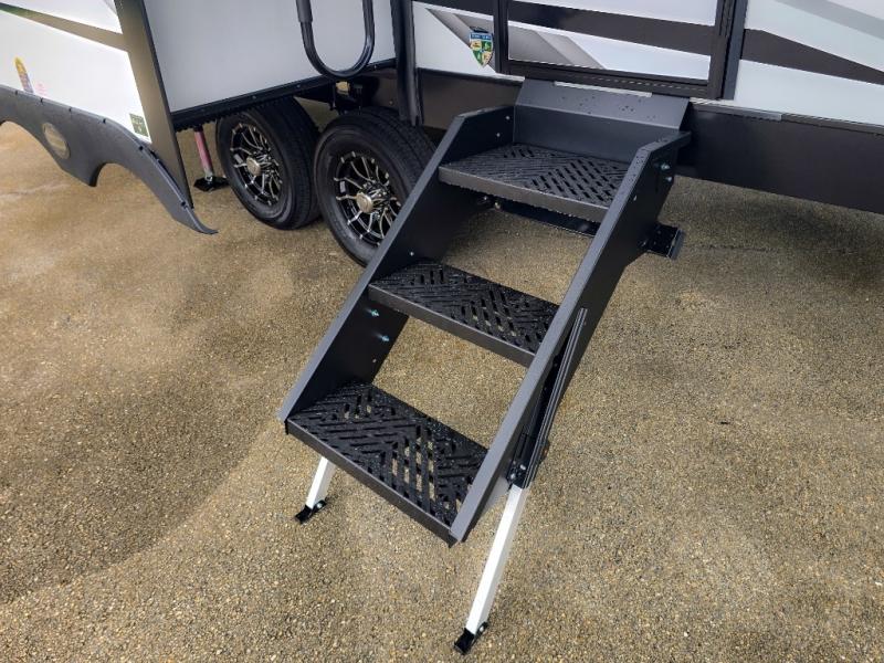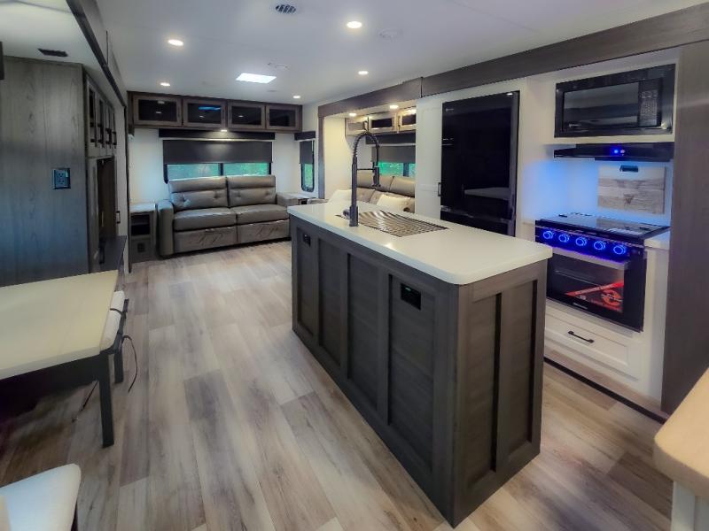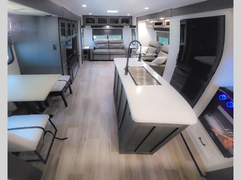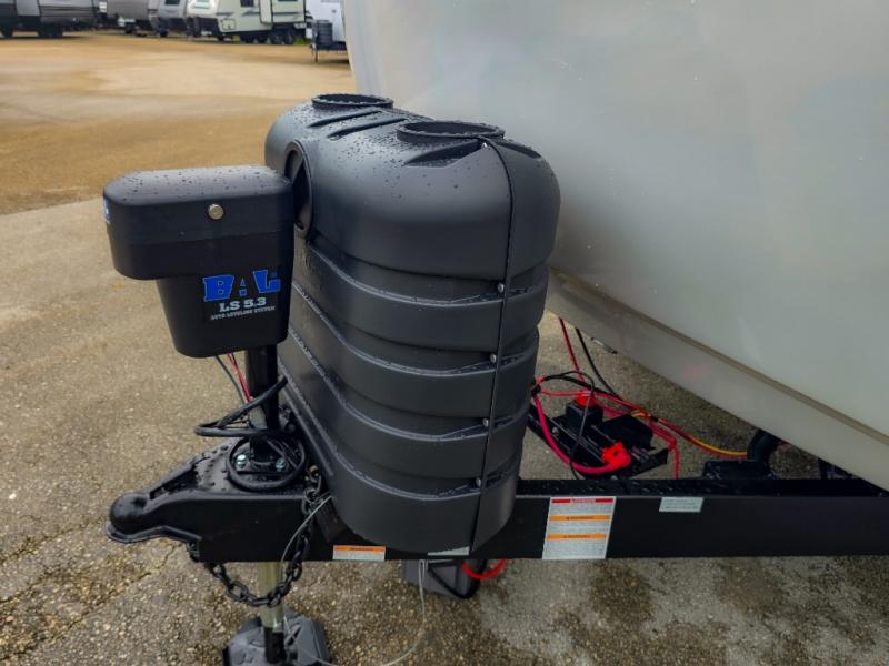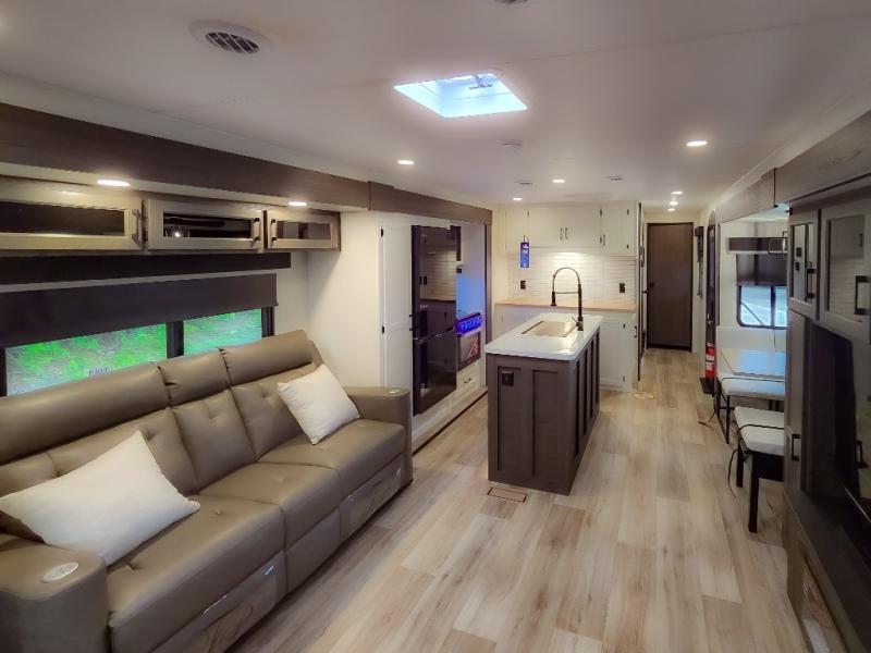 Pack your bags and hitch up this travel trailer for a great weekend camping trip! The front private bedroom has a 70" x 80" Sleep Tight king bed slide to lay your head at night, a dresser with a 30" frameless fireplace, a window seat with shelves on either side for your books, and a wardrobe with washer and dryer prep. Freshen up each morning in the full bathroom with the 30" x 36" shower then head to the kitchen to fry up some eggs on the three burner cooktop and pour a cold glass of orange juice stored in the 10 cu. ft. refrigerator. The kitchen island will make your meal prepping easier and the table and chairs offer a comfortable place to enjoy your meals or play card games. You could even cook your meals at the exterior campfire café and set up a table underneath one of the two power awnings!