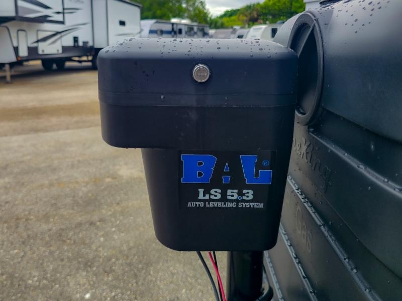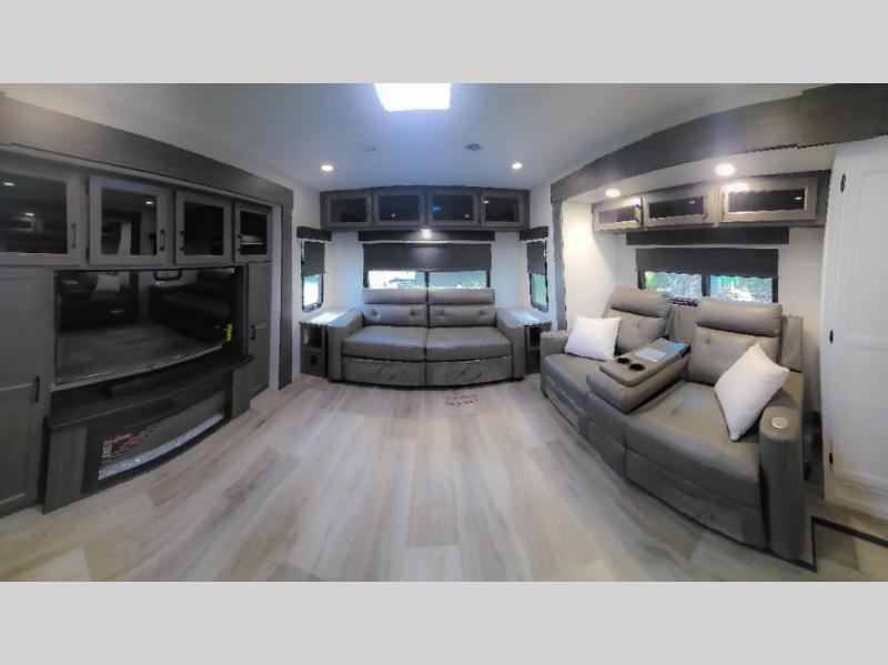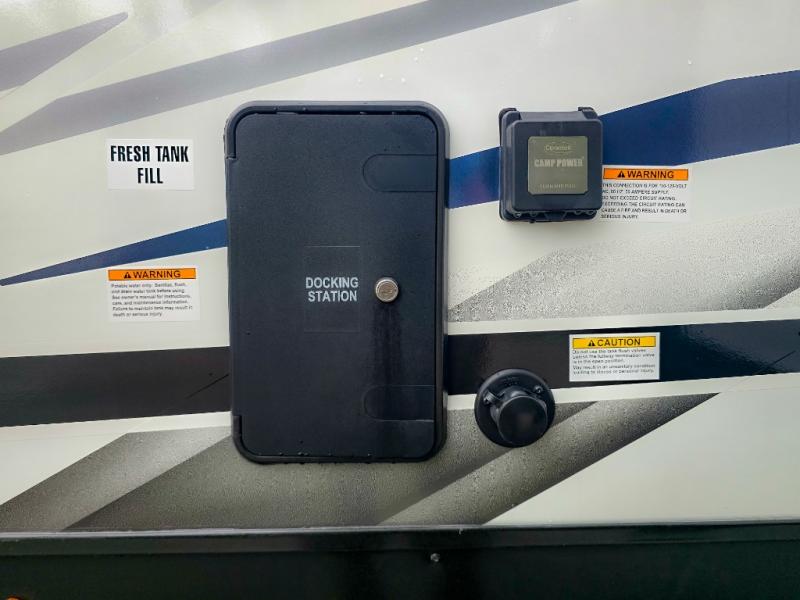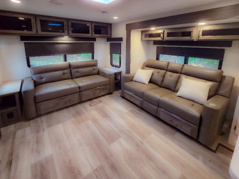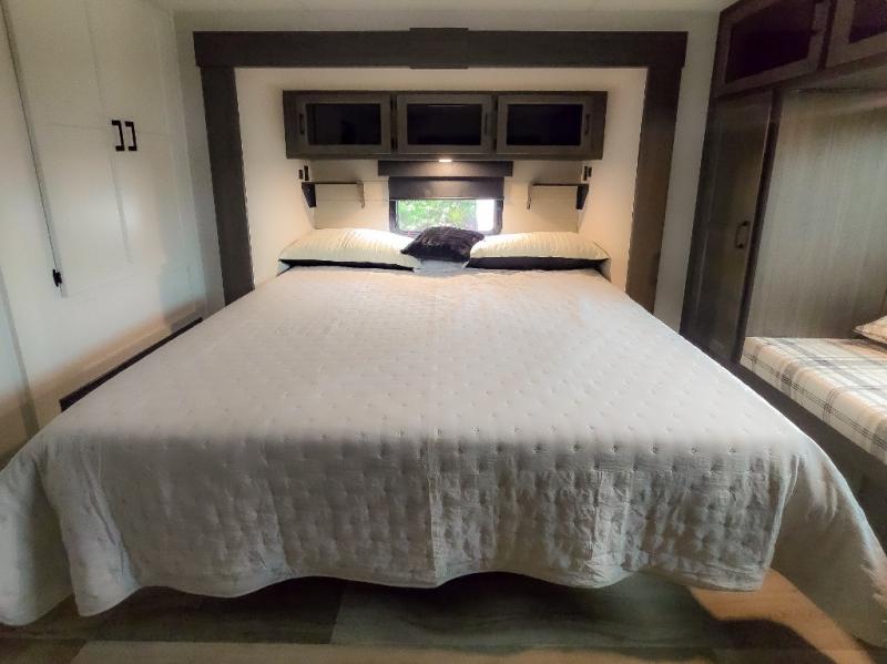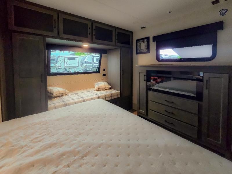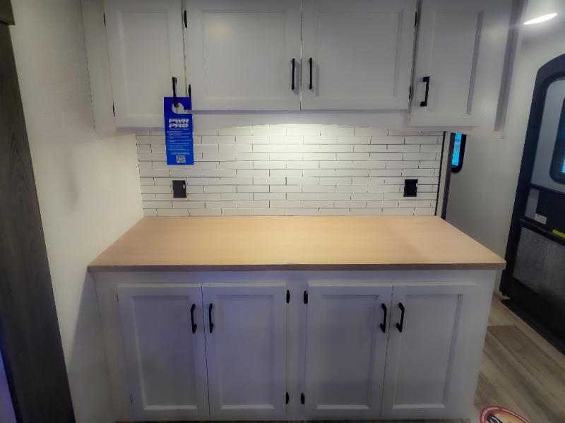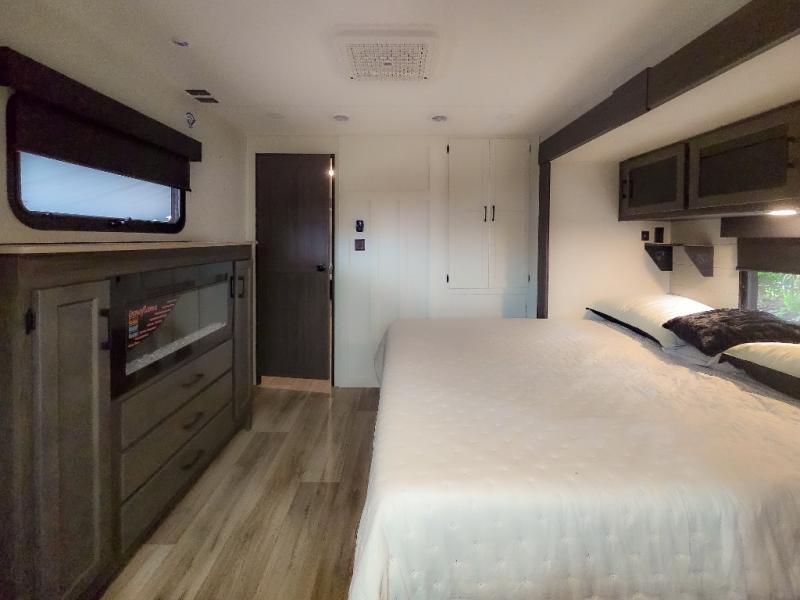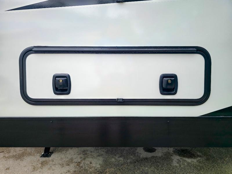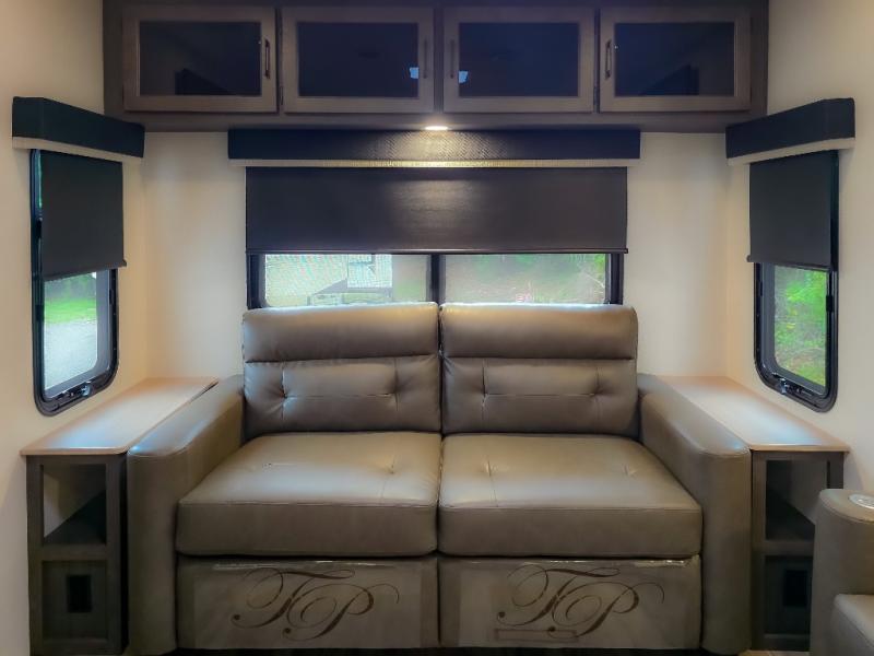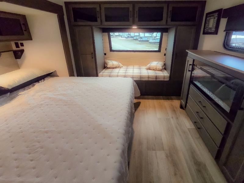 Pack your bags and hitch up this travel trailer for a great weekend camping trip! The front private bedroom has a 70" x 80" Sleep Tight king bed slide to lay your head at night, a dresser with a 30" frameless fireplace, a window seat with shelves on either side for your books, and a wardrobe with washer and dryer prep. Freshen up each morning in the full bathroom with the 30" x 36" shower then head to the kitchen to fry up some eggs on the three burner cooktop and pour a cold glass of orange juice stored in the 10 cu. ft. refrigerator. The kitchen island will make your meal prepping easier and the table and chairs offer a comfortable place to enjoy your meals or play card games. You could even cook your meals at the exterior campfire café and set up a table underneath one of the two power awnings!