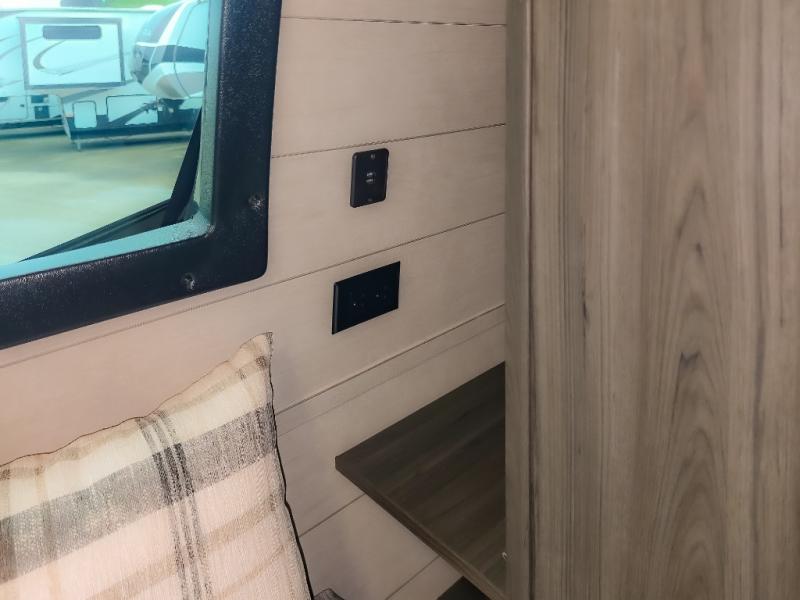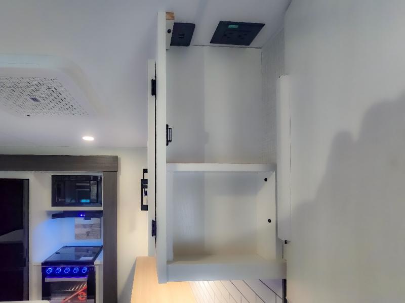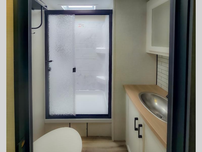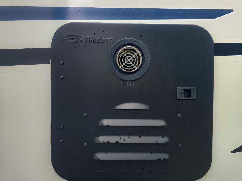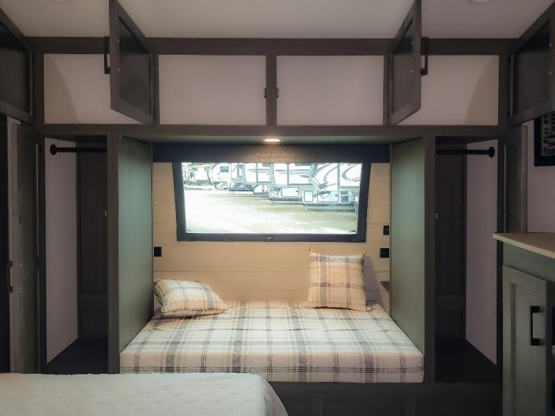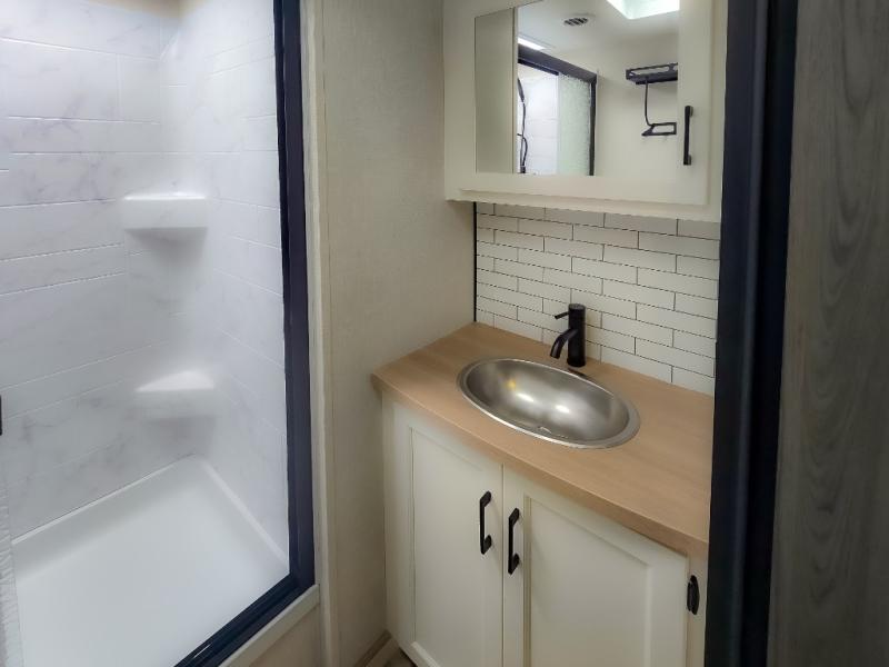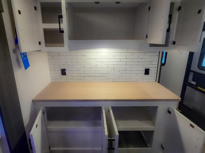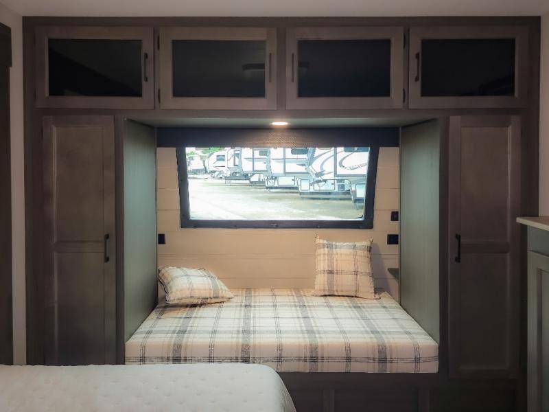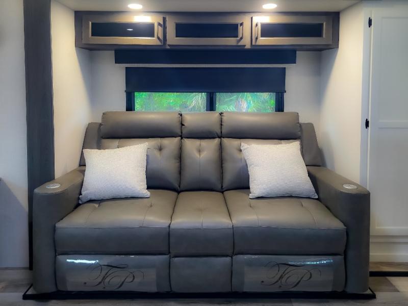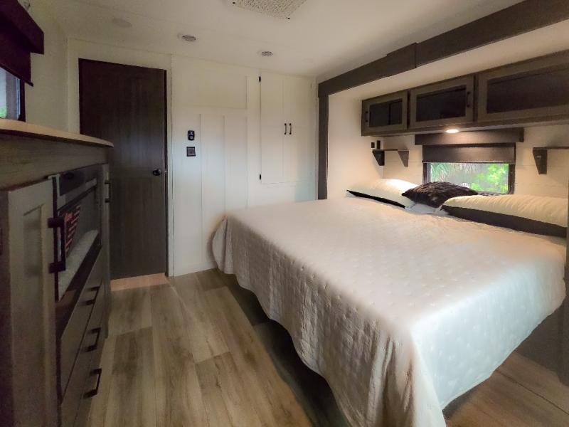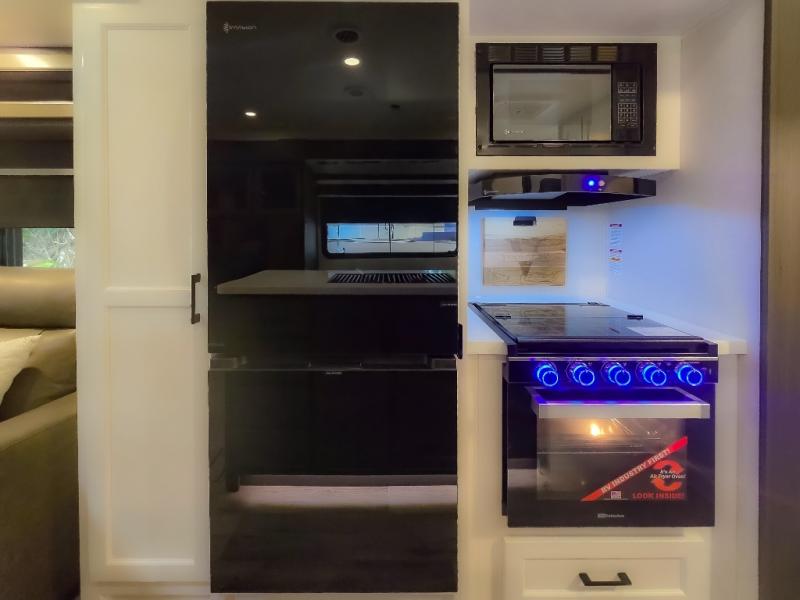 Pack your bags and hitch up this travel trailer for a great weekend camping trip! The front private bedroom has a 70" x 80" Sleep Tight king bed slide to lay your head at night, a dresser with a 30" frameless fireplace, a window seat with shelves on either side for your books, and a wardrobe with washer and dryer prep. Freshen up each morning in the full bathroom with the 30" x 36" shower then head to the kitchen to fry up some eggs on the three burner cooktop and pour a cold glass of orange juice stored in the 10 cu. ft. refrigerator. The kitchen island will make your meal prepping easier and the table and chairs offer a comfortable place to enjoy your meals or play card games. You could even cook your meals at the exterior campfire café and set up a table underneath one of the two power awnings!