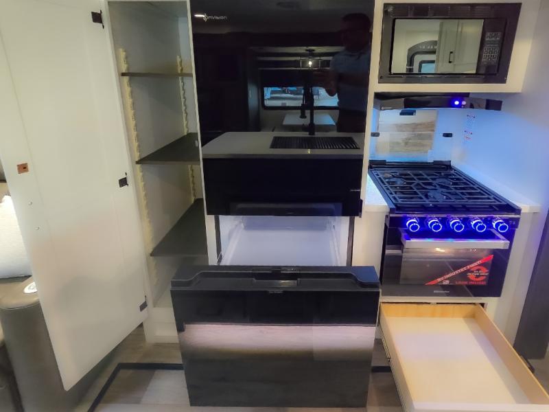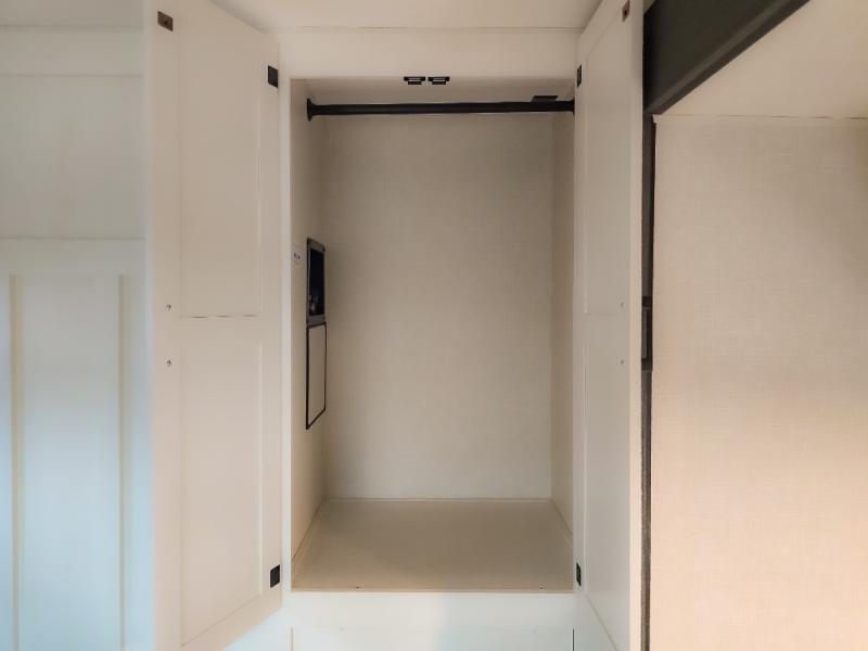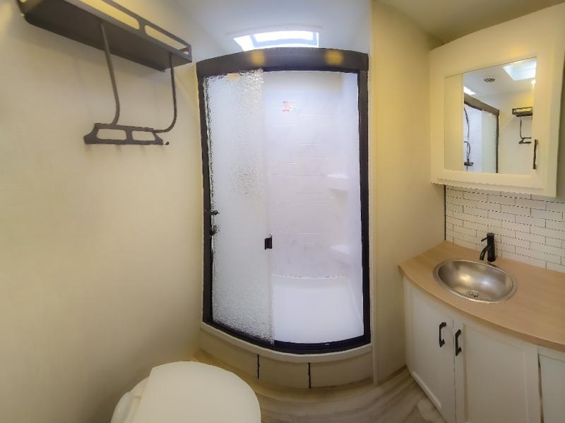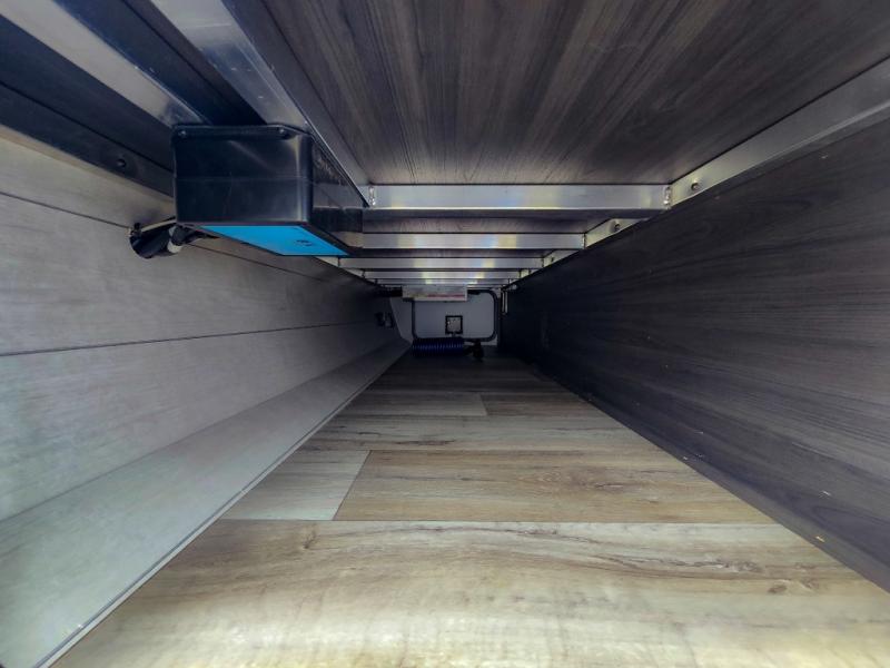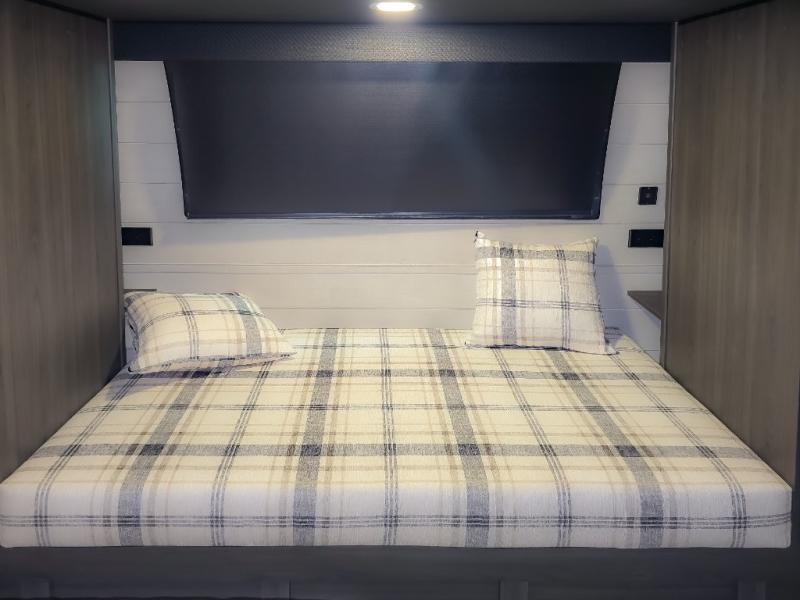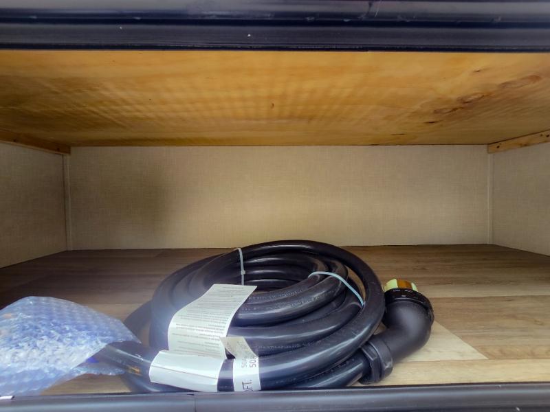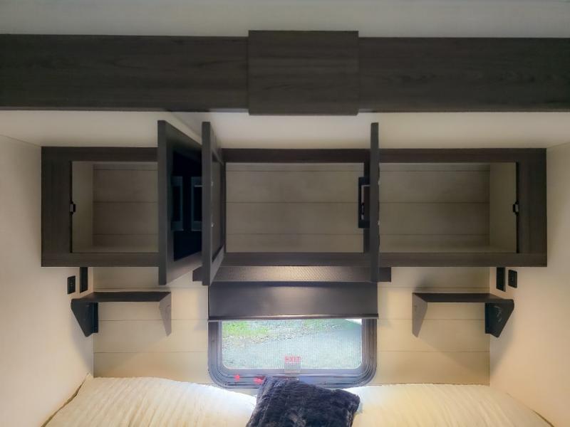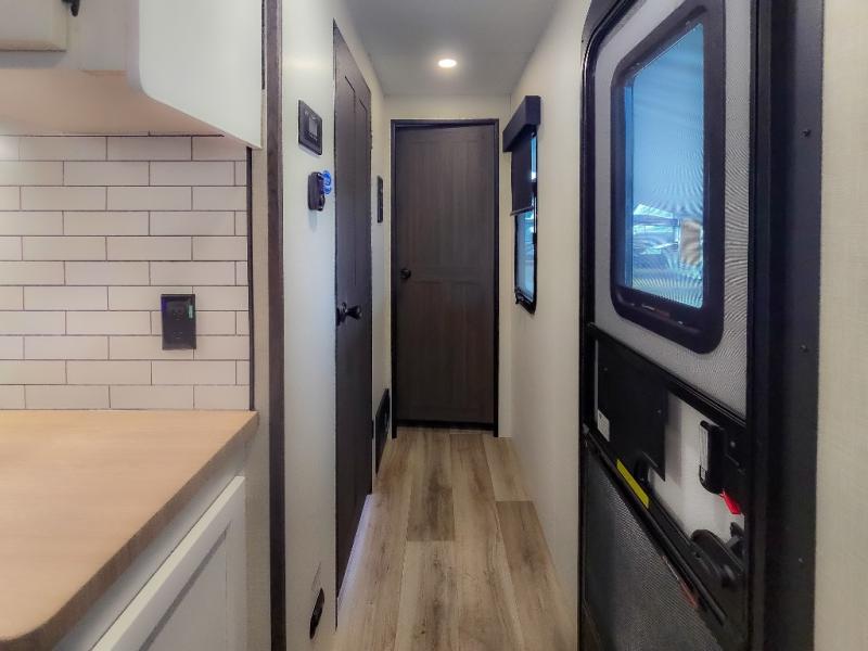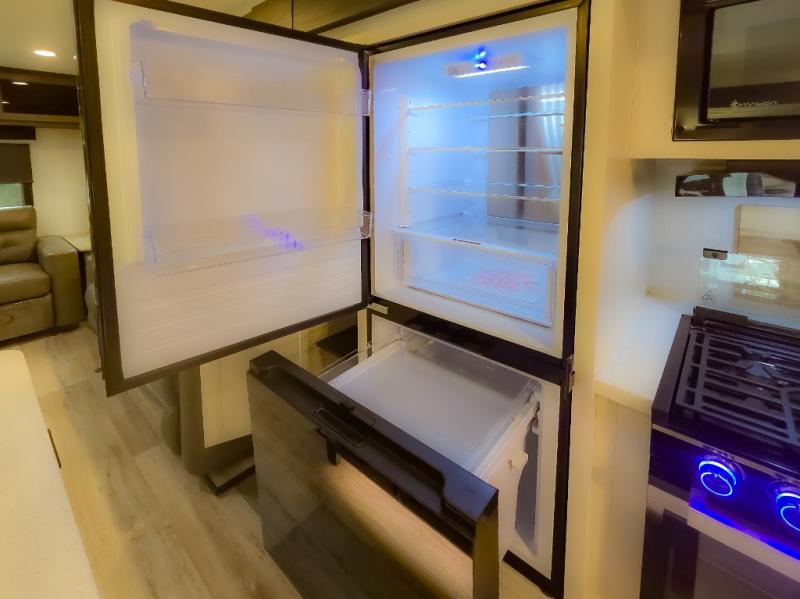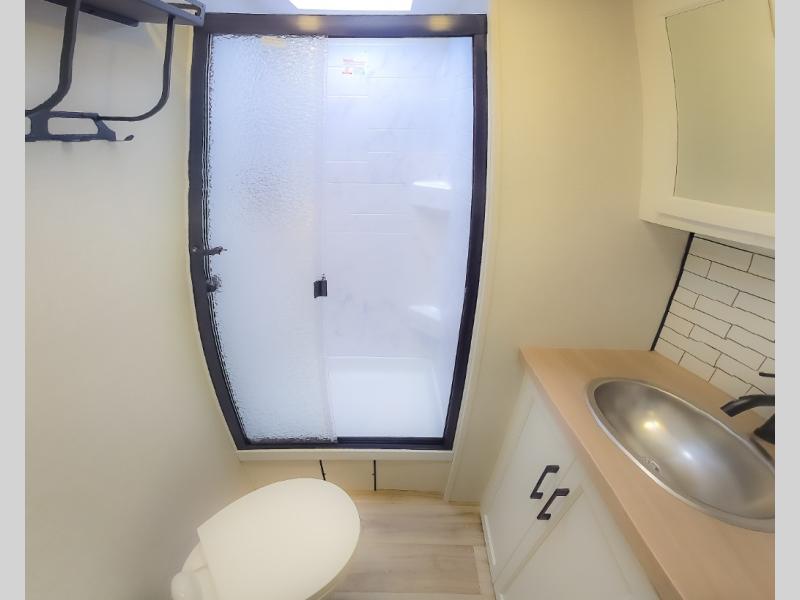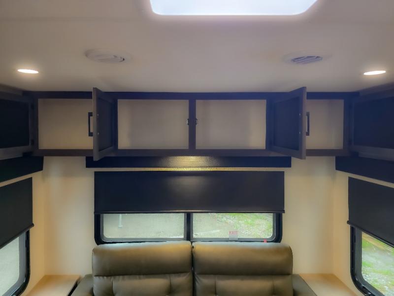 Pack your bags and hitch up this travel trailer for a great weekend camping trip! The front private bedroom has a 70" x 80" Sleep Tight king bed slide to lay your head at night, a dresser with a 30" frameless fireplace, a window seat with shelves on either side for your books, and a wardrobe with washer and dryer prep. Freshen up each morning in the full bathroom with the 30" x 36" shower then head to the kitchen to fry up some eggs on the three burner cooktop and pour a cold glass of orange juice stored in the 10 cu. ft. refrigerator. The kitchen island will make your meal prepping easier and the table and chairs offer a comfortable place to enjoy your meals or play card games. You could even cook your meals at the exterior campfire café and set up a table underneath one of the two power awnings!