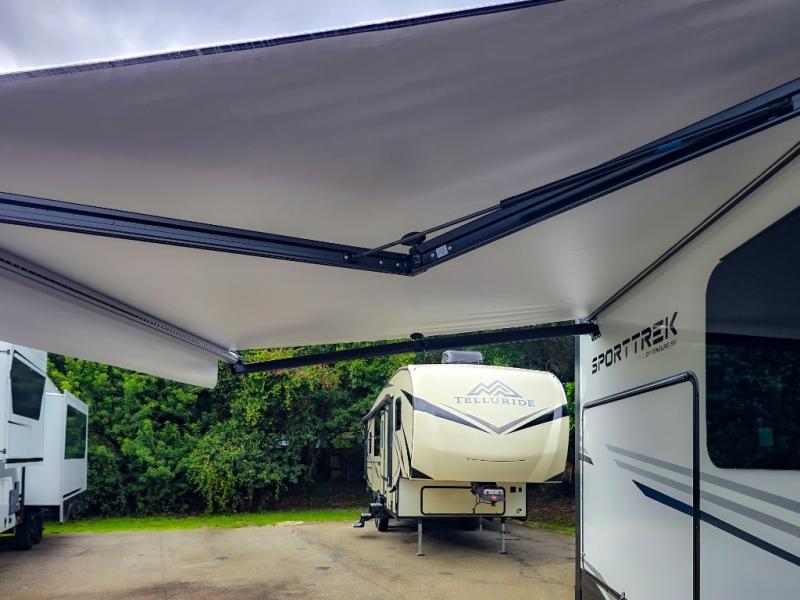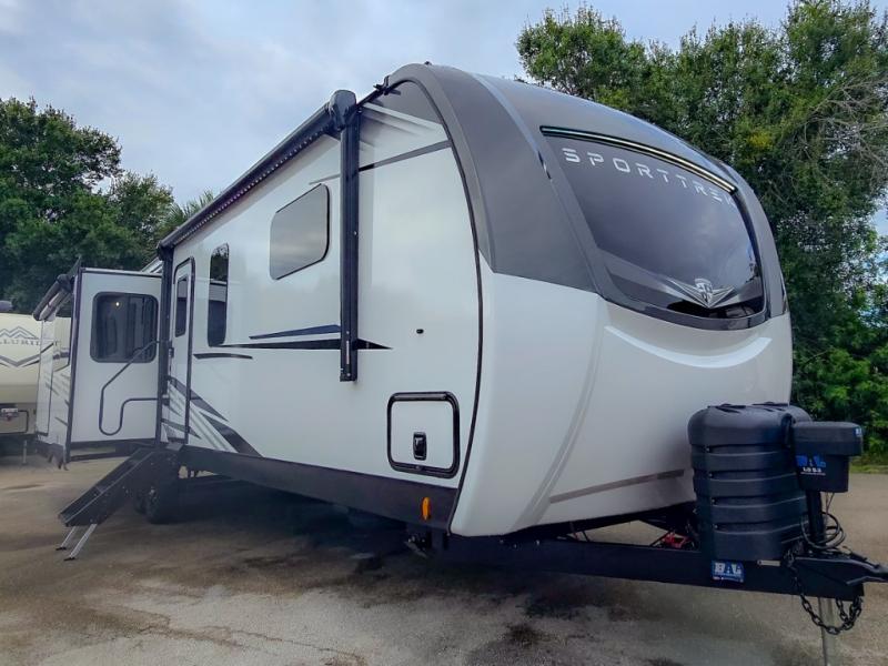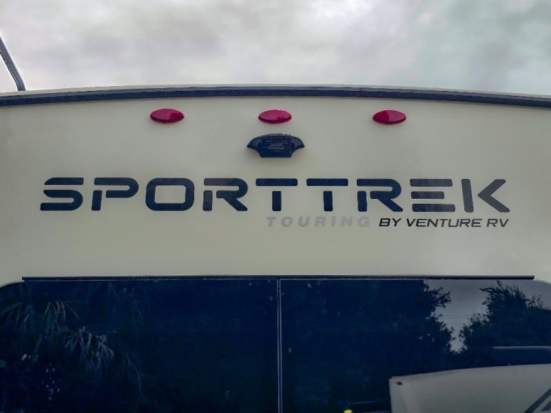 An elegant design and new features come with every one of these Venture RV SportTrek Touring Edition travel trailers! The NXG Huck bolt frame holds these units together and a walkable roof covers them. Heads will turn down the highway and at the campsite with an upgraded graphics package and a painted fiberglass front cap with integrated LED light. The exterior pass-through storage area has slam latch baggage doors with magnetic catches so you don't have to worry about them closing on you and a motion activated light to see your items clearly even at night. Luxury abounds throughout these units, especially with the mandatory Interior Luxury package which comes solid surface kitchen countertops, designer valances with fabric nightshades, two 30" frameless fireplaces, and Beauflor wood plank flooring that is easy to clean. Come find your favorite model today!
