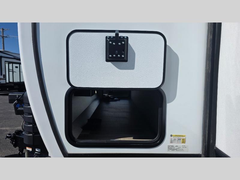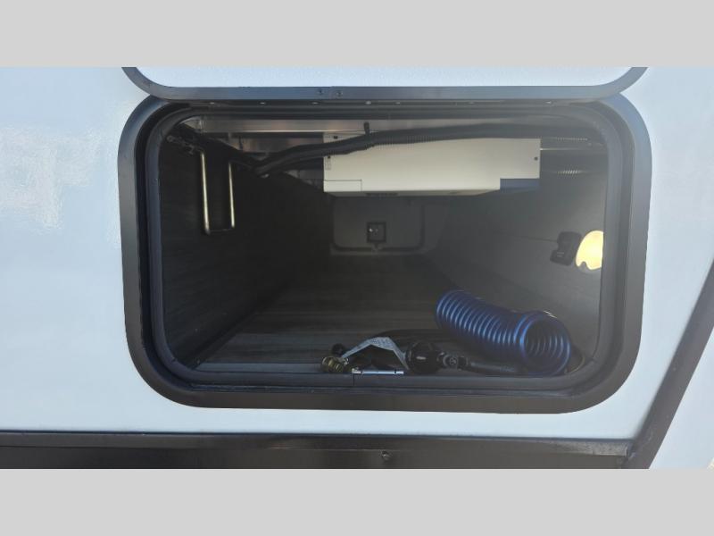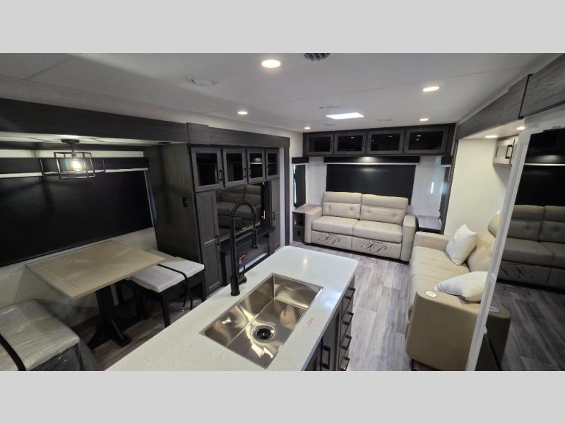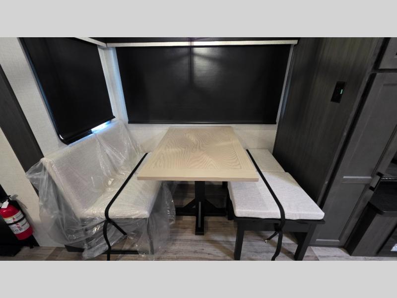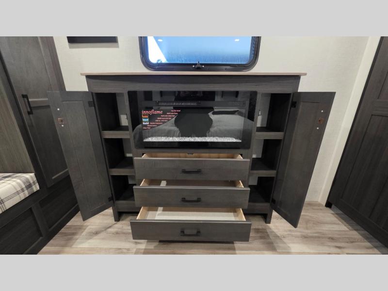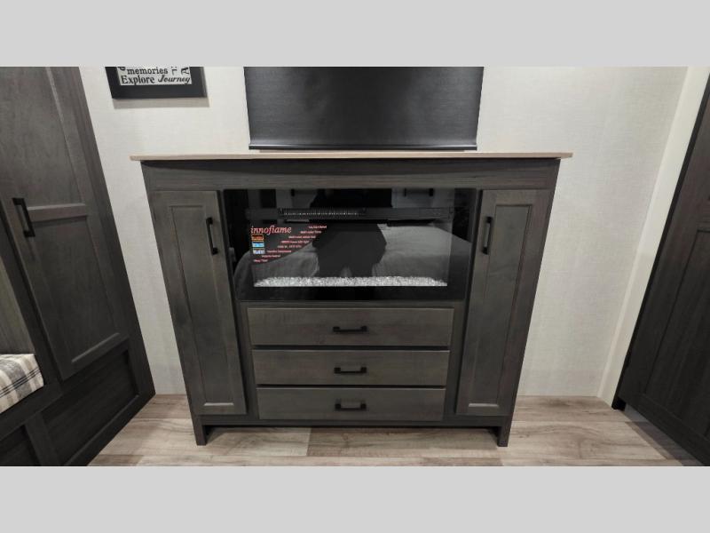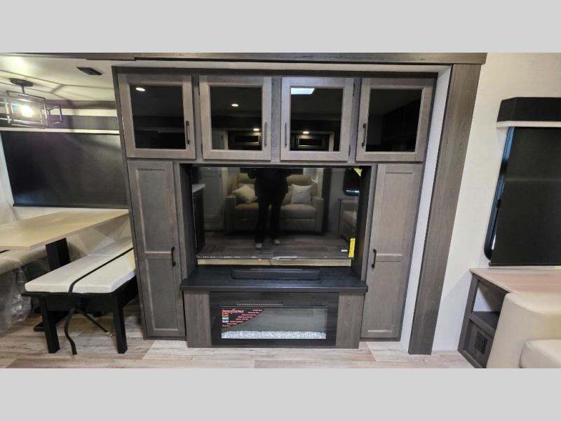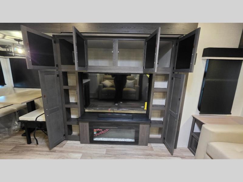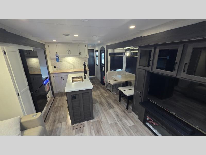 Pack your bags and hitch up this travel trailer for a great weekend camping trip! The front private bedroom has a 70" x 80" Sleep Tight king bed slide to lay your head at night, a dresser with a 30" frameless fireplace, a window seat with shelves on either side for your books, and a wardrobe with washer and dryer prep. Freshen up each morning in the full bathroom with the 30" x 36" shower then head to the kitchen to fry up some eggs on the three burner cooktop and pour a cold glass of orange juice stored in the 10 cu. ft. refrigerator. The kitchen island will make your meal prepping easier and the table and chairs offer a comfortable place to enjoy your meals or play card games. You could even cook your meals at the exterior campfire café and set up a table underneath one of the two power awnings!
