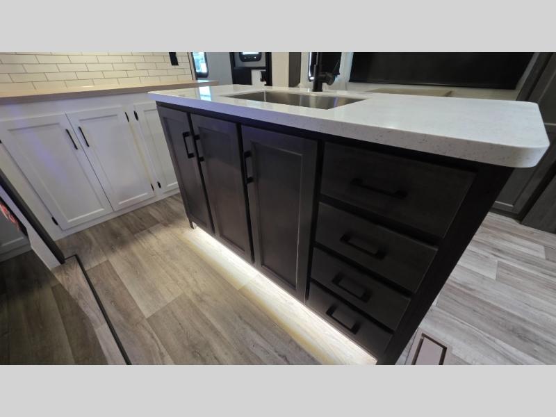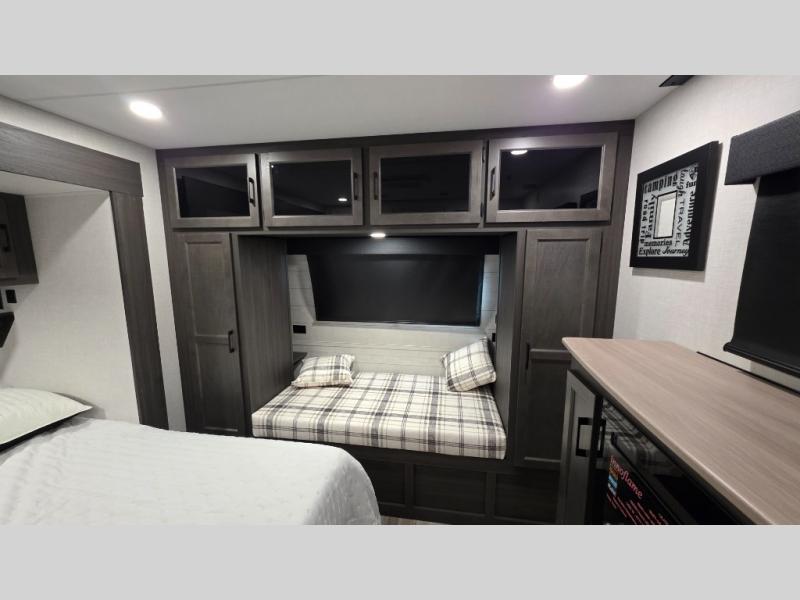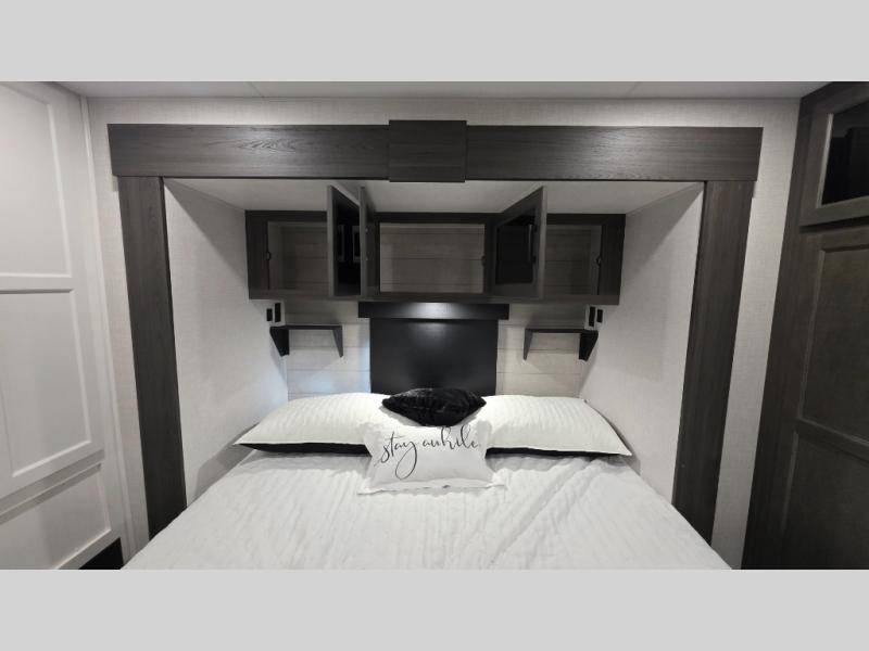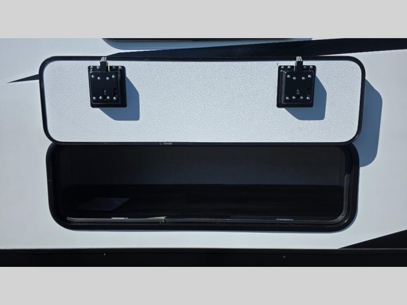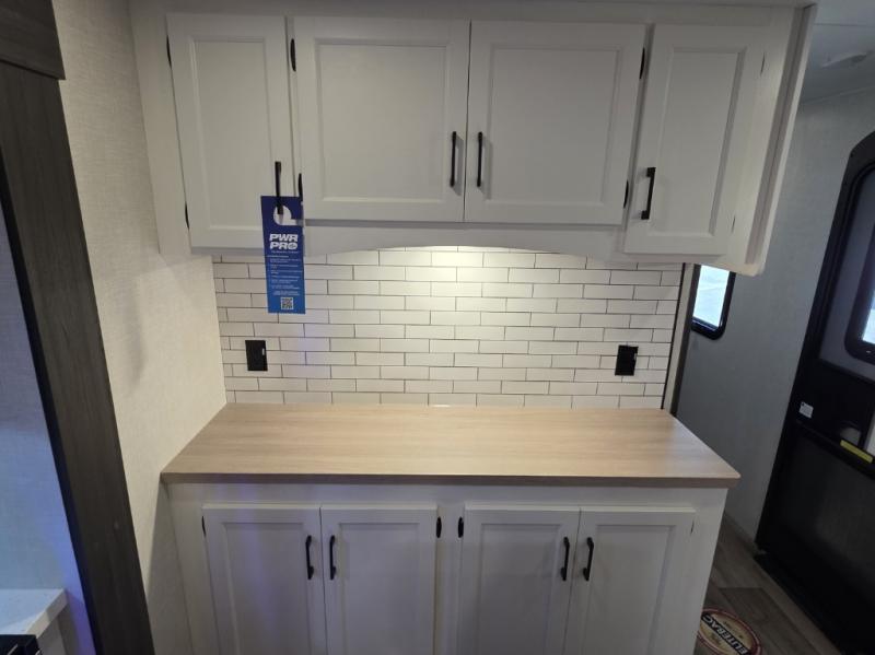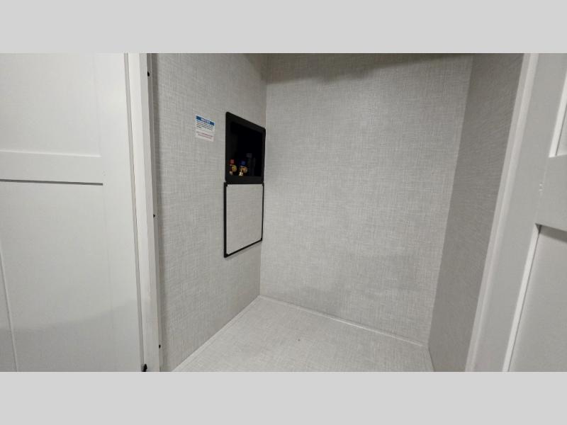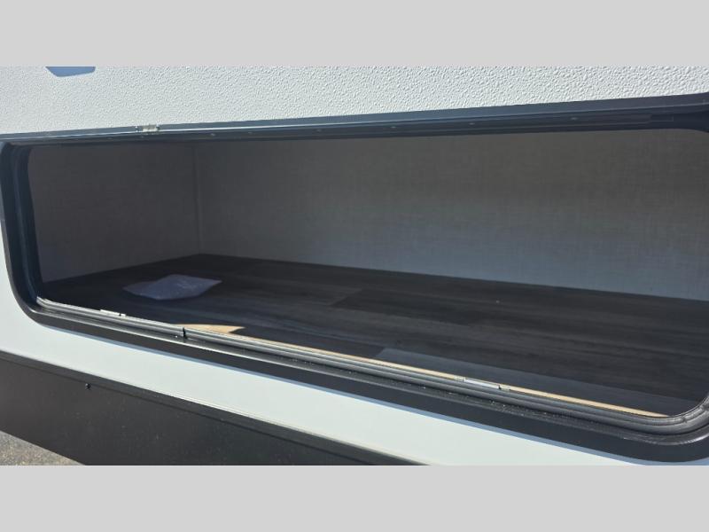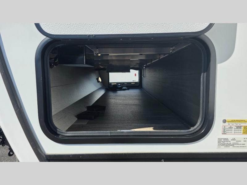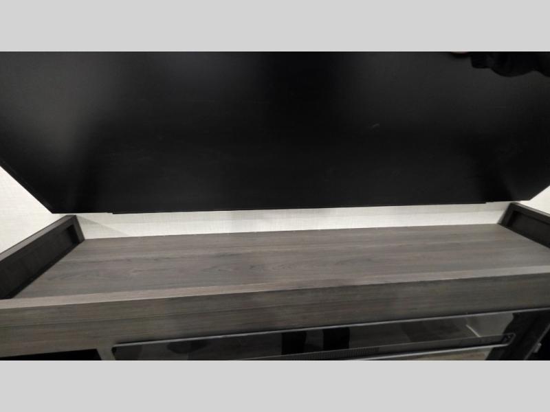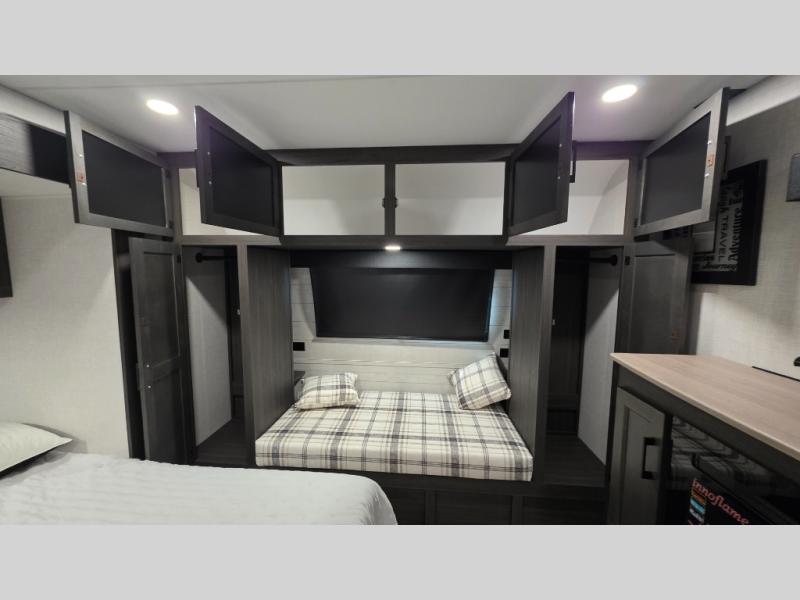 Pack your bags and hitch up this travel trailer for a great weekend camping trip! The front private bedroom has a 70" x 80" Sleep Tight king bed slide to lay your head at night, a dresser with a 30" frameless fireplace, a window seat with shelves on either side for your books, and a wardrobe with washer and dryer prep. Freshen up each morning in the full bathroom with the 30" x 36" shower then head to the kitchen to fry up some eggs on the three burner cooktop and pour a cold glass of orange juice stored in the 10 cu. ft. refrigerator. The kitchen island will make your meal prepping easier and the table and chairs offer a comfortable place to enjoy your meals or play card games. You could even cook your meals at the exterior campfire café and set up a table underneath one of the two power awnings!