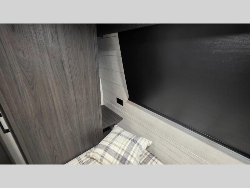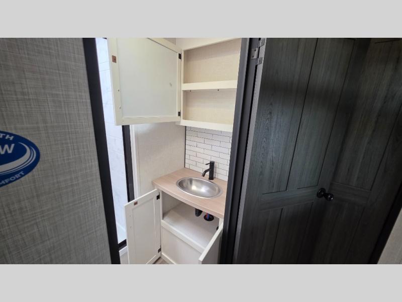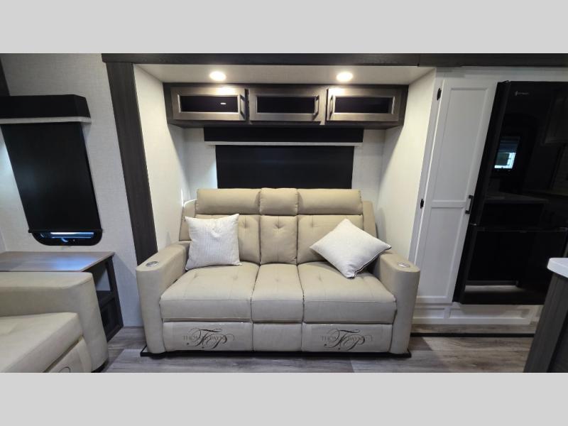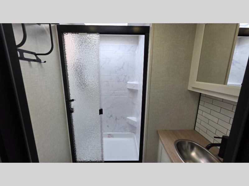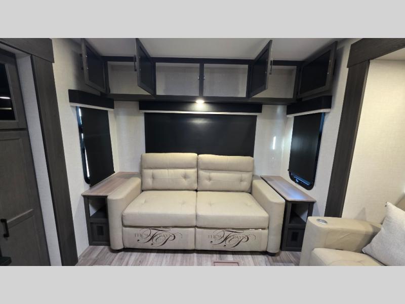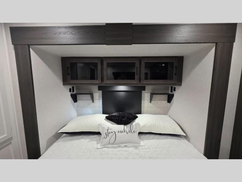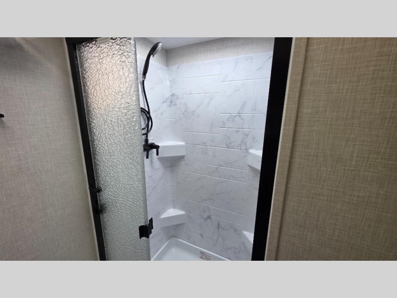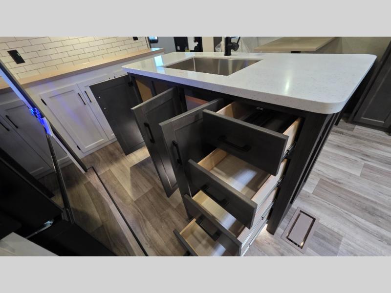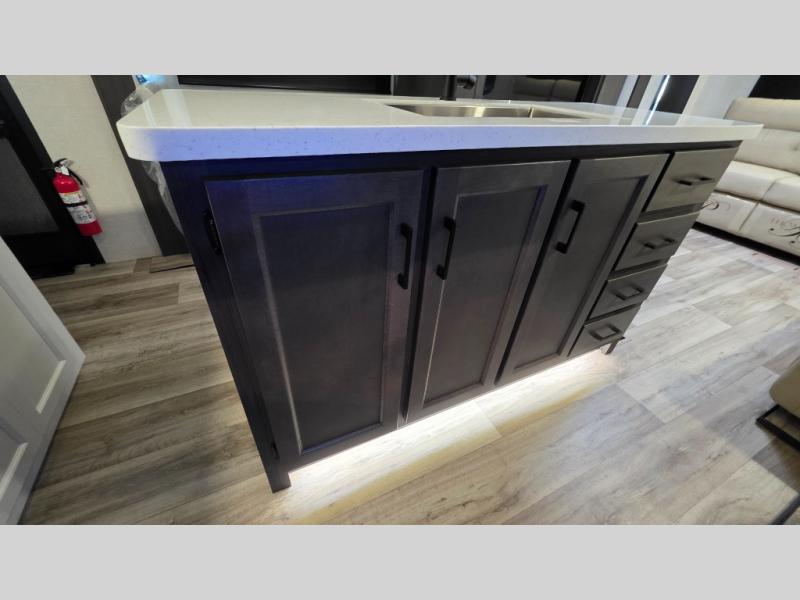 Pack your bags and hitch up this travel trailer for a great weekend camping trip! The front private bedroom has a 70" x 80" Sleep Tight king bed slide to lay your head at night, a dresser with a 30" frameless fireplace, a window seat with shelves on either side for your books, and a wardrobe with washer and dryer prep. Freshen up each morning in the full bathroom with the 30" x 36" shower then head to the kitchen to fry up some eggs on the three burner cooktop and pour a cold glass of orange juice stored in the 10 cu. ft. refrigerator. The kitchen island will make your meal prepping easier and the table and chairs offer a comfortable place to enjoy your meals or play card games. You could even cook your meals at the exterior campfire café and set up a table underneath one of the two power awnings!