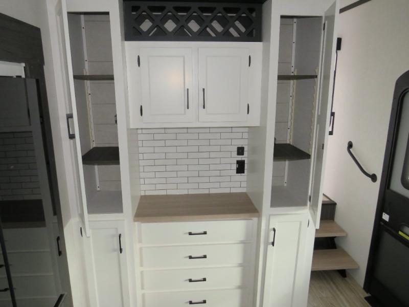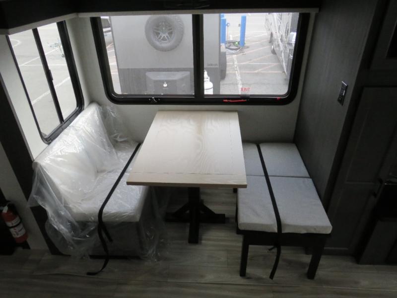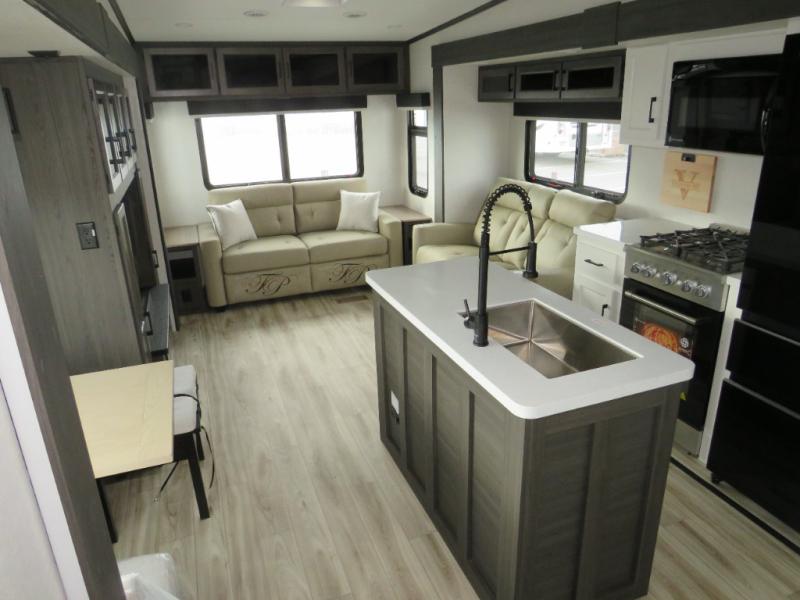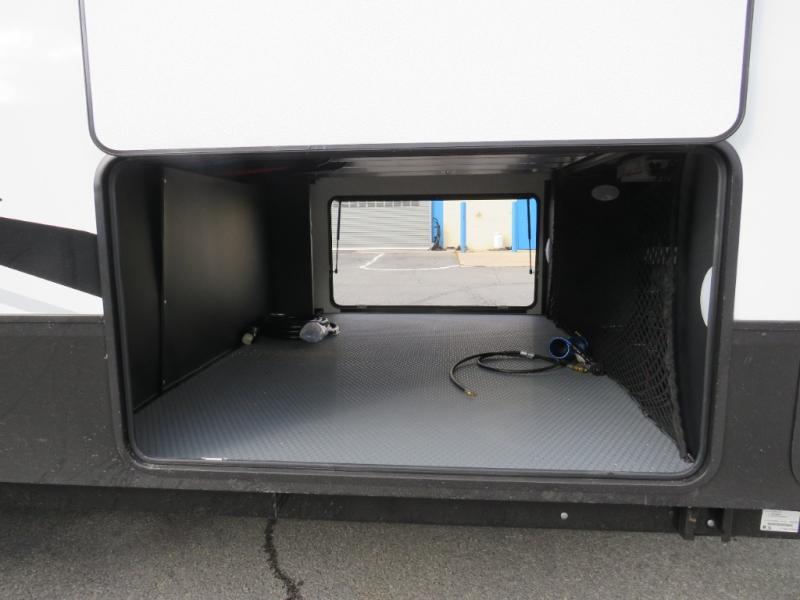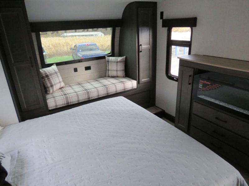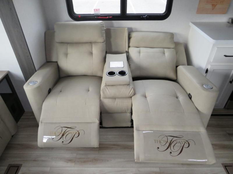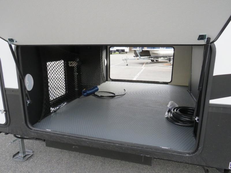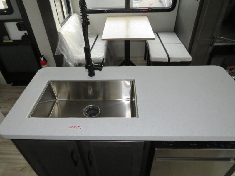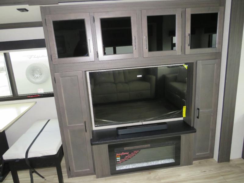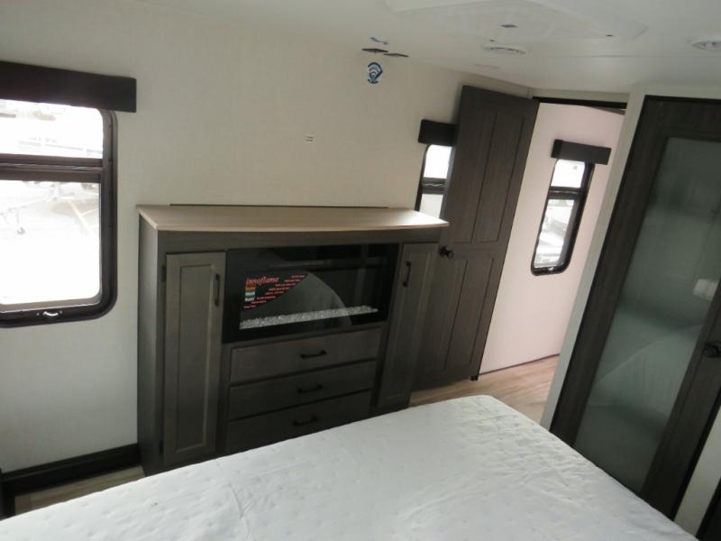 You won't even feel like you're camping in this fifth wheel! The front private bedroom has a Serta king mattress to lay your head on at night, a window seat to comfortably read a book while enjoying the 5,000 BTU fireplace, a shelf storage closet, and a prepped area for a washer and dryer. Freshen up each morning with the 48" fiberglass shower in the full bathroom then head down the floating steps with shoe storage to whip up a delicious breakfast. The fully equipped kitchen even comes with a 18" GE stainless steel dishwasher at the kitchen island for easy clean up. Enjoy your meals at the table with two chairs and two Versa benches. You could even cook at the outside campfire cafe with the griddle. Inside the rear living area, you will find a 70" tri-fold sofa with end tables and theater seating with USB charging across from the entertainment center with a 5,000 BTU fireplace!